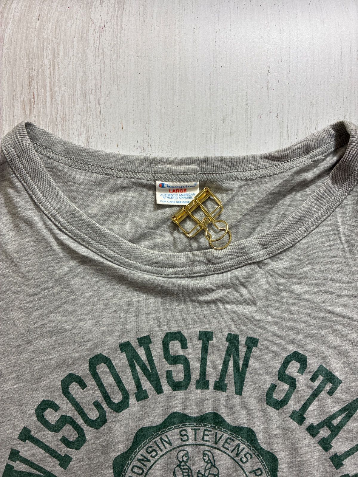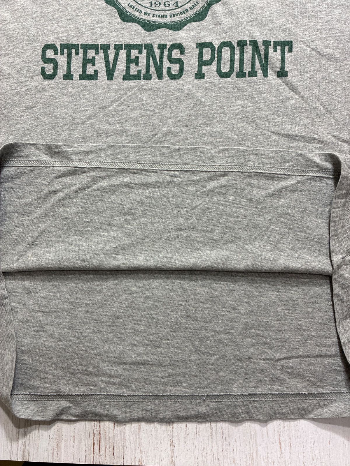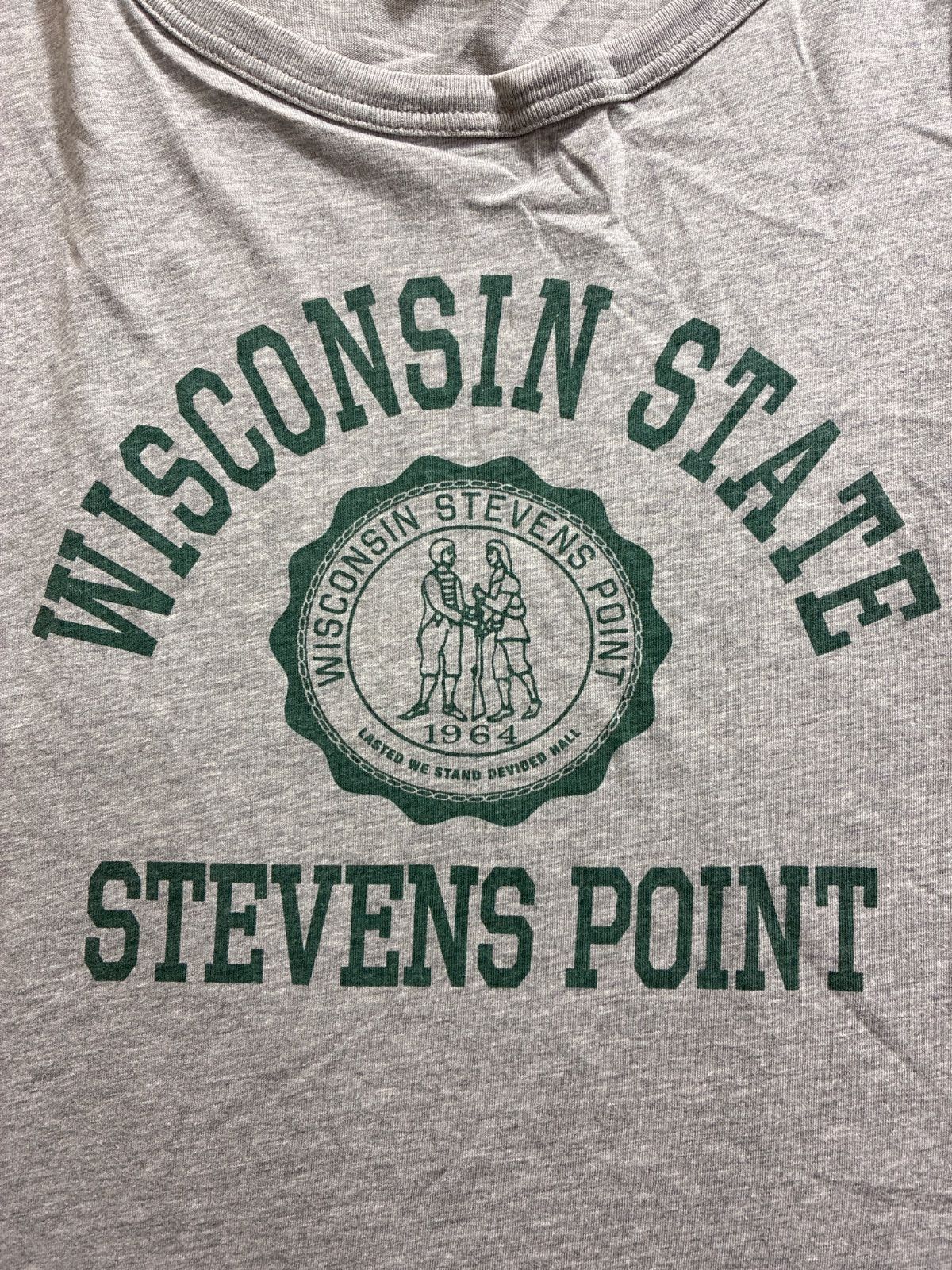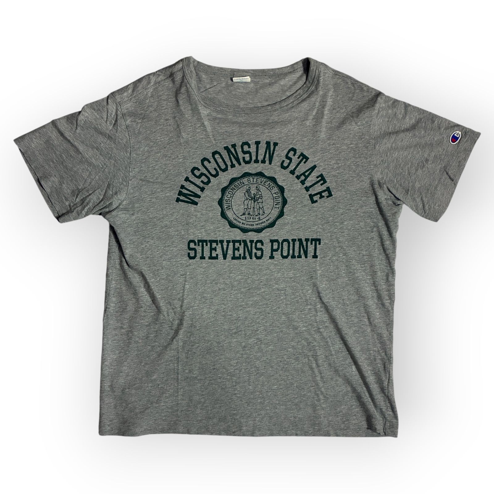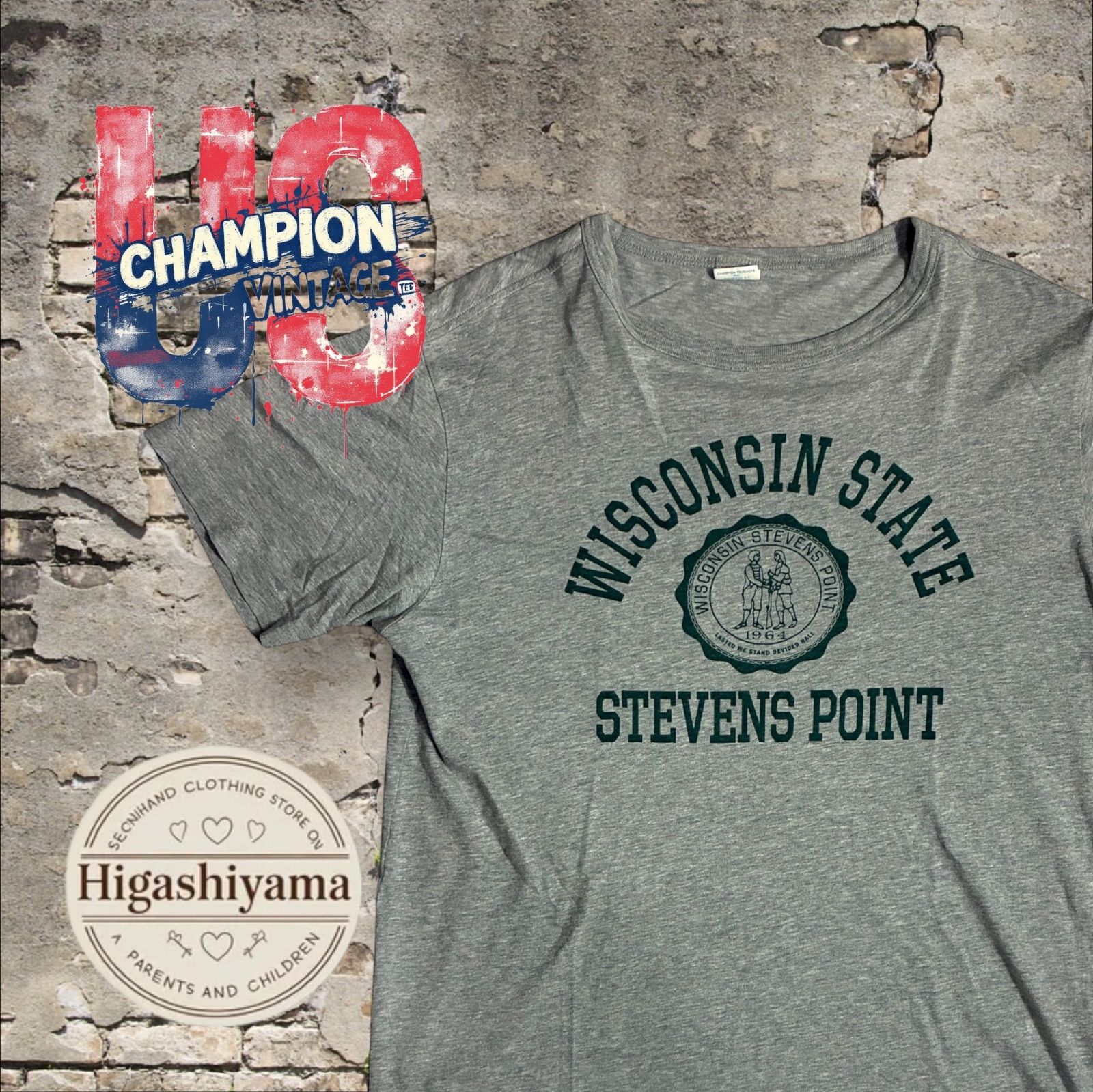 古着好きにはたまらない、定番かつ人気のヘザーグレーのボディに、ウィスコンシン州立大学(University of Wisconsin-Stevens Point)のカレッジロゴがグリーンの3段プリントで施されています。アーチロゴと紋章のバランスが絶妙で、アメカジスタイルに欠かせない王道の一枚です。