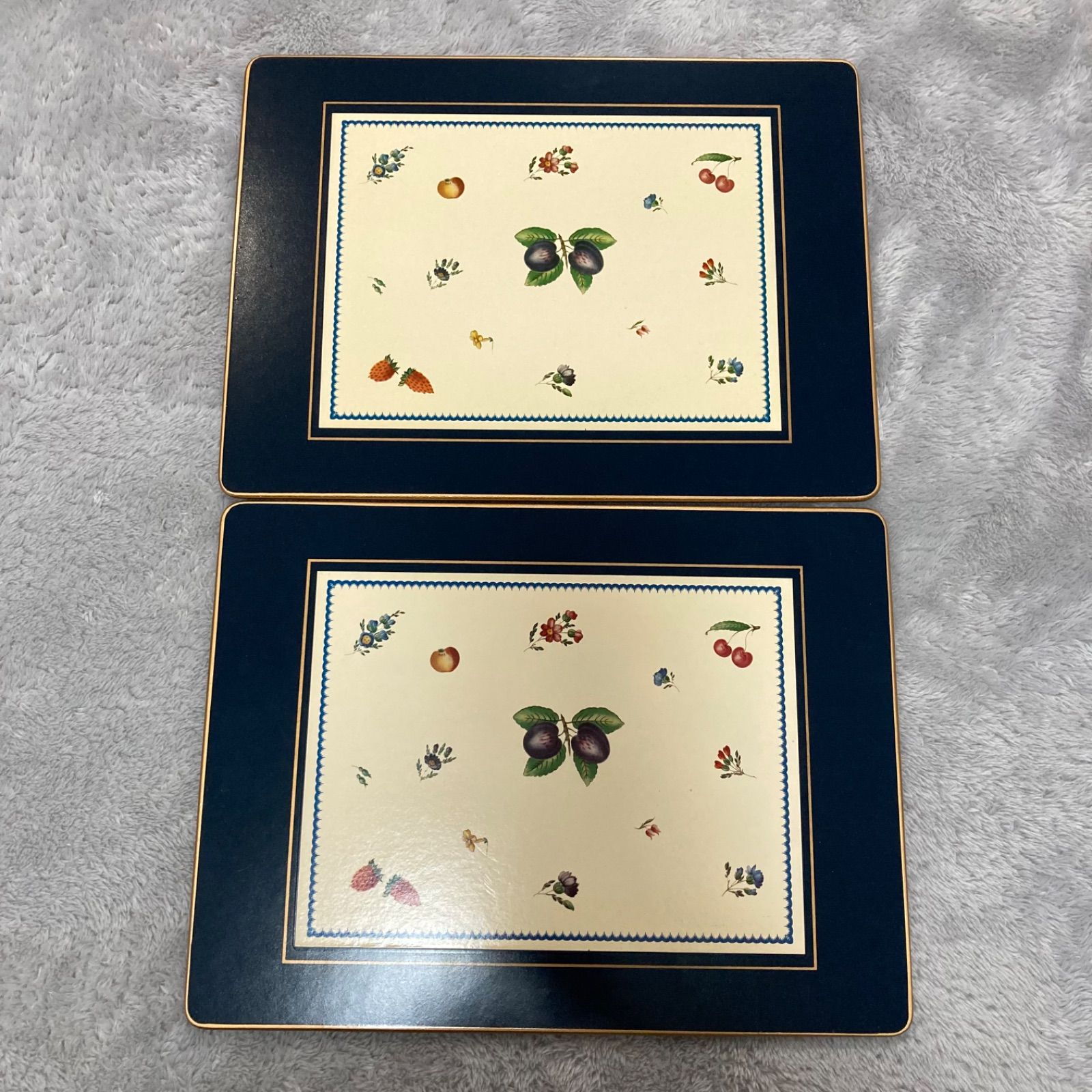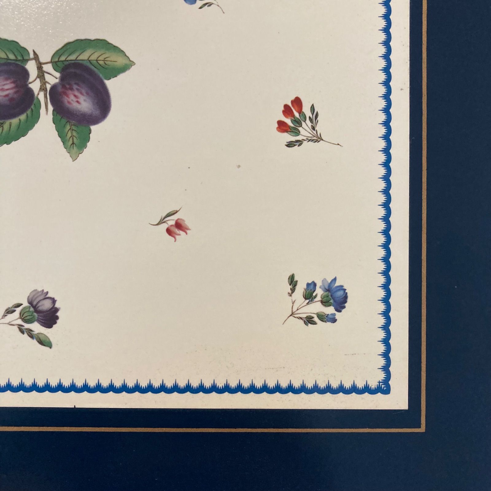 紺色に金色の淵、クリーム色に果物の柄とクラシカルで素敵です。