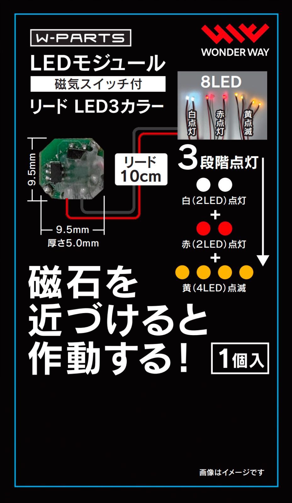 直径約9.5mm、高さ約5mm、リード長さ約10cm、LEDは1.2mmのコンパクトサイズで工作模型などに実用的なLEDモジュール。