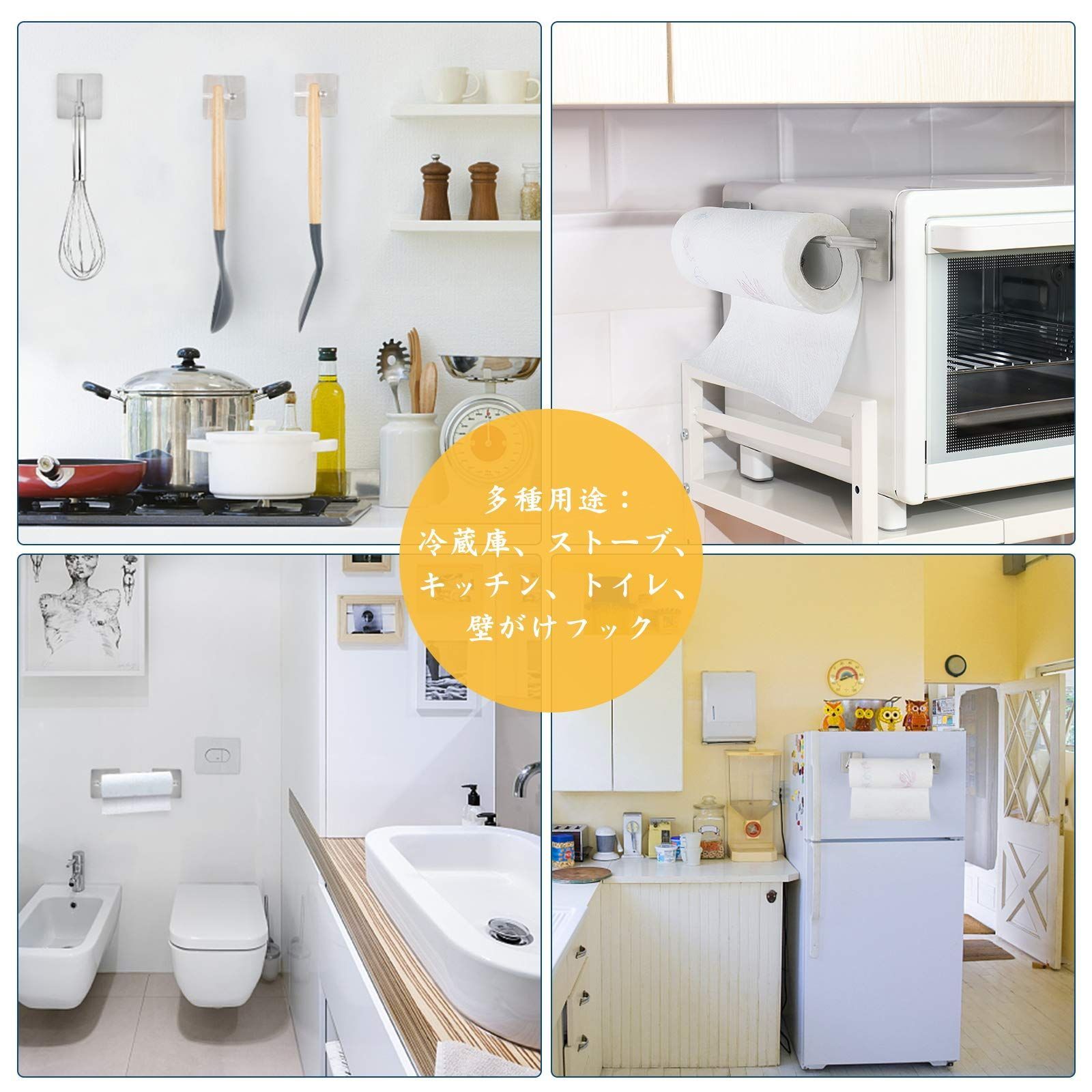 【多機能ペーパーホルダー】この多機能的キッチンペーパーホルダーは各種品物を掛けます。そして、フック2つで鍋の蓋などキッチン用道具を収納できます。キッチンペーパーホルダー キッチン収納、洗面台、浴室、バルコニー、 冷蔵庫、ストーブ、洗濯機、壁がけなどいろいろな場面で使います。他にいろいろな使い方もできますので、ご想像にお任せます。