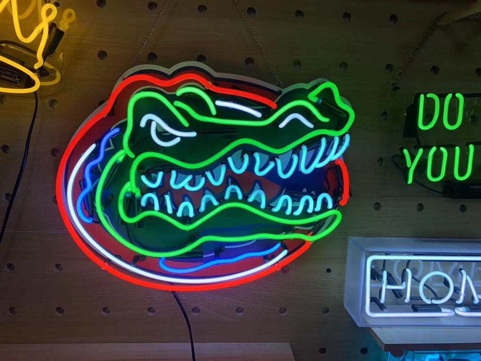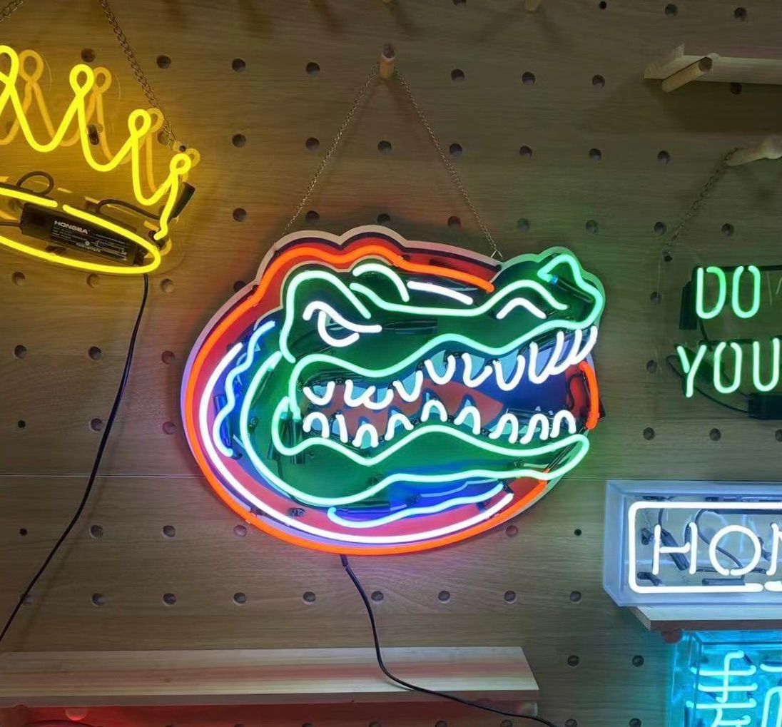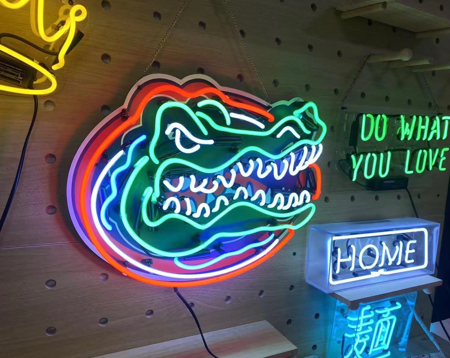 本商品は、ワニ(アリゲーター)をモチーフにした印象的なLEDネオンサインです。鋭い目元と大きな牙が特徴のワニの顔がリアルかつコミカルにデザインされており、グリーン、ホワイト、ブルー、オレンジ、レッドといった多色のネオンチューブが使われているため、存在感は抜群。特にアメリカンスタイルのインテリアや、スポーツバー、ゲームルームなどの空間演出にぴったりの一点です。