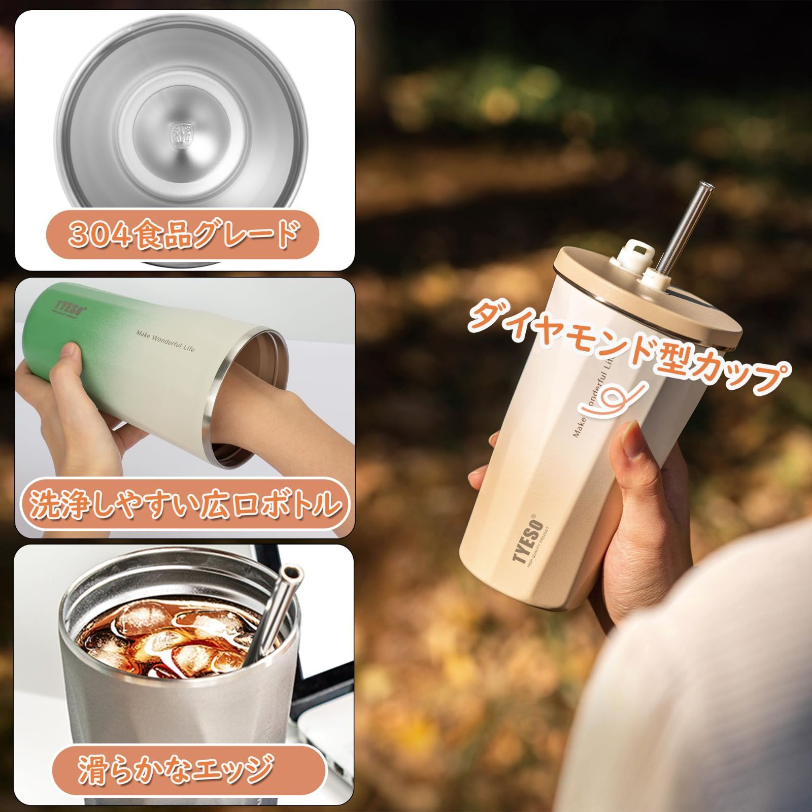 TYESO タンブラー ストロー付き ステンレス 広口 真空断熱 ホームオフィス アウトドア 多色 保温 保冷 ふた付き 600ml 大容量 女の子 男の子