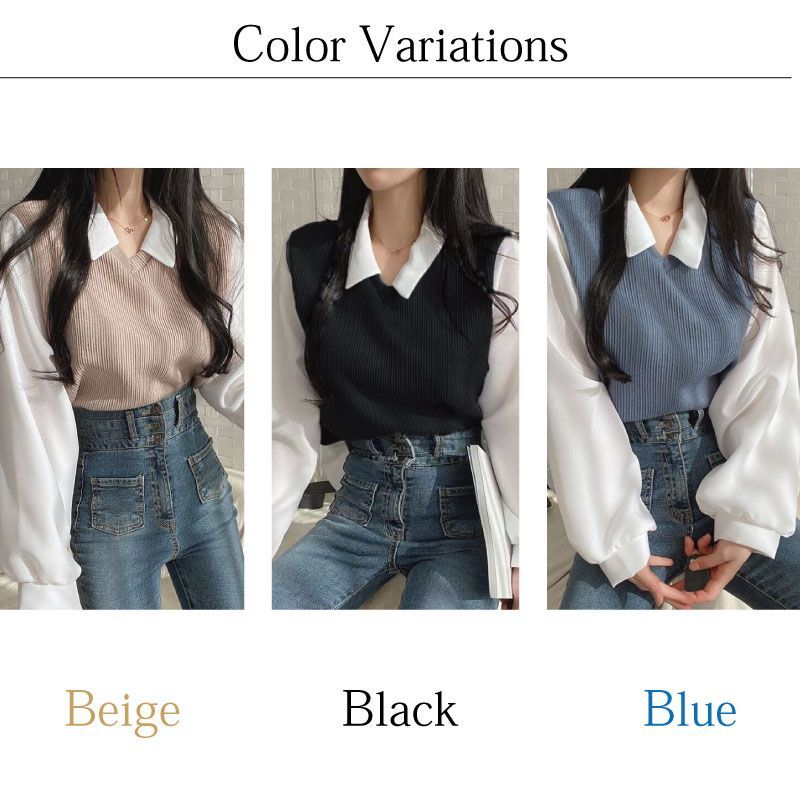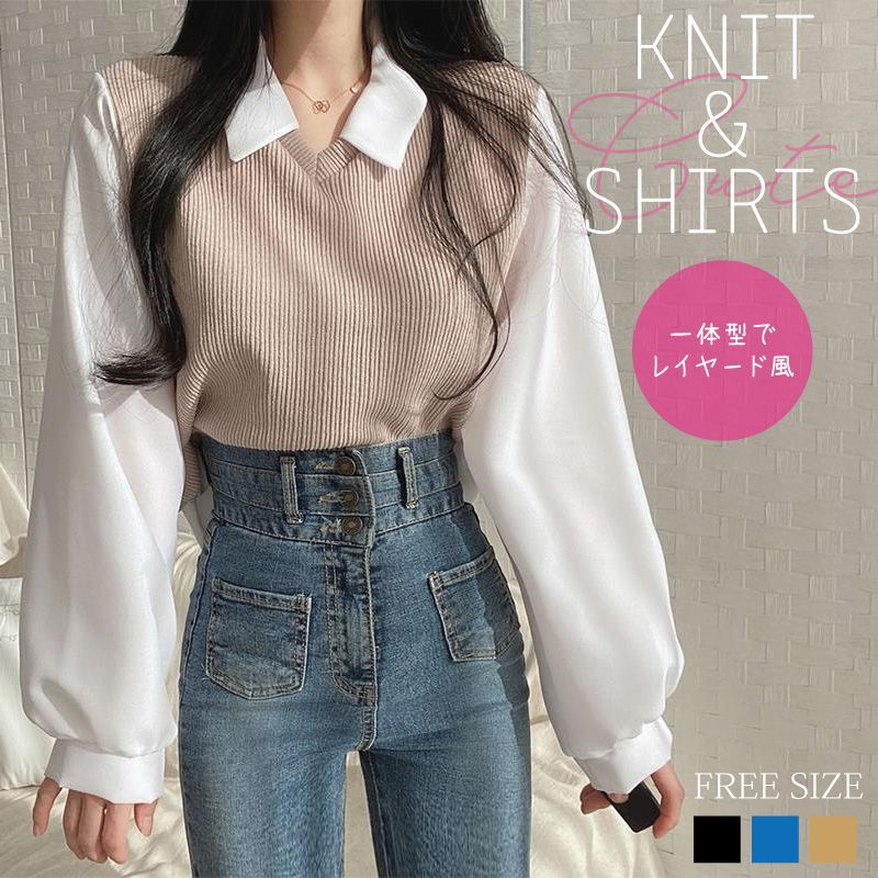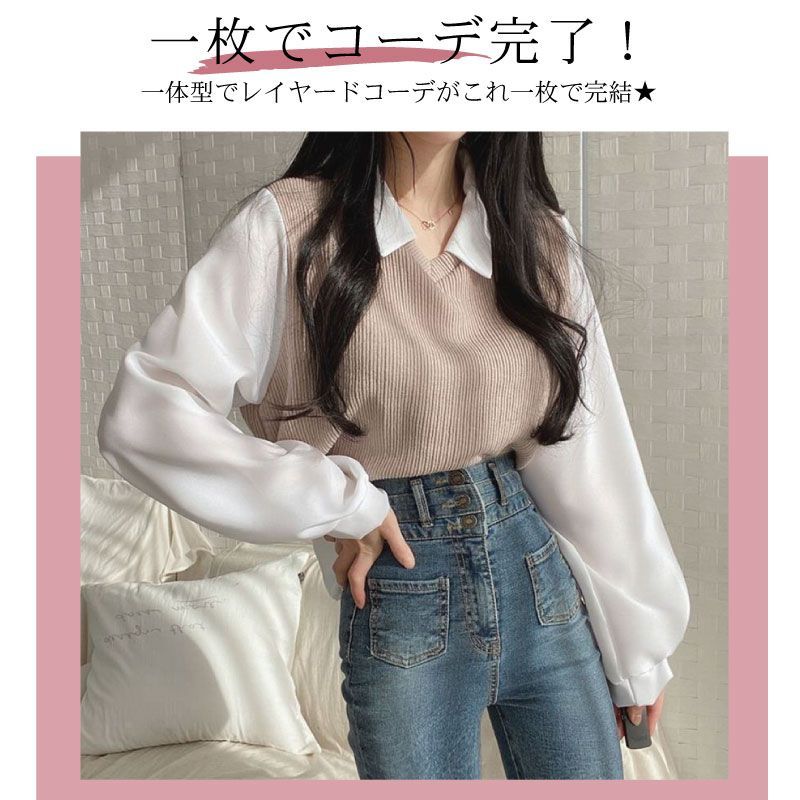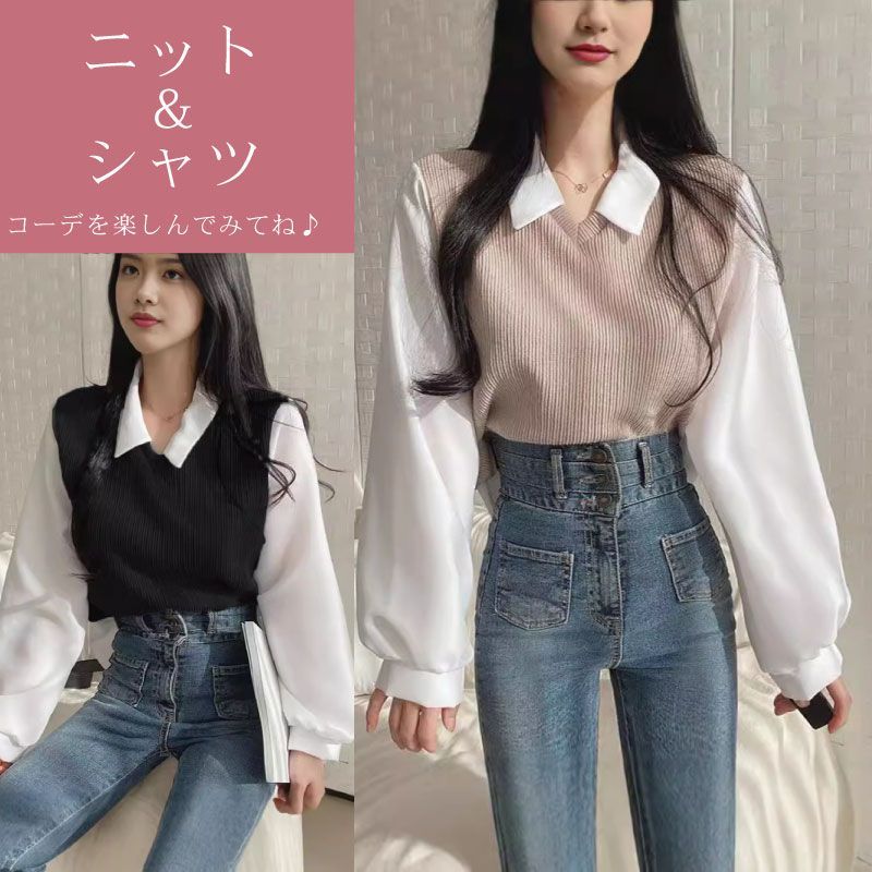 ニット風ベスト シャツ 一体型 トップス レイヤード レディース トップス シンプル 無地 かわいい 学生 制服 韓国ファッション