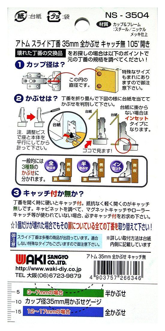和気産業(Waki Sangyo) ATOM スライド丁番 1個入 キャッチ無し 全かぶせ カップ径35mm キッチン 玄関 戸棚 NS-3504