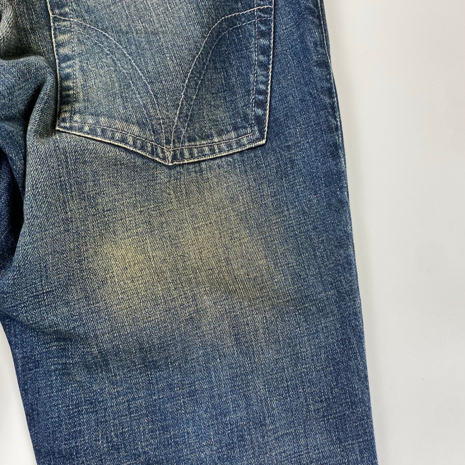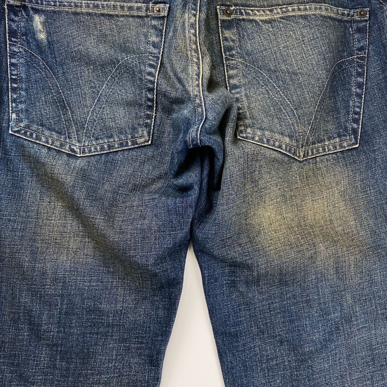ベルトやフロントに見えるジッパーフライ、そして茶味のある色落ちが雰囲気抜群。