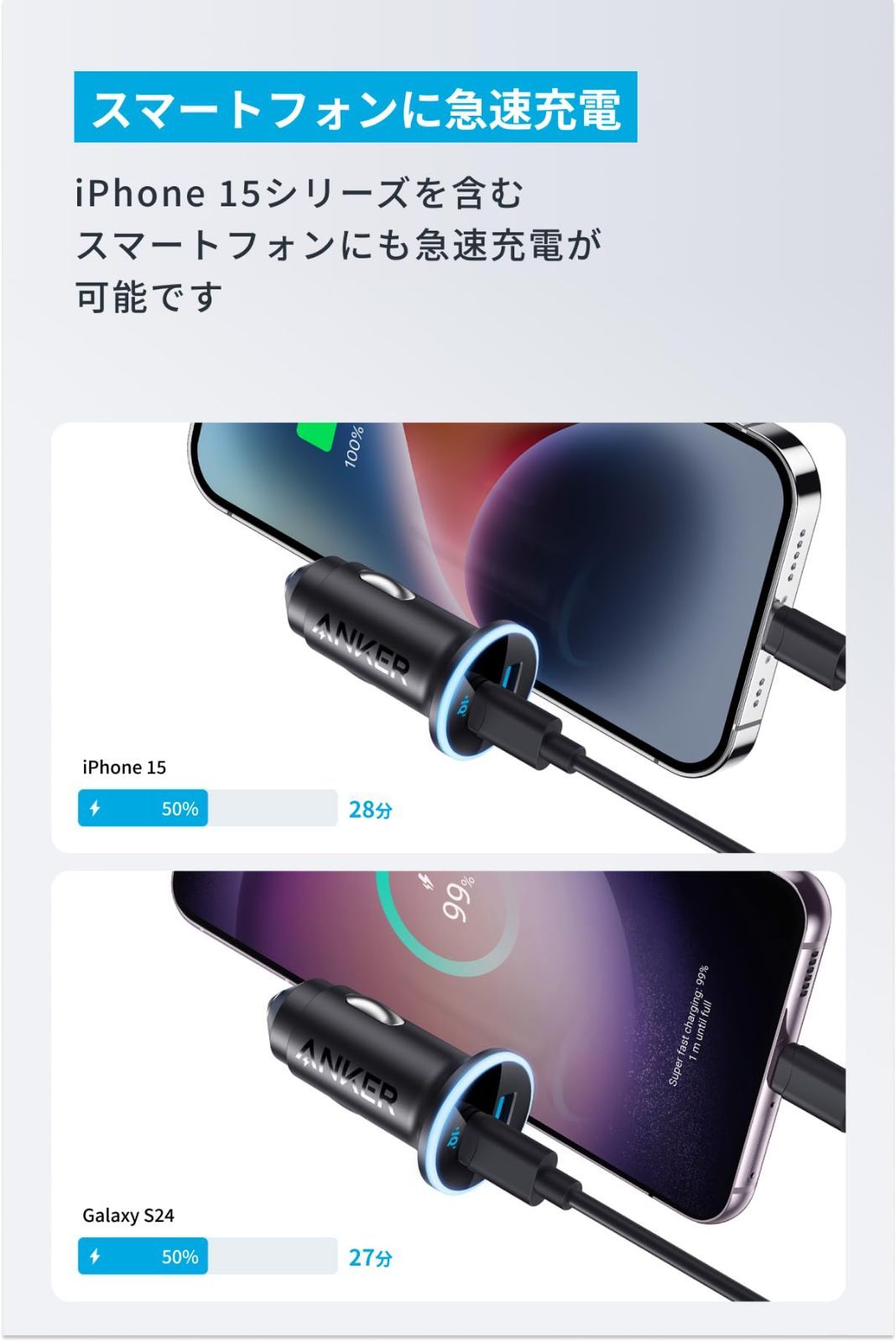 iPhoneに急速充電:iPhone 15シリーズにも急速充電が可能。一般的な5W出力の充電器に比べ最大3倍速く充電できます (※iPhone 15を0%から30分充電した場合との比較) 。