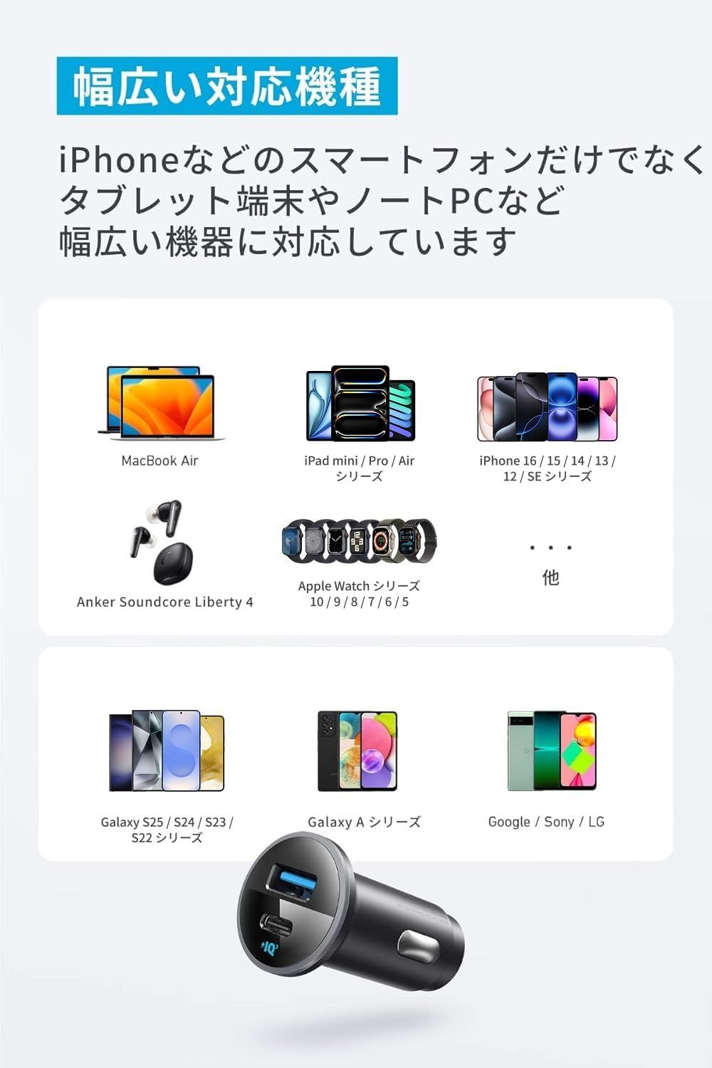 幅広い対応機種:iPhoneなどのスマートフォンだけでなく、タブレット端末やノートPCなど幅広い機器に対応しています。
