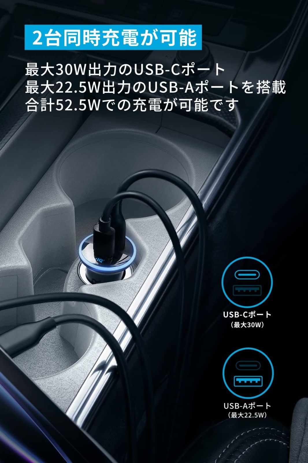 2台同時充電:最大30W出力のUSB-Cポート、最大22.5W出力のUSB-Aポートを搭載。合計最大52.5Wでの充電が可能です。スマートフォン、タブレット端末などの機器を2台同時に充電することができます。