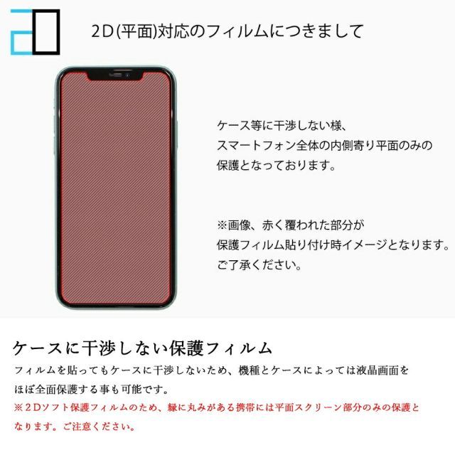 ※2Dソフト保護フィルムのため、縁に丸みがある携帯には平面スクリーン部分のみの保護となります。ご注意ください。
