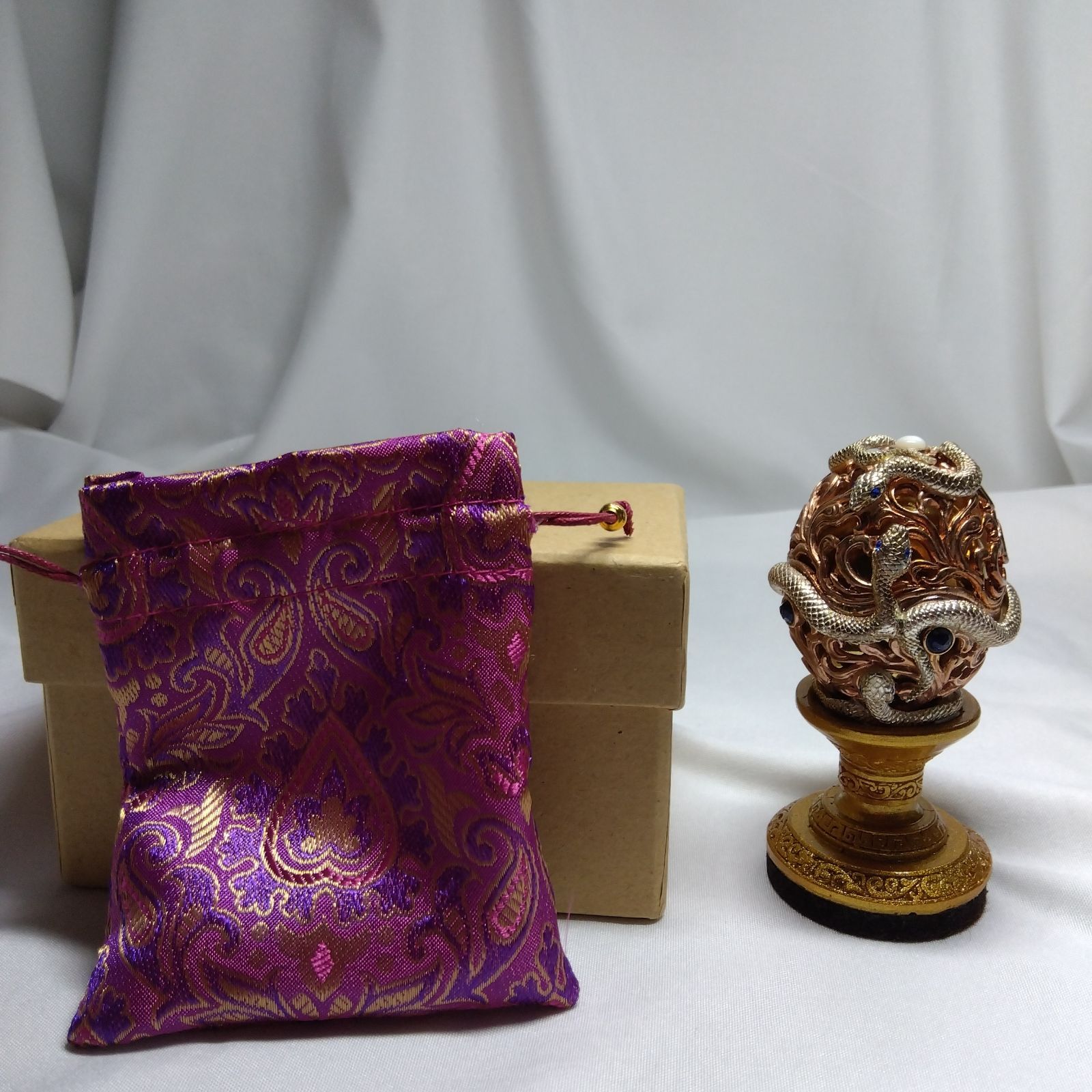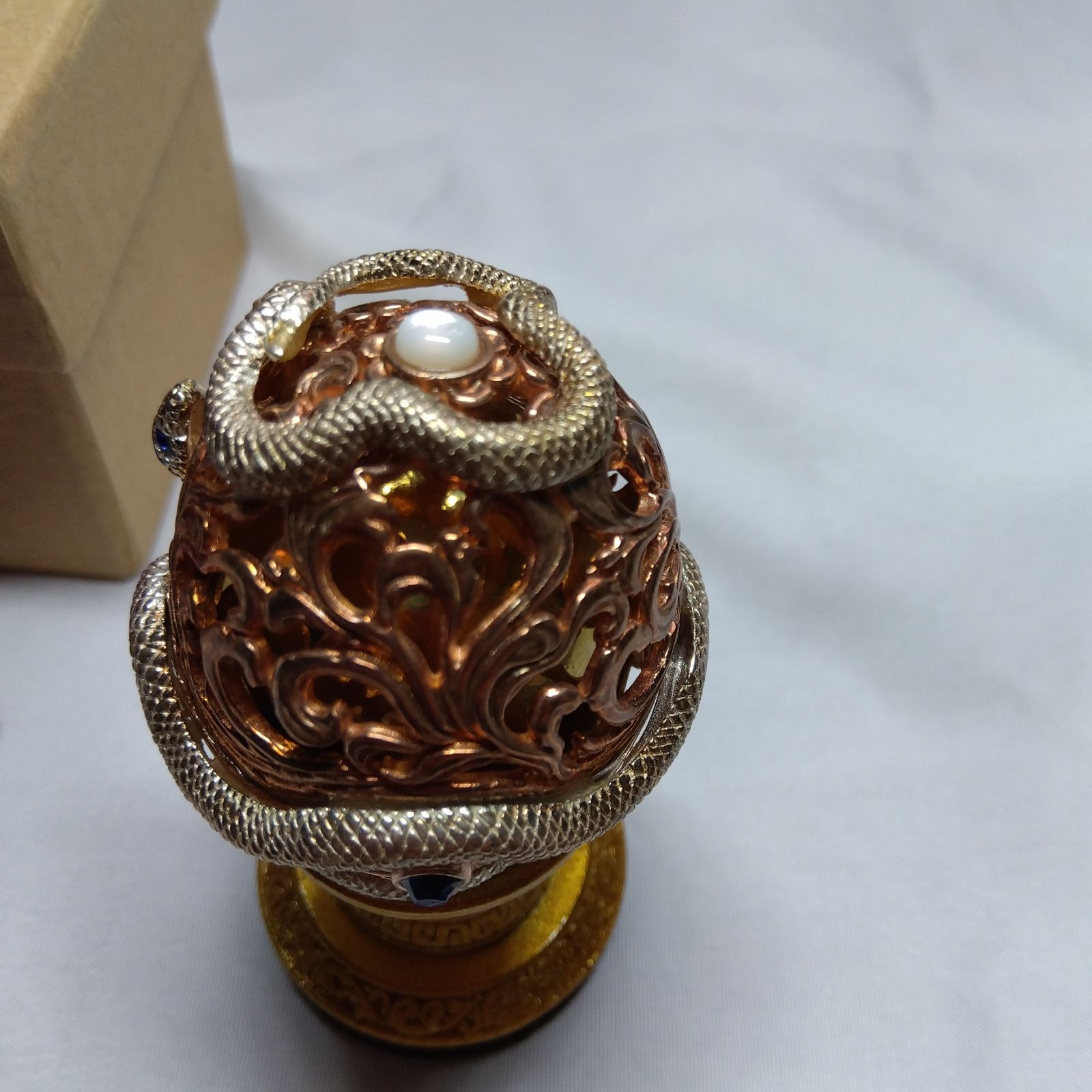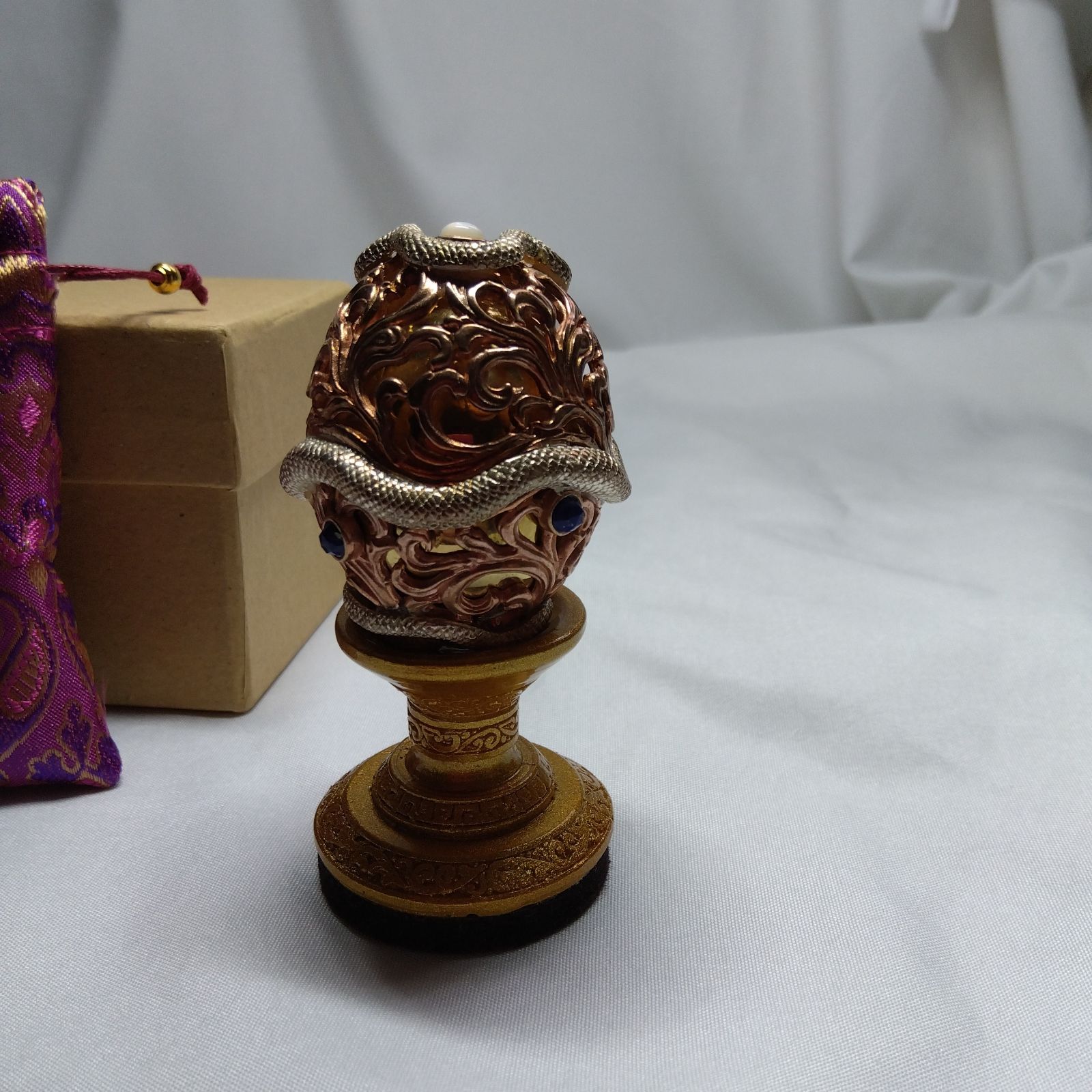 蛇の装飾が施された金属製の卵型、青い宝石ラピスラズリがあしらわれています。