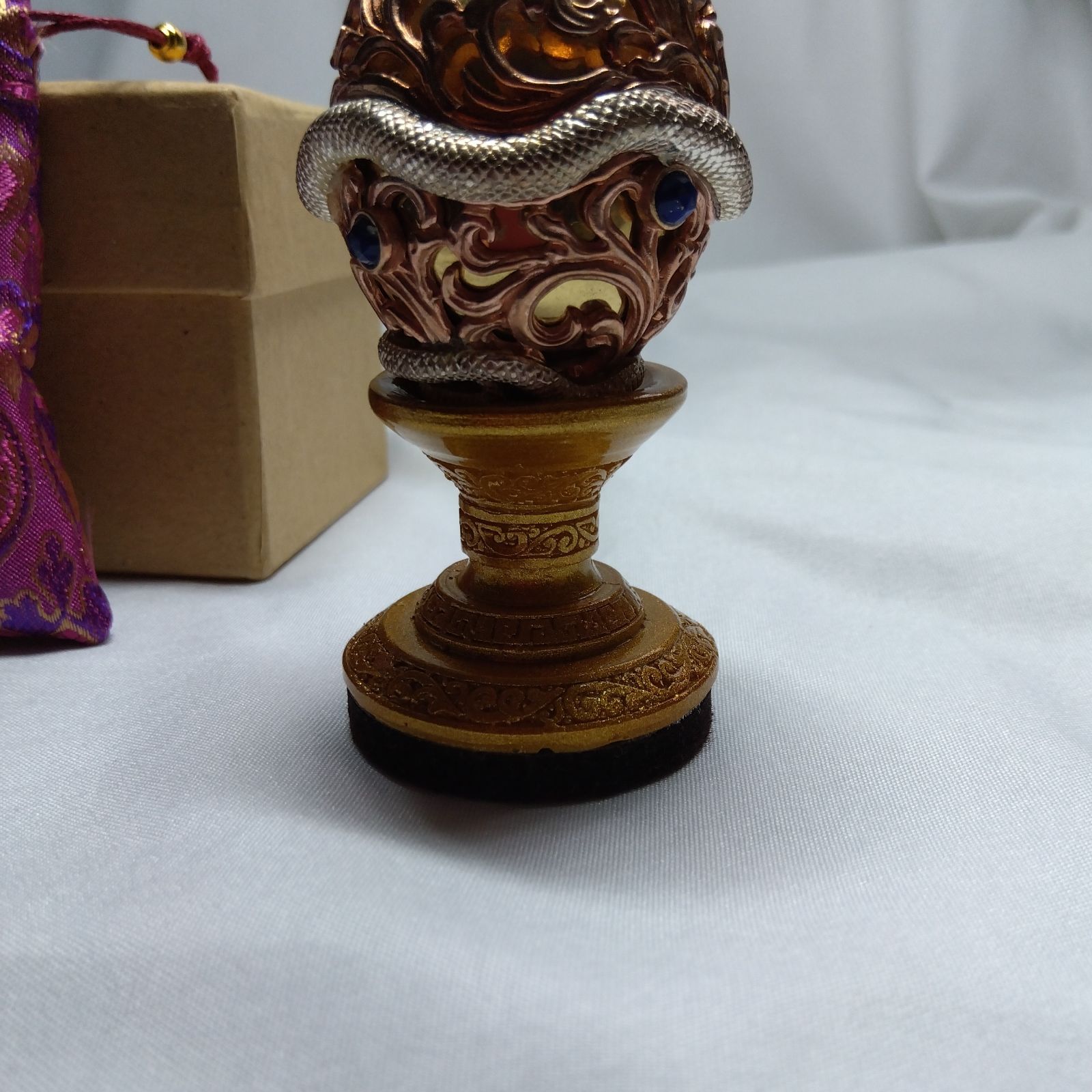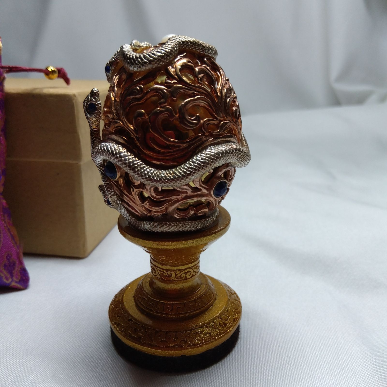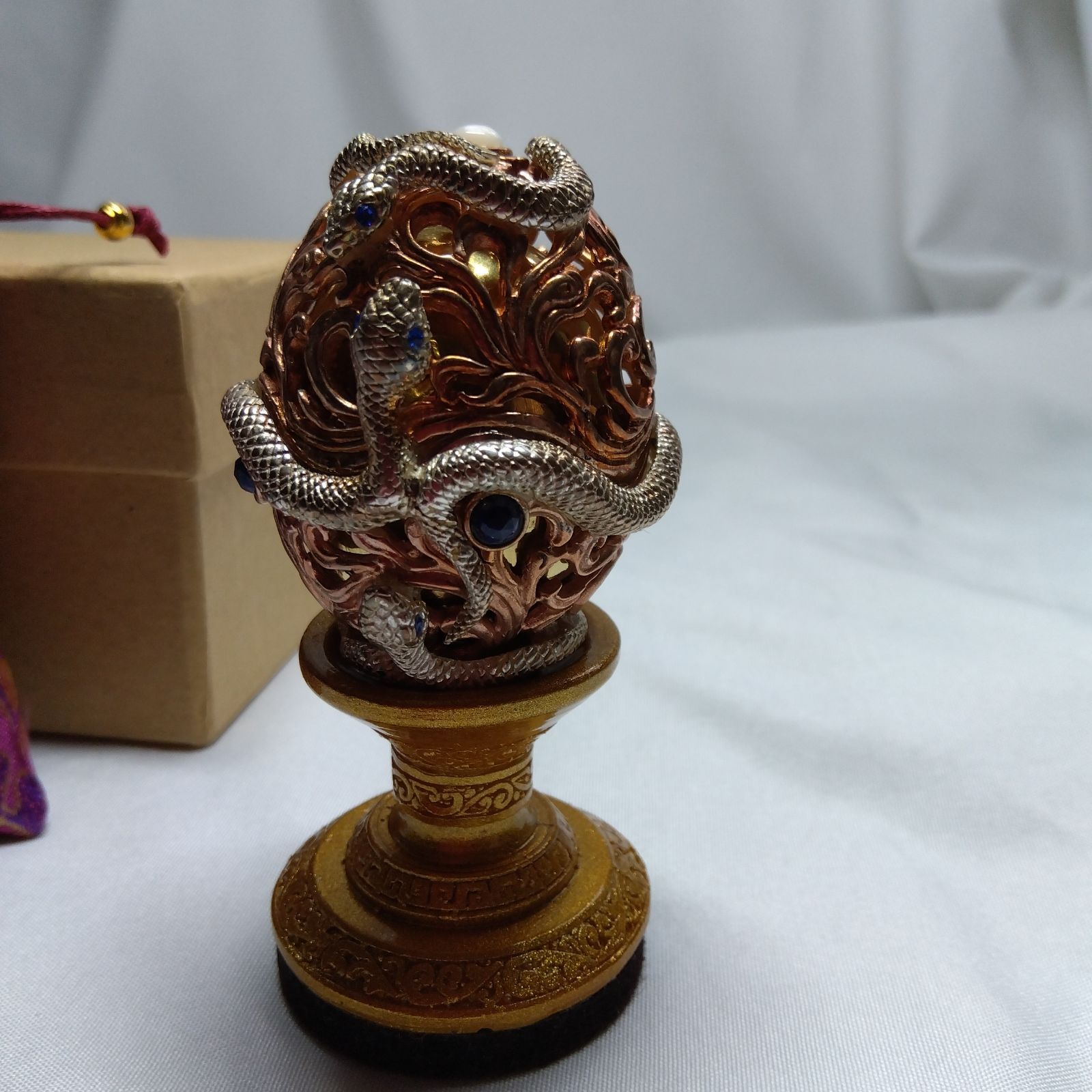 蛇の装飾が施された金属製の卵型、青い宝石ラピスラズリがあしらわれています。