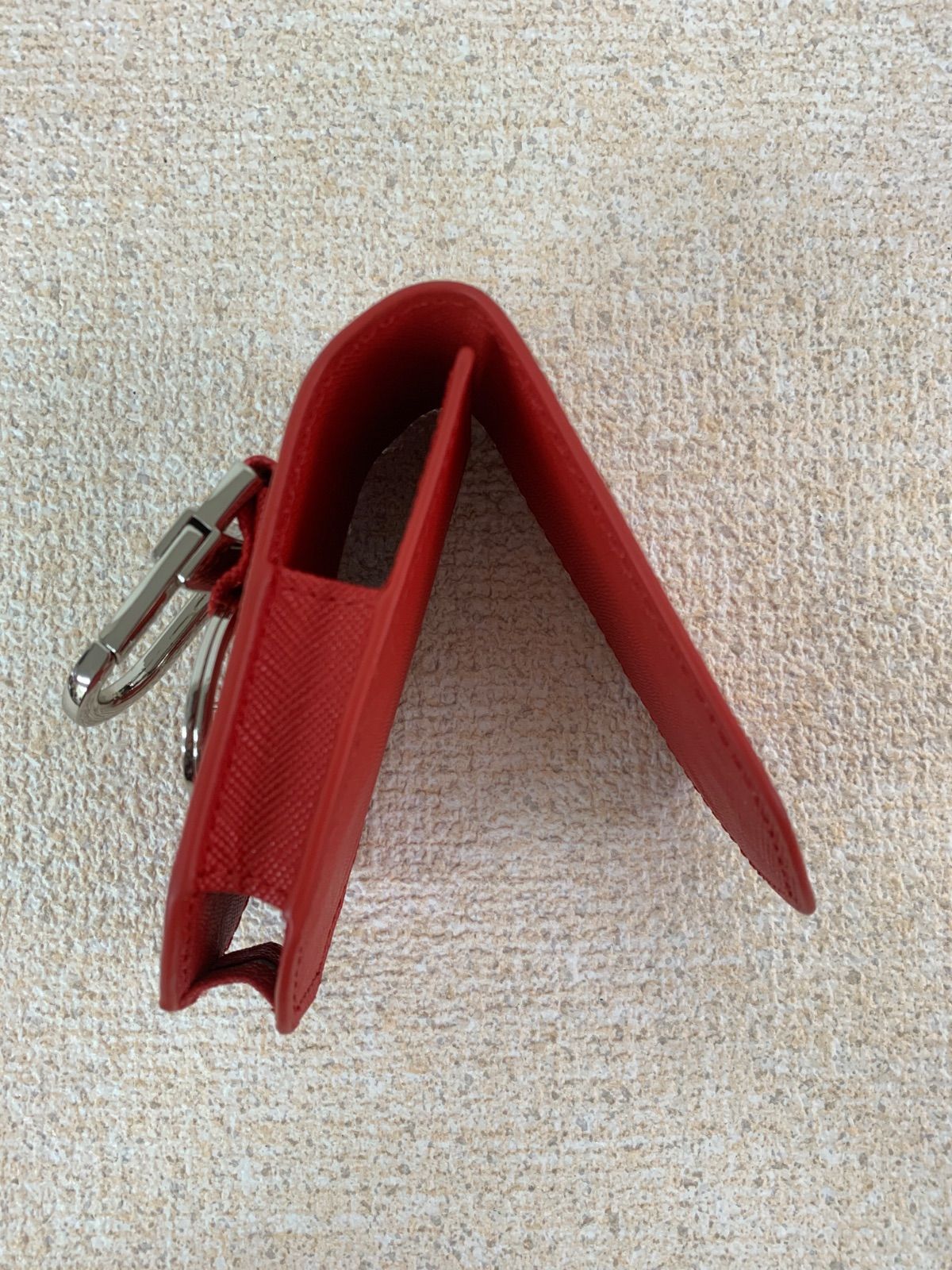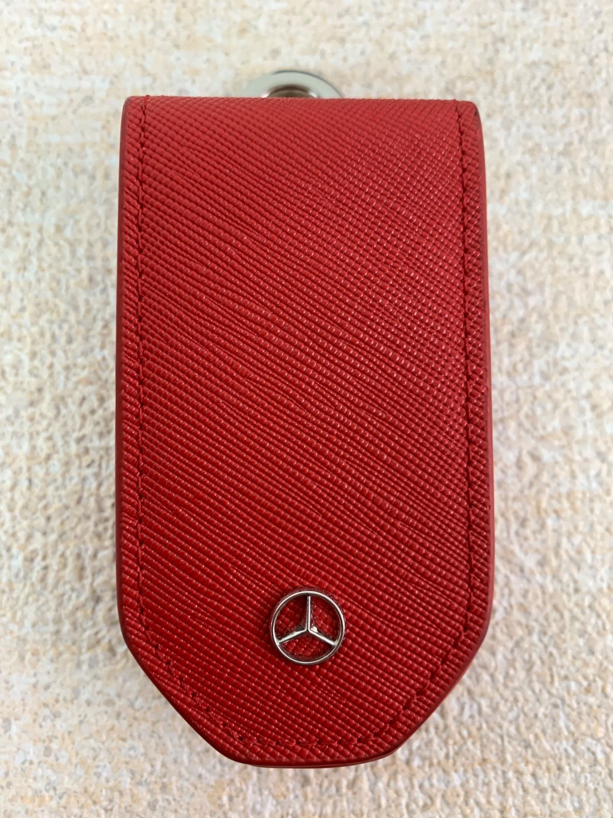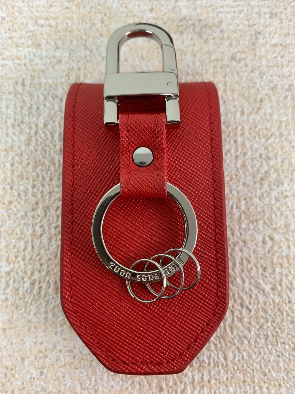 メルセデス・ベンツのロゴが施されたスタイリッシュな赤レザーのキーケースです。