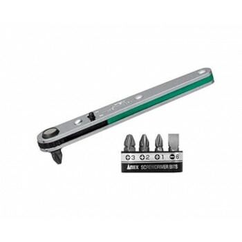 狭い箇所でのねじ回しにお使いいただけます。超短ビット採用で超薄型ヘッドが21mmになっています。持ち手を変えず、左右の反復回し動作でネジを回せるラチェット機構です。