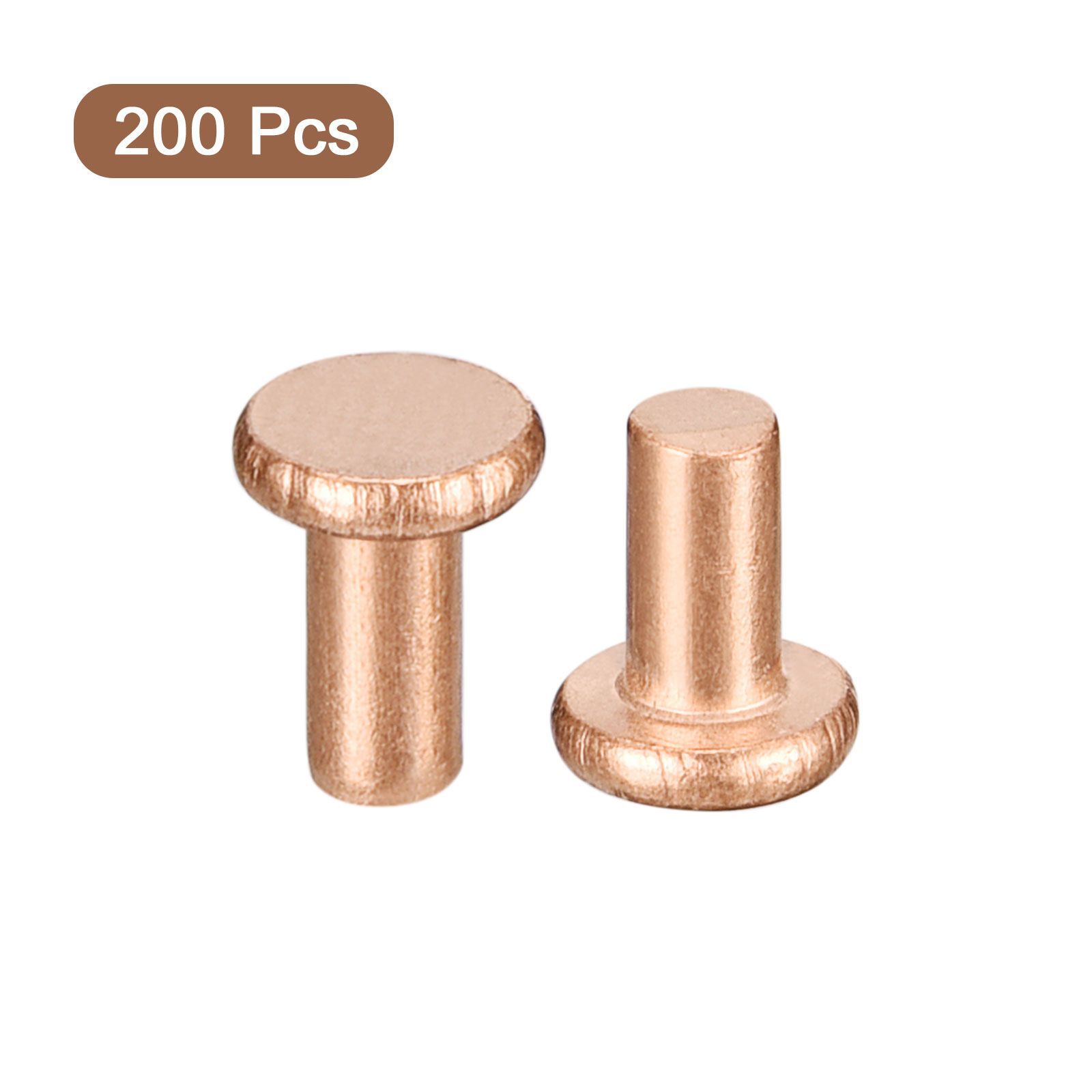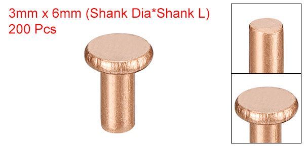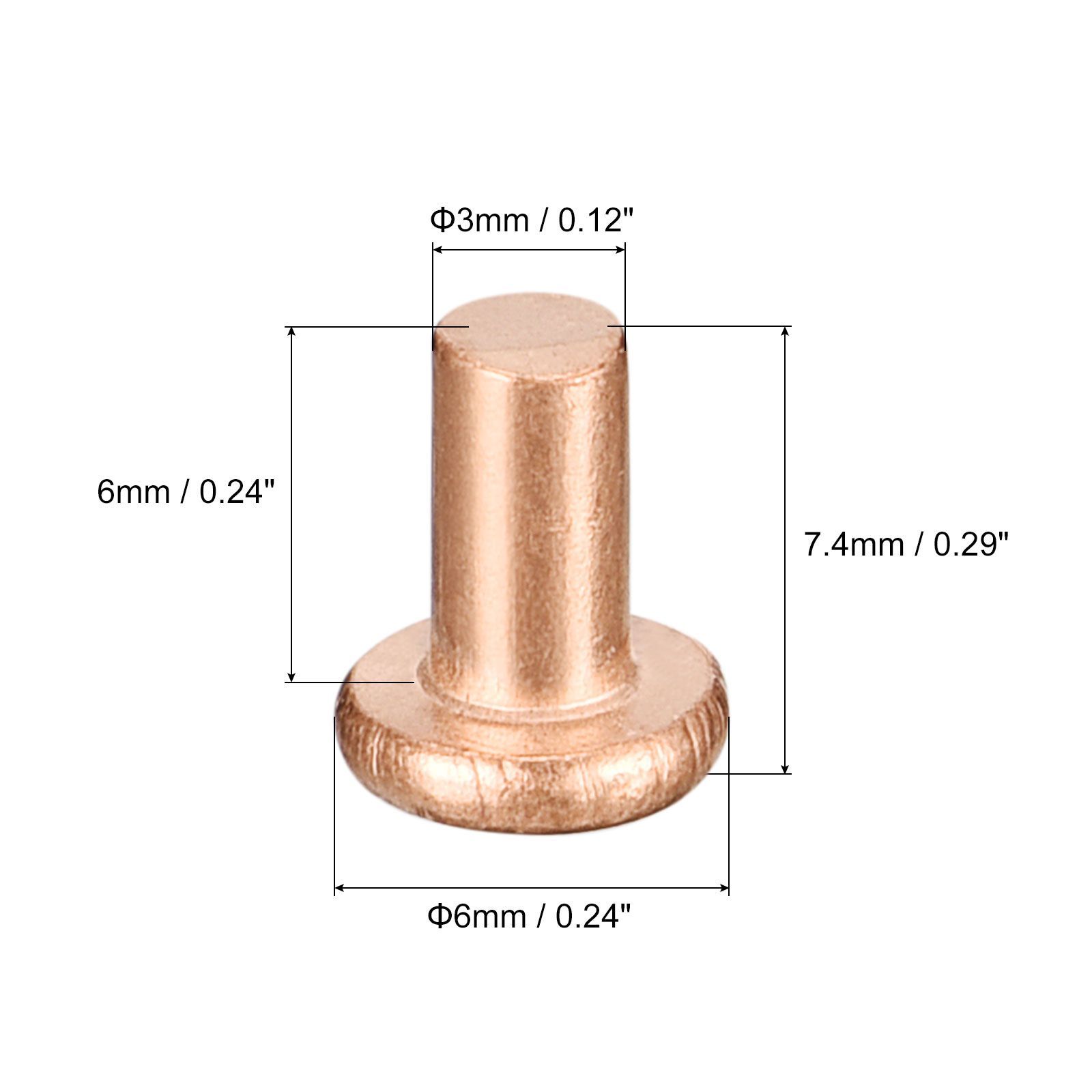 [銅無垢リベット] - サイズ:3 mm x 6mm; 3 mmシャンク径; 6mmシャンク長さ; ヘッド直径:6mm; 全長:7.4mm。これらの銅製リベットは、金属または革の表面と同一平面上に位置する平らなヘッドを特徴とし、滑らかで目立たない仕上げを実現します。