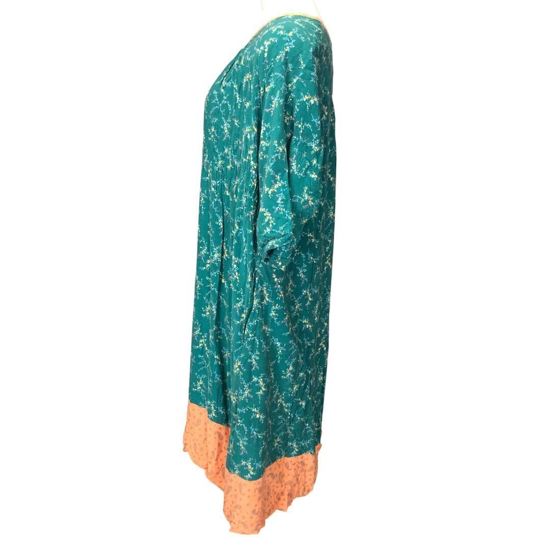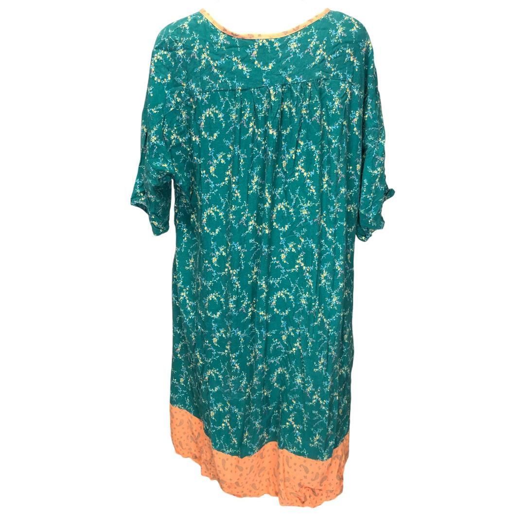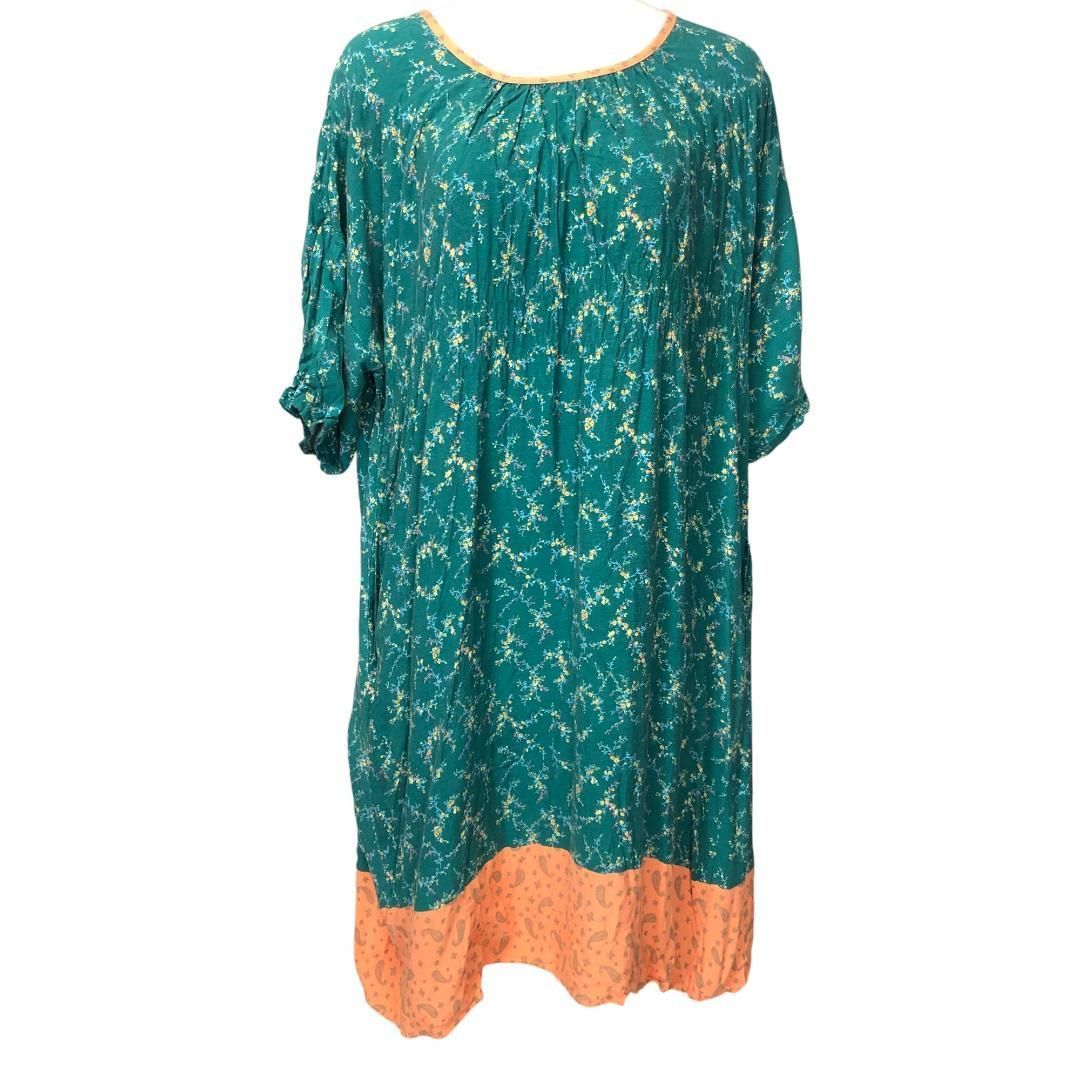 肌触りが良く楽な着用感、体のラインを拾いにくいゆったりサイズ。グリーン地に小花柄・オレンジ地にペイズリー柄の七分袖総柄ワンピースです。バスト部分にシャーリング(ゴム入り)があります。左右ポケット付き。身長160cm着用で膝が隠れる丈です。