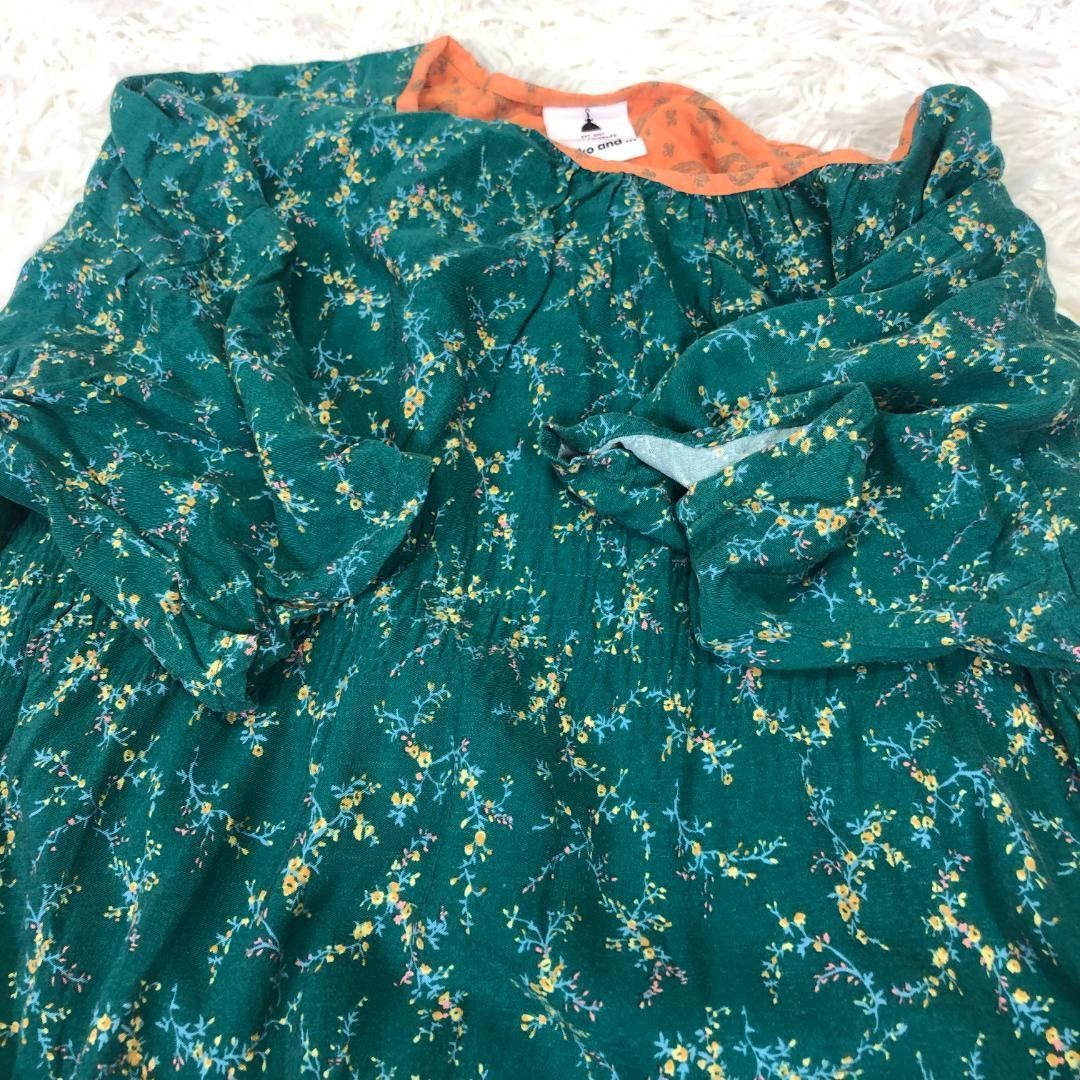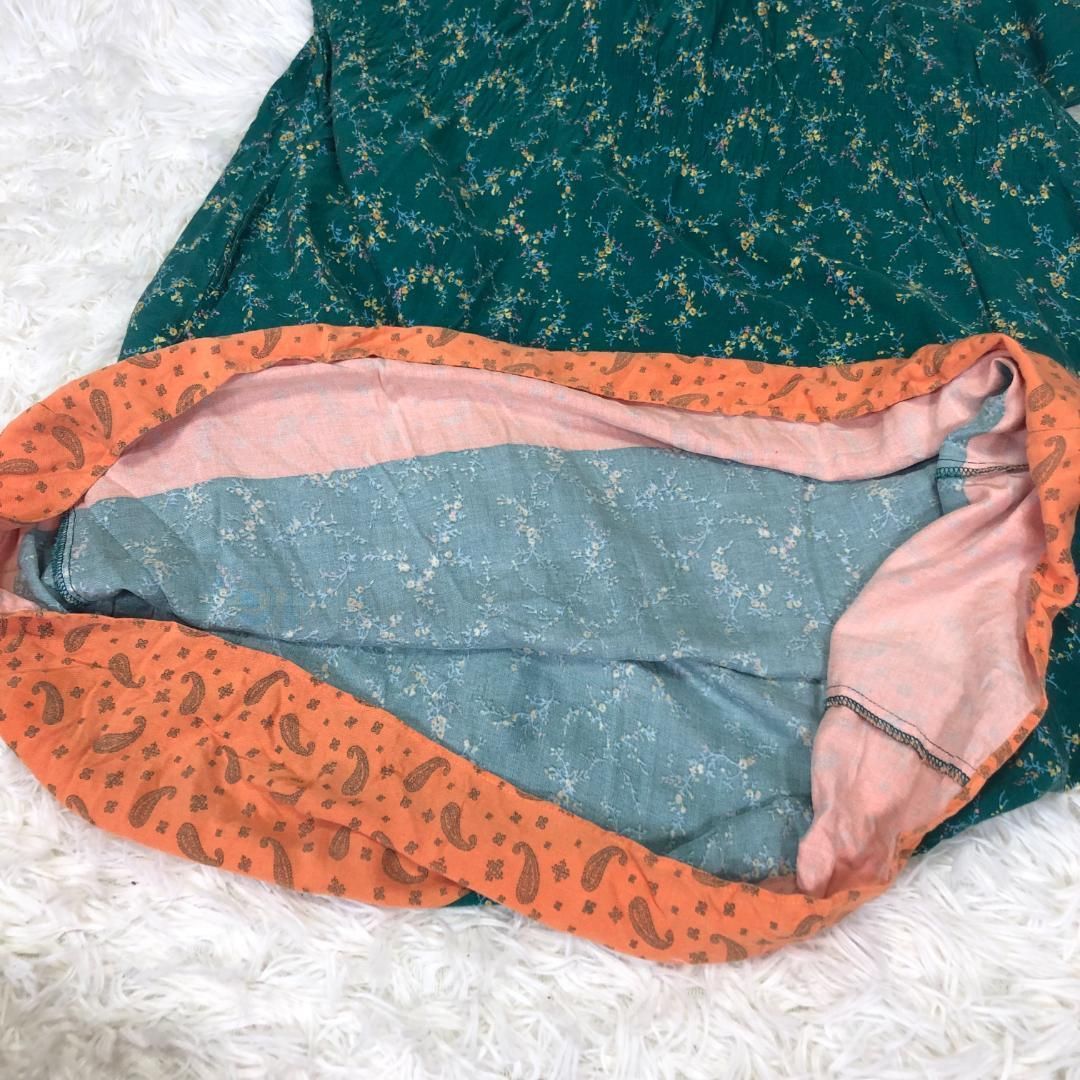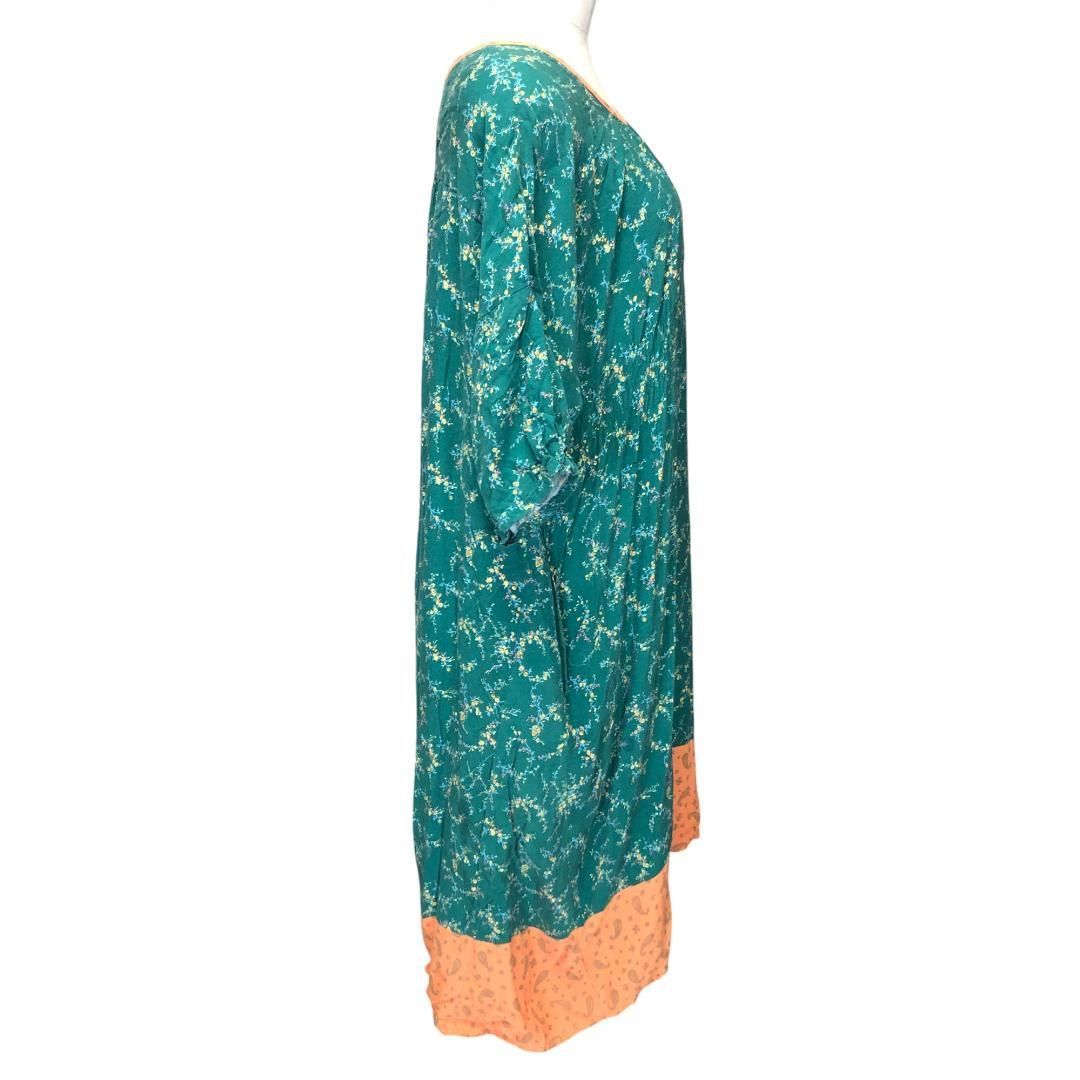 肌触りが良く楽な着用感、体のラインを拾いにくいゆったりサイズ。グリーン地に小花柄・オレンジ地にペイズリー柄の七分袖総柄ワンピースです。バスト部分にシャーリング(ゴム入り)があります。左右ポケット付き。身長160cm着用で膝が隠れる丈です。