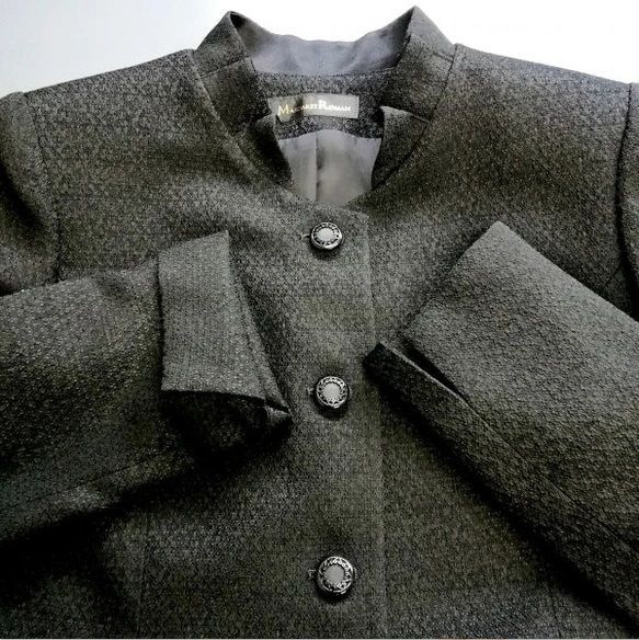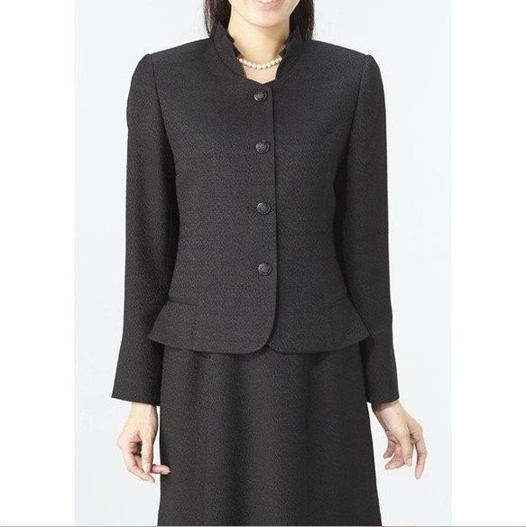 高級素材として有名な米沢織の生地を使用したエレガントなスーツスタイルです。米沢織の生地は、つややかな糸、濃色の黒、なんといっても表面の凹凸感と表情がとてもいいです。最高級の商品を少しでもお値打ちにお出ししています。