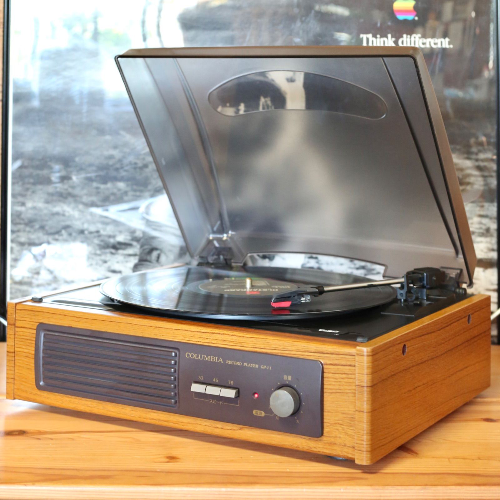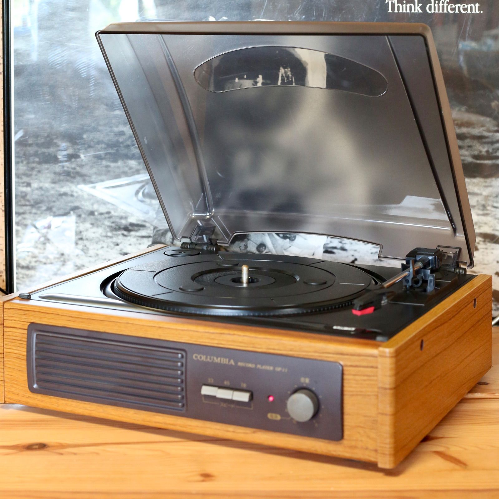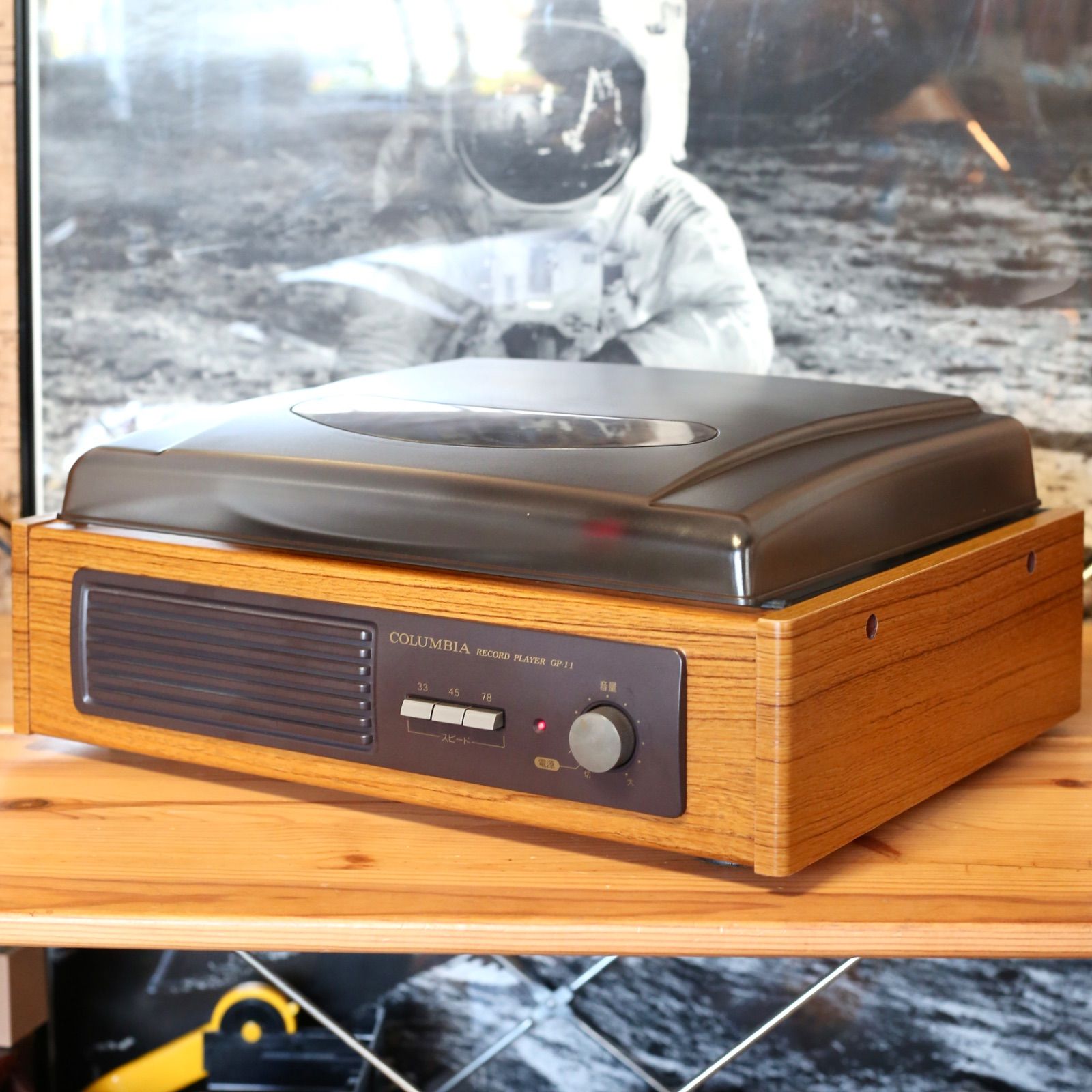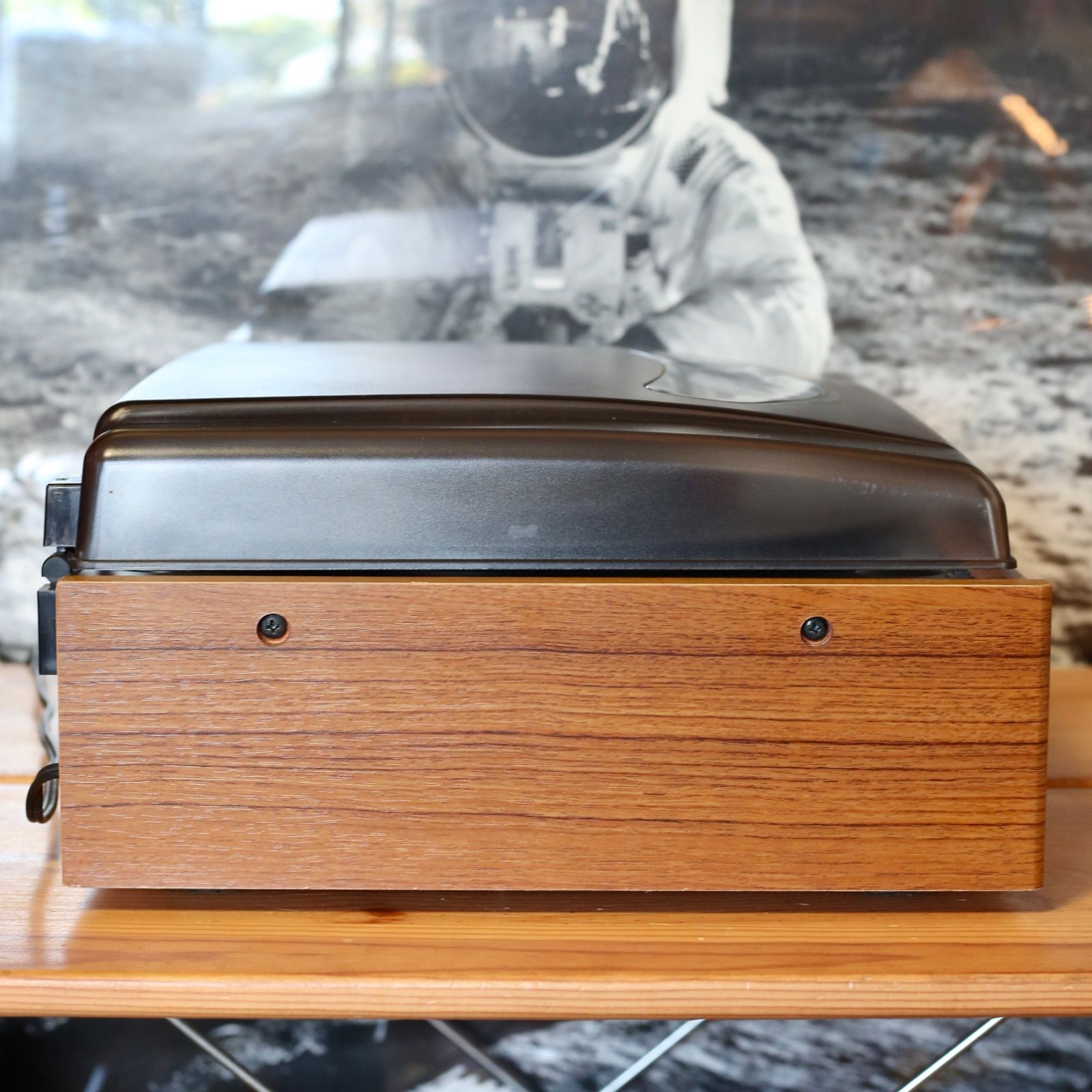 落ち着いた木目調デザインと一体型スピーカーが特徴の昭和レトロなレコードプレーヤーです
