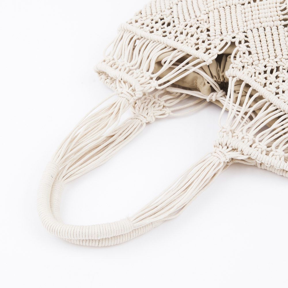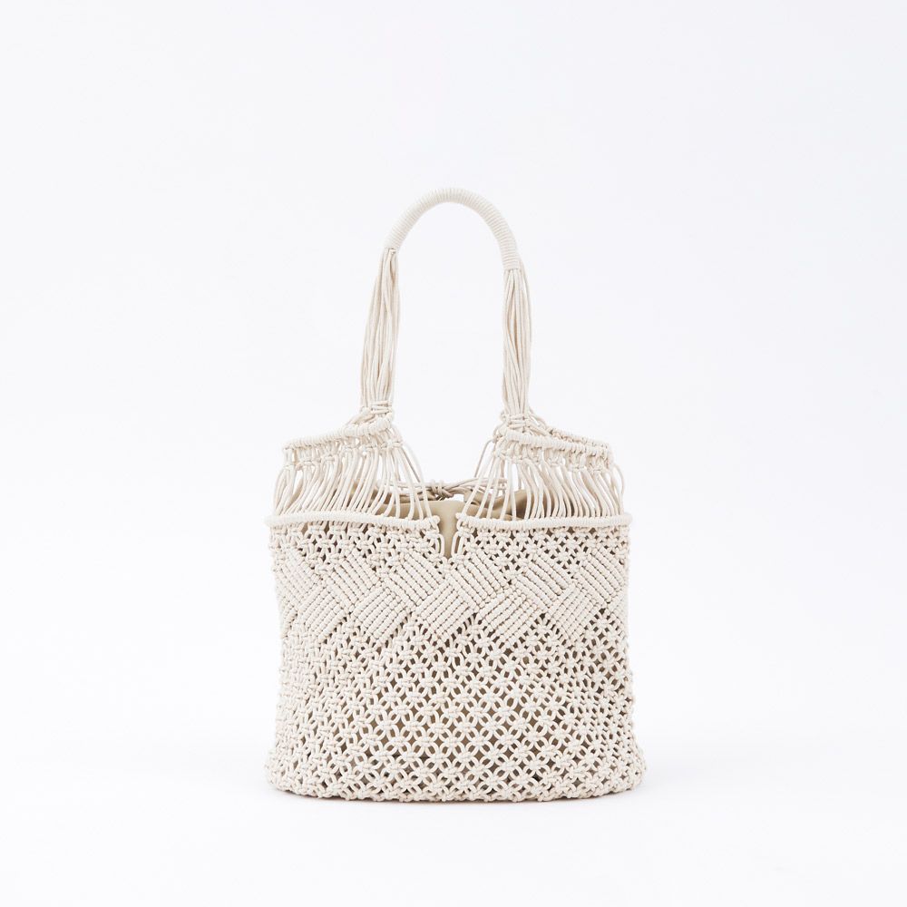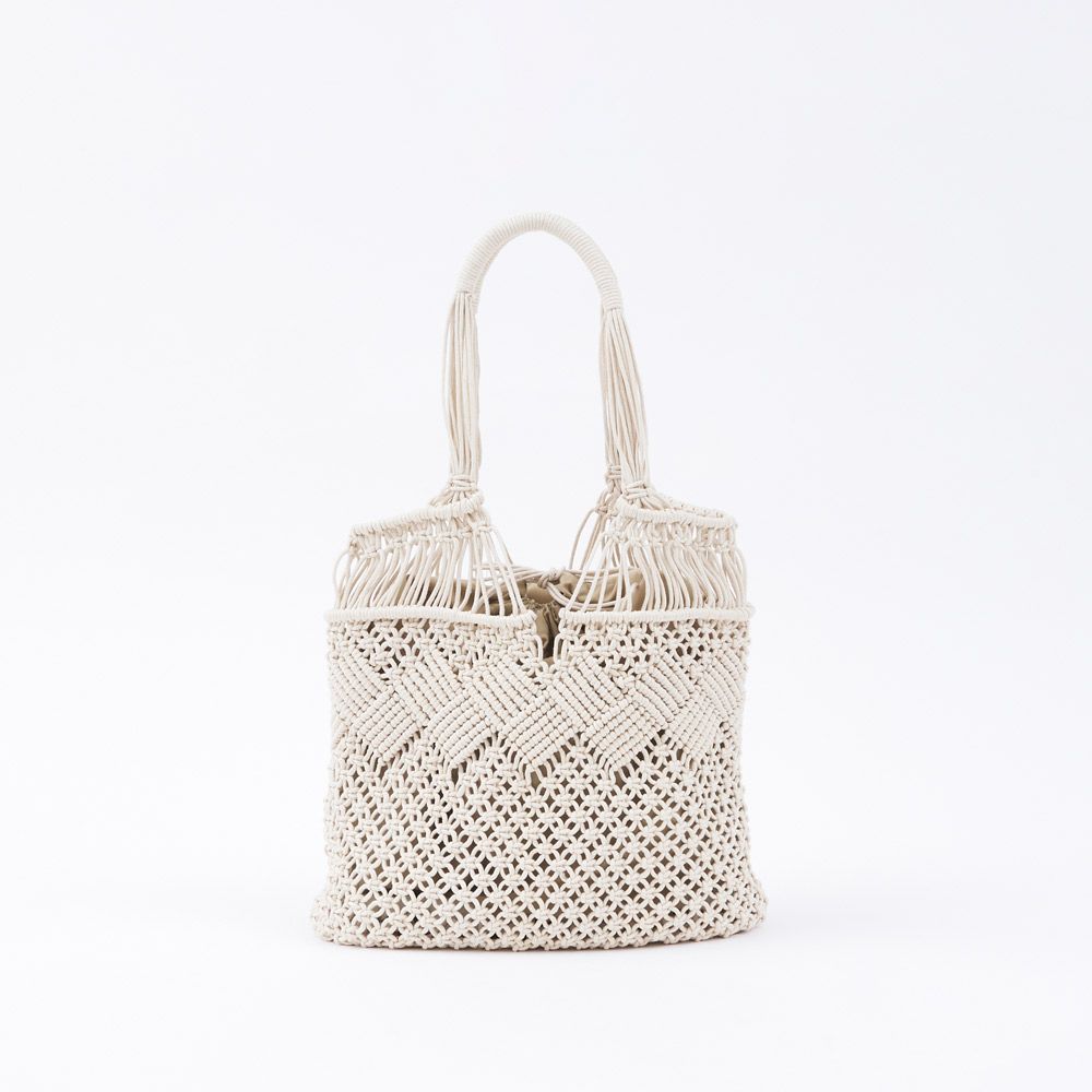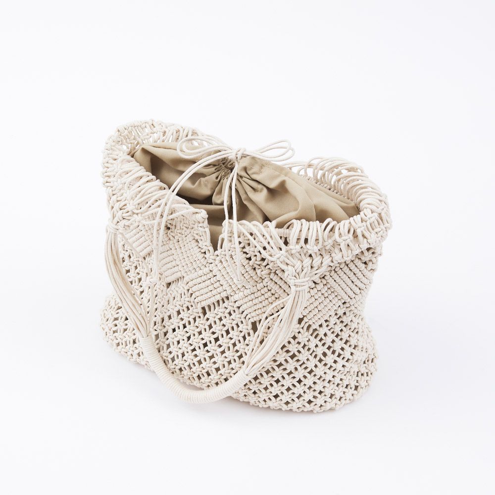 細いコットンコードを全面に編み込み、ハンドメイドの技術が光るアイテムです。