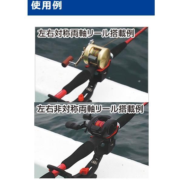 ワイドなリール受部は、左右独立高さ調節機能採用で左右それぞれに高さ調節ができ、形状が非対称の両軸リールでも安定して搭載できます。竿尻受部はレバーの開閉でロックでき、竿の脱落を防止。クランプはタテヨコ取付が可能で竿受の首振り・角度調節も自由自在です。