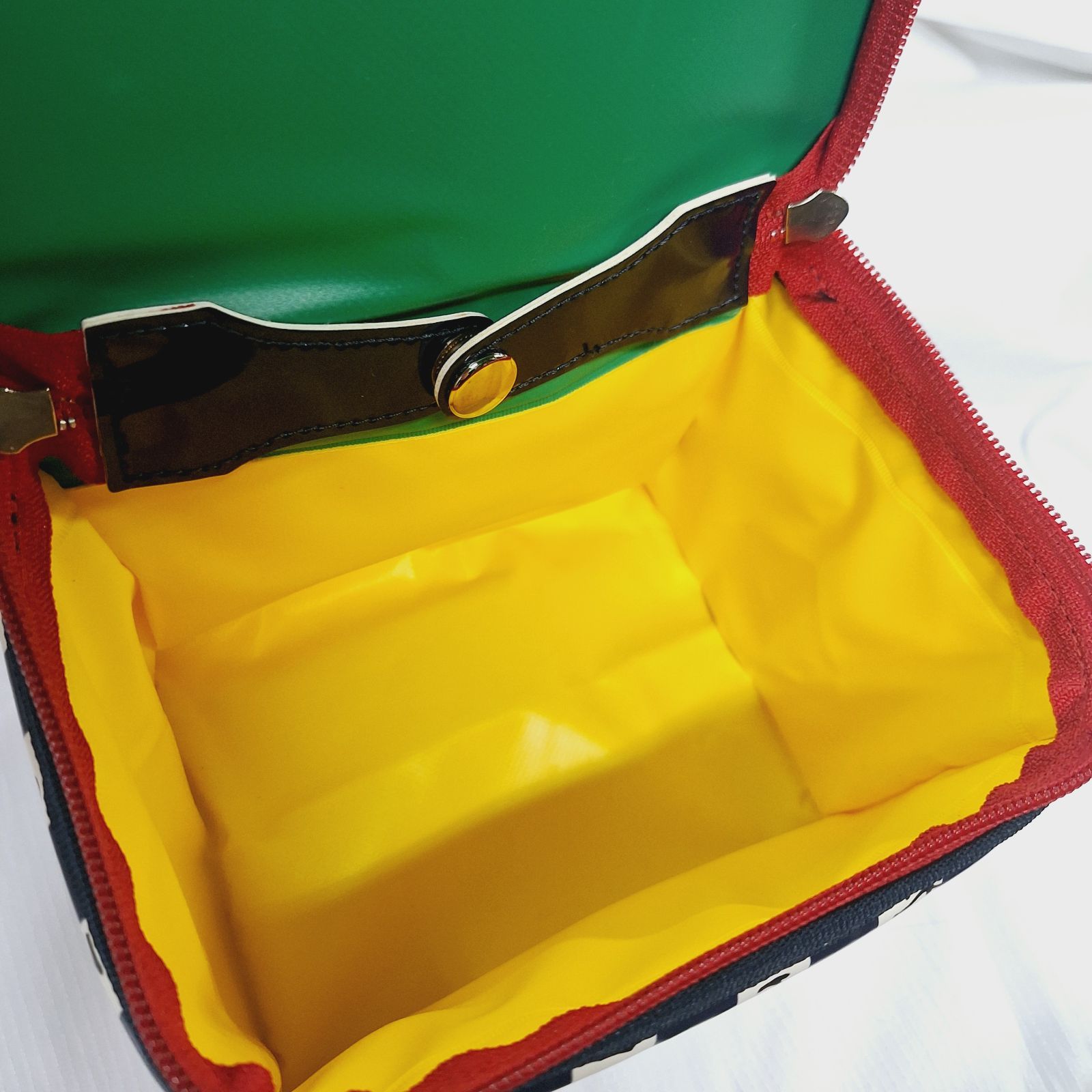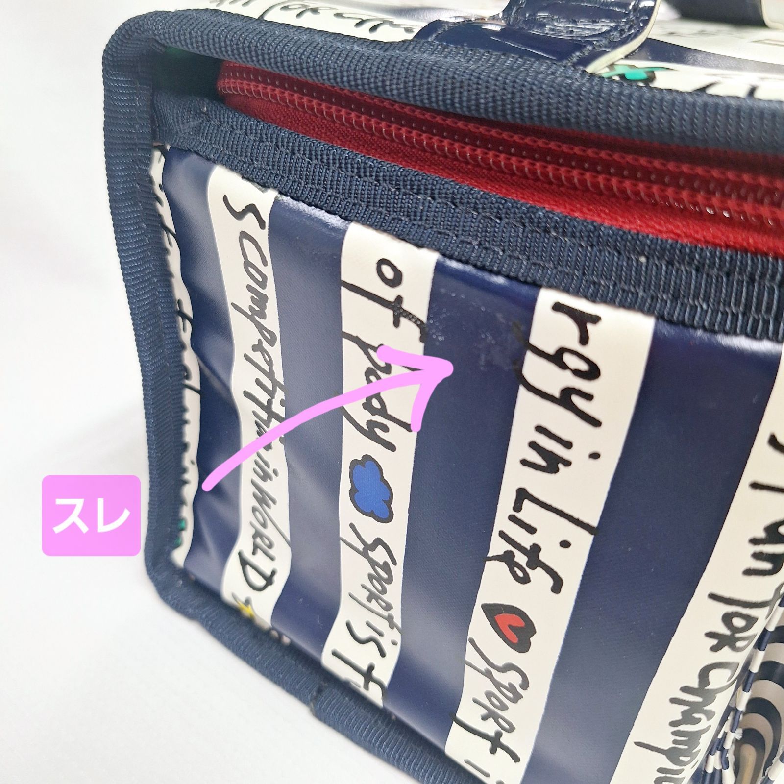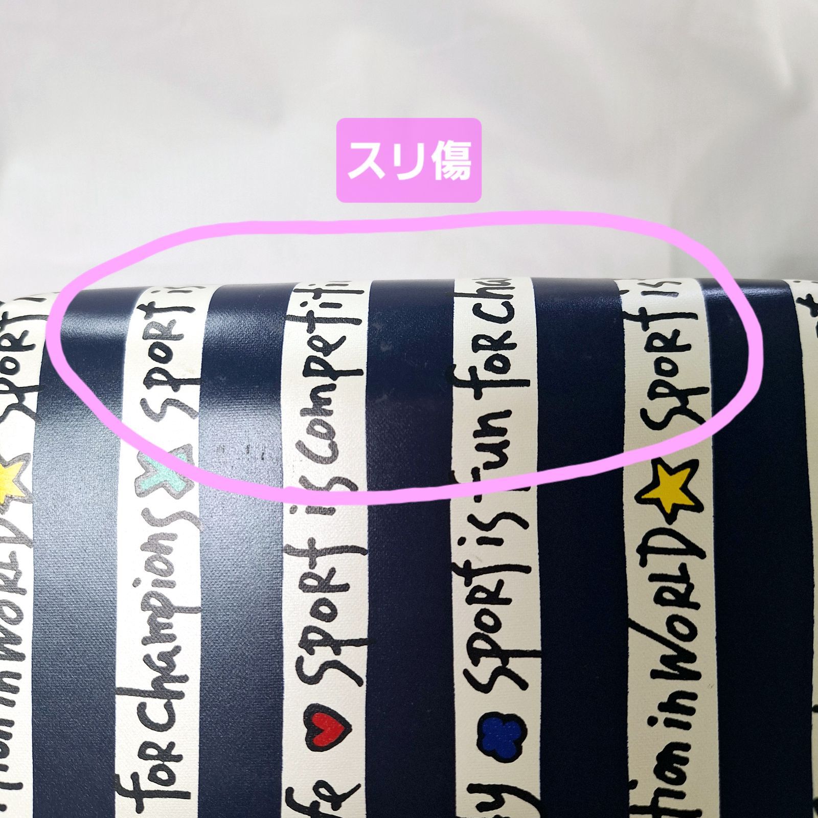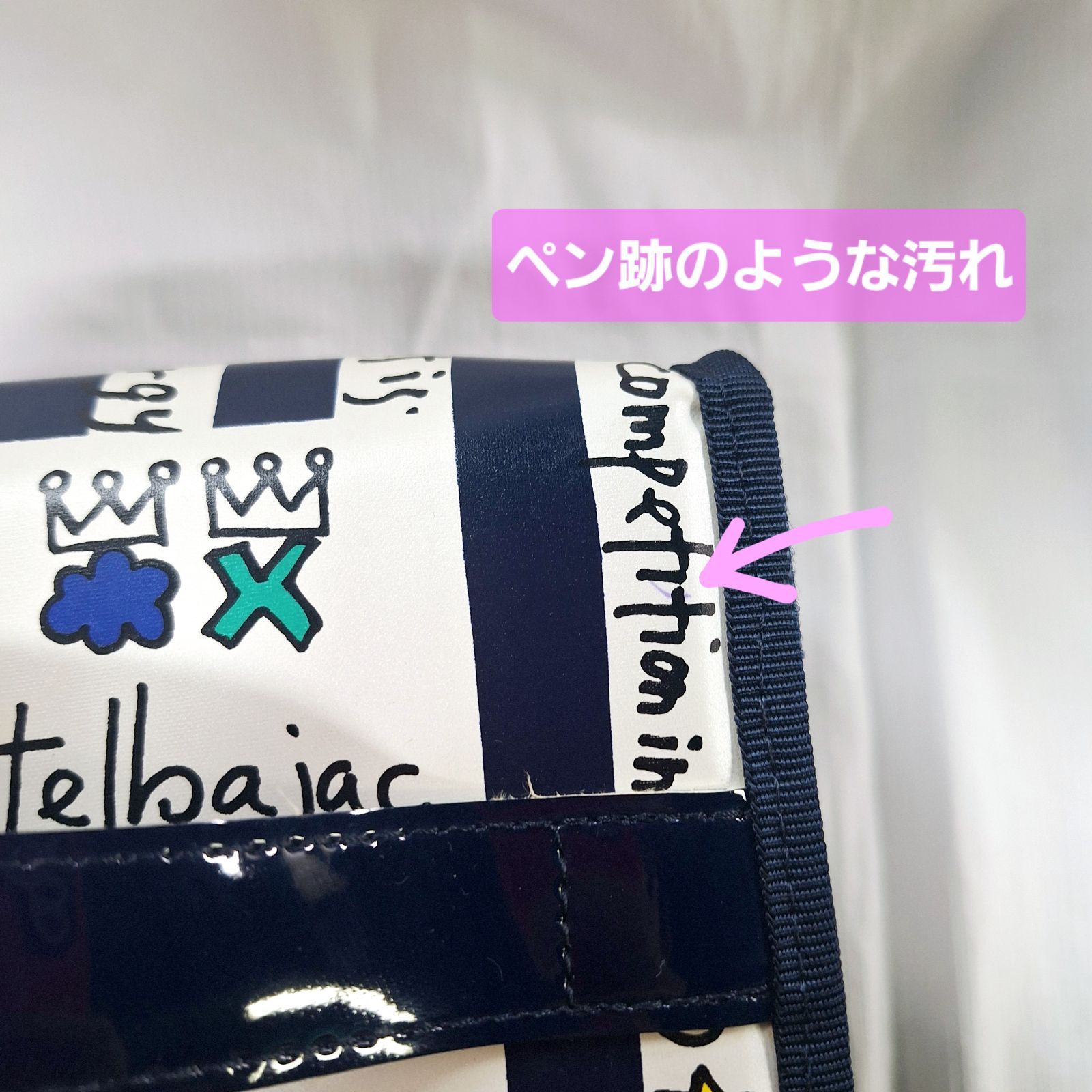 表面一ヶ所、ボールペンで書いたような線(取れない汚れ)があります。その他目立つ汚れはなく内側も使用した形跡がないくらい綺麗です。仕切りがありませんが正面にはうれしいミニポケット付きです。