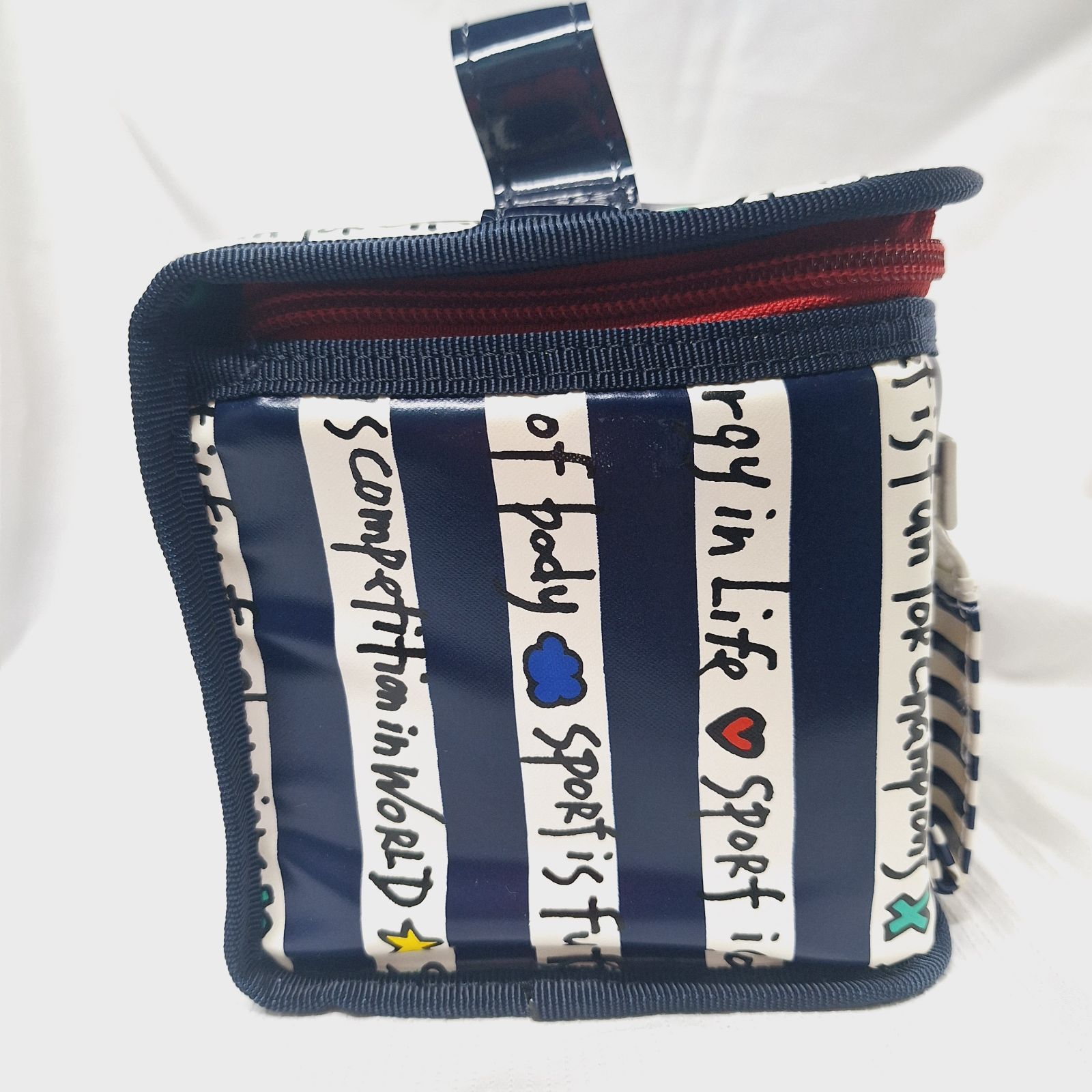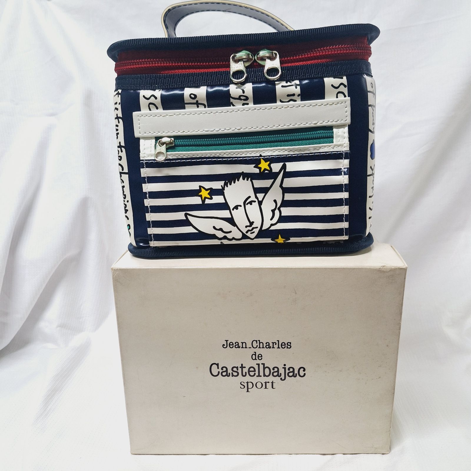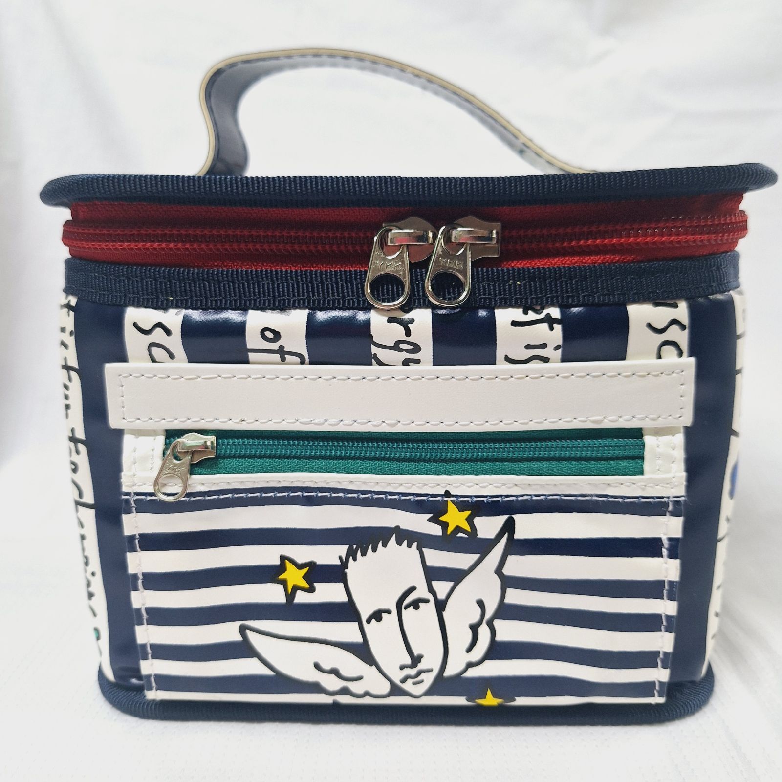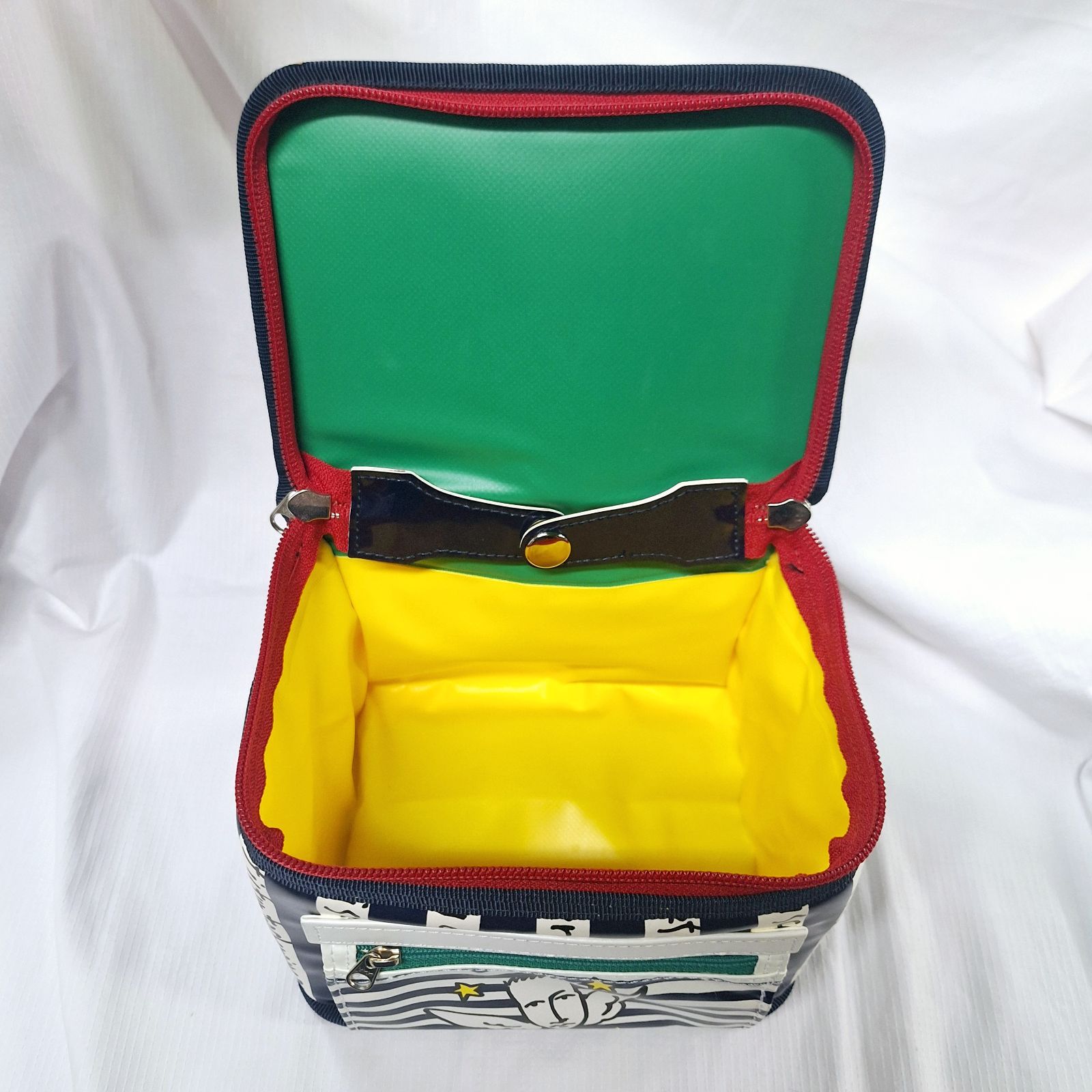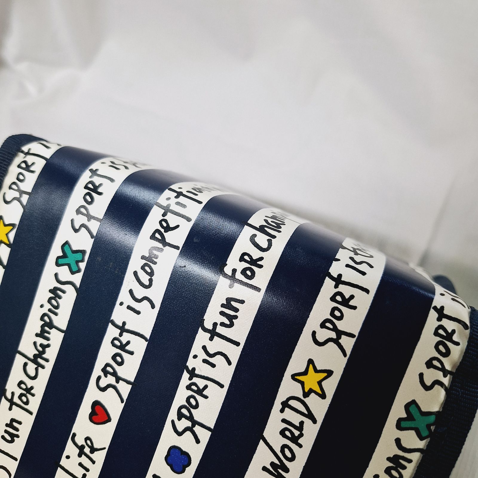 表面一ヶ所、ボールペンで書いたような線(取れない汚れ)があります。その他目立つ汚れはなく内側も使用した形跡がないくらい綺麗です。仕切りがありませんが正面にはうれしいミニポケット付きです。