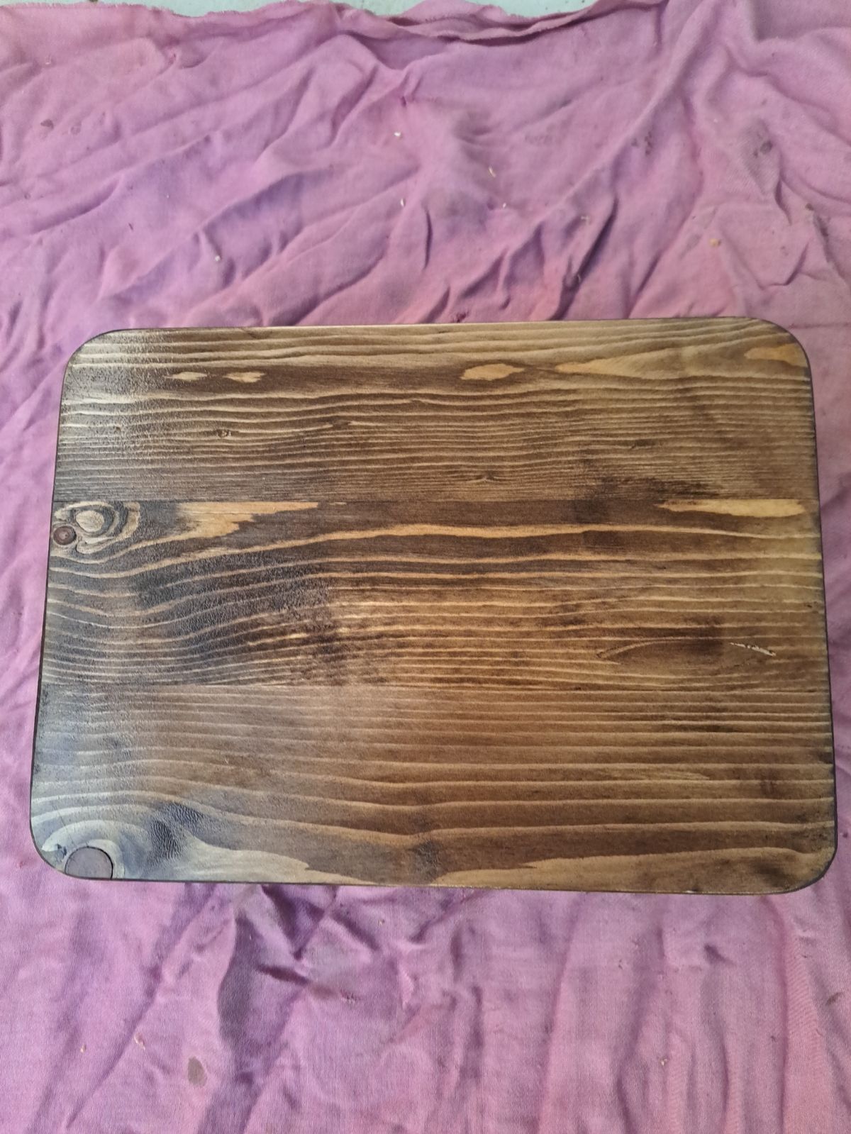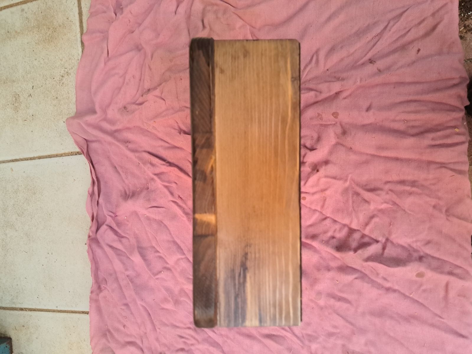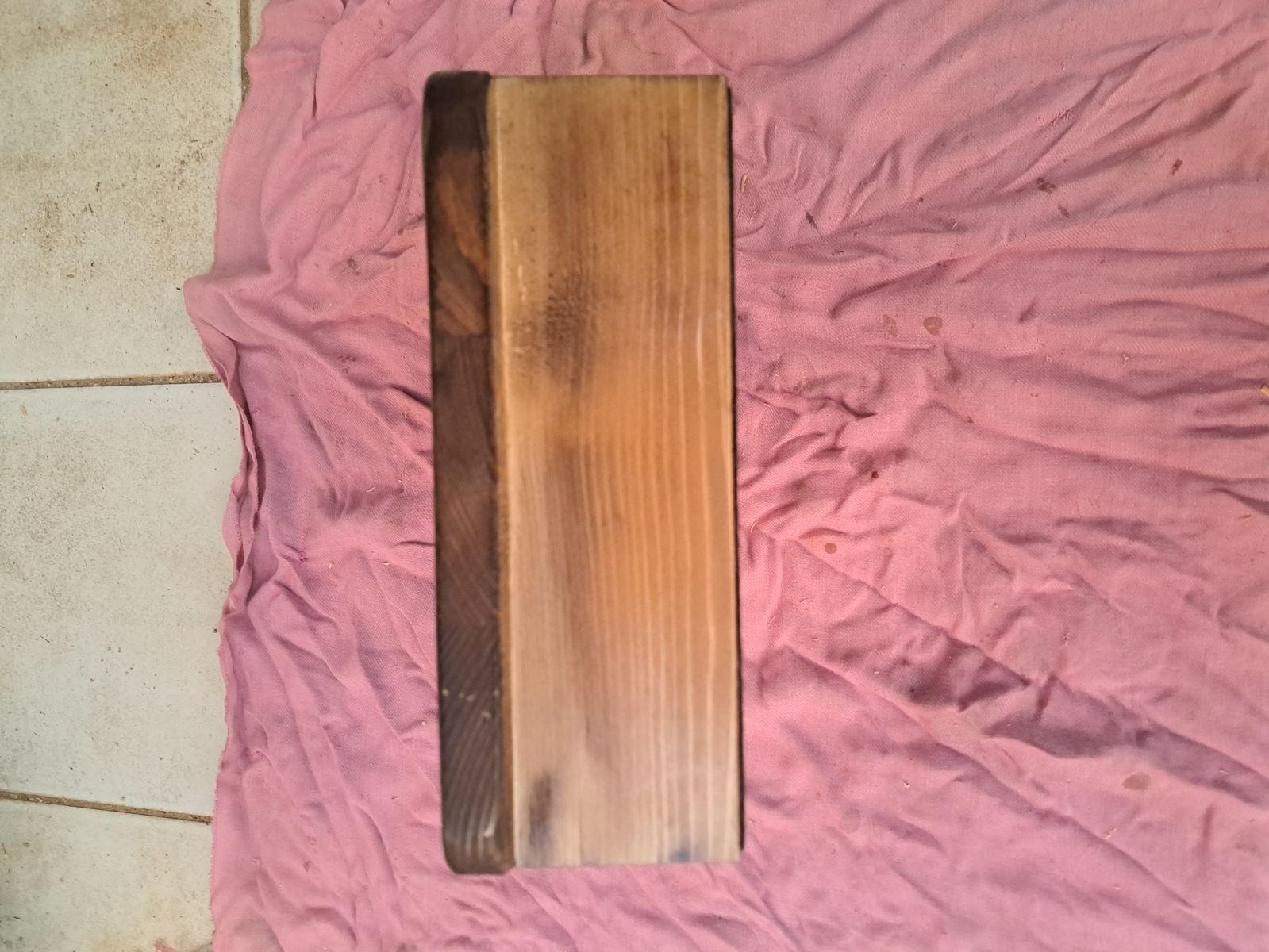 木材はホームセンターのホワイトウッドで横幅320mm奥行き235mm高さ87mmです。 仕上げはヴィンテージ家具風にウォルナット色に着色後にウレタン仕上げです。