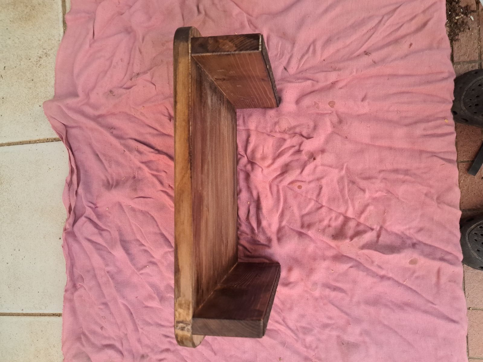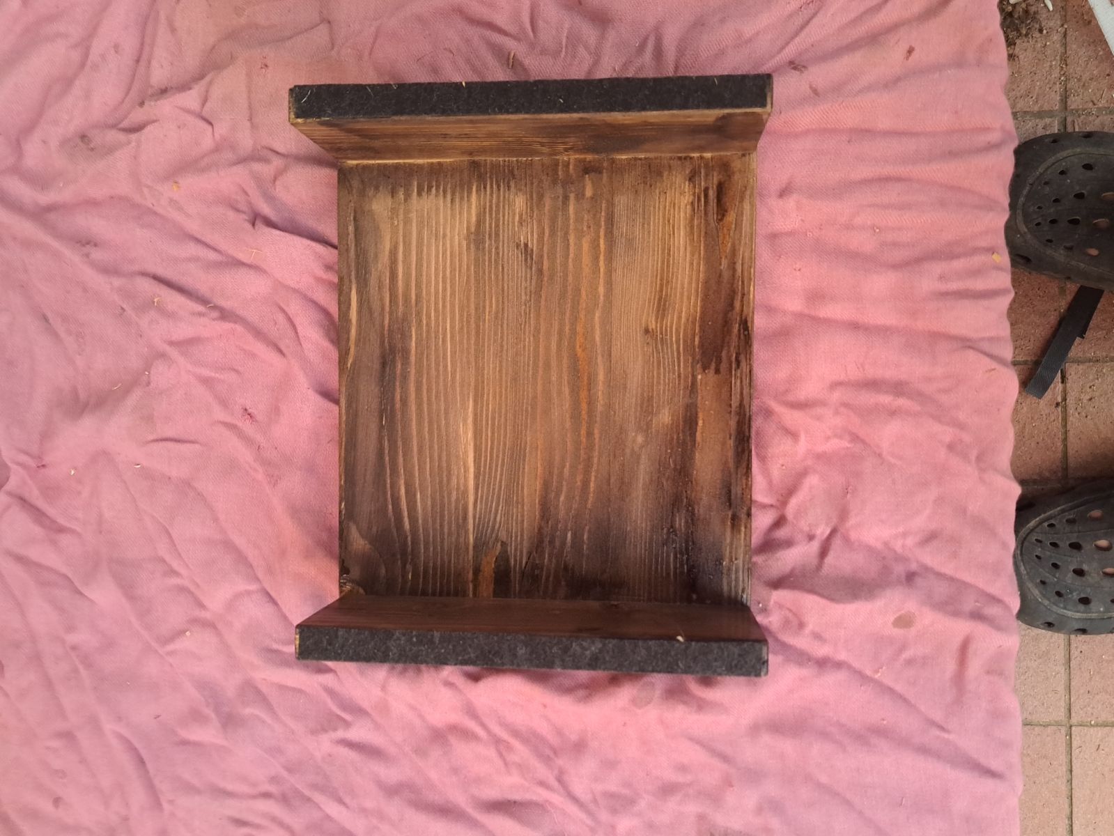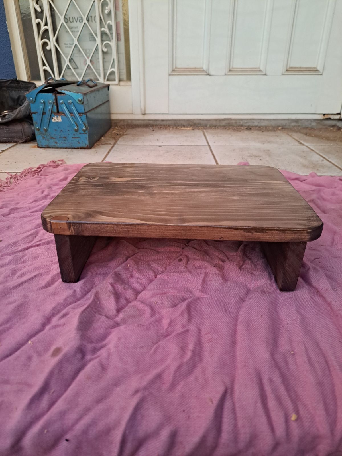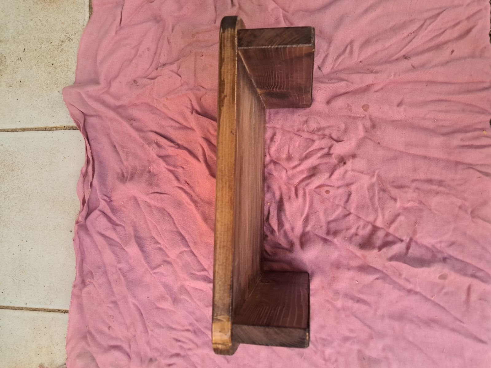 木材はホームセンターのホワイトウッドで横幅320mm奥行き235mm高さ87mmです。 仕上げはヴィンテージ家具風にウォルナット色に着色後にウレタン仕上げです。