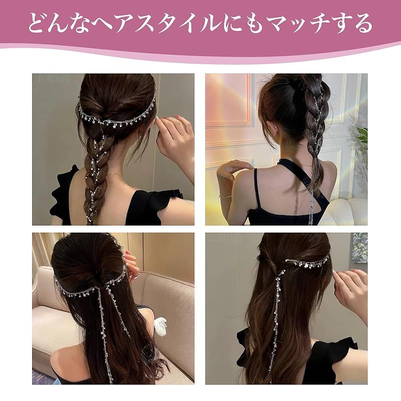 【ラインストーンヘアチェーン】ヘアチェーンに星がついたデザイン、きらめくラインストーンが目を引くヘアクリップ。ポニーテール、ツインテール、またはルーズな髪に適しており、装着しやすく、ポニーテールを差別化することができます。スタイリッシュでユニークな印象を与えます。