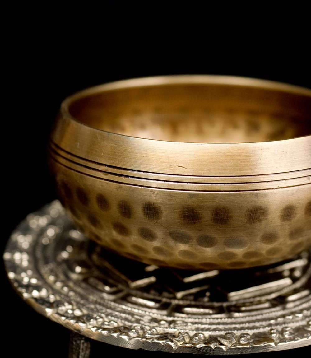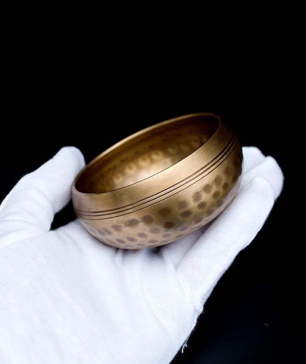 金色に茶色が混ざりあったような美しい色合いのシンギングボウル。なにより一番の特徴は、シンギングボウル全体に施された、ハンマーによる槌目模様です。