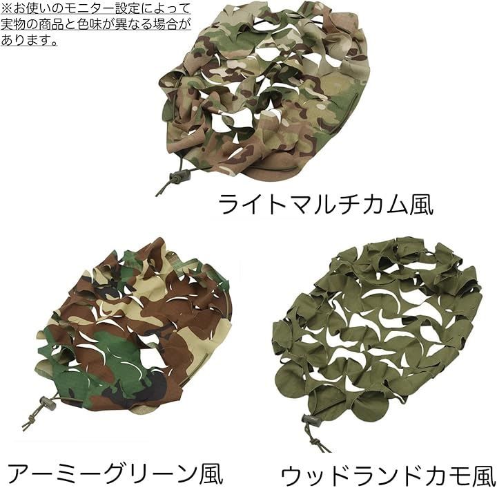 「仕様 」材質:ポリエステル|重量:約50g|カラー:アーミーグリーン風・ライトマルチカム風・ウッドランドカモ風|付属品:本体のみ(ヘルメットは含まれません)