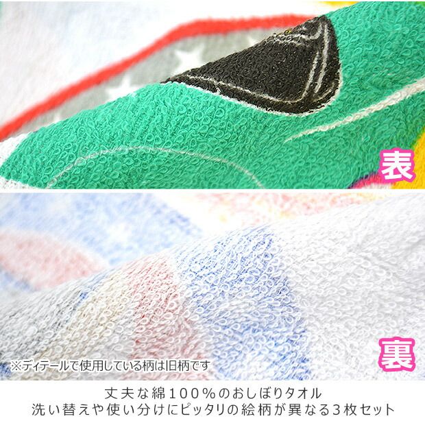 行楽や普段使いに便利なおしぼりタオル3枚セットです。兄弟・姉妹用や、毎日の洗い替え用に、何枚あってもいいですね♪