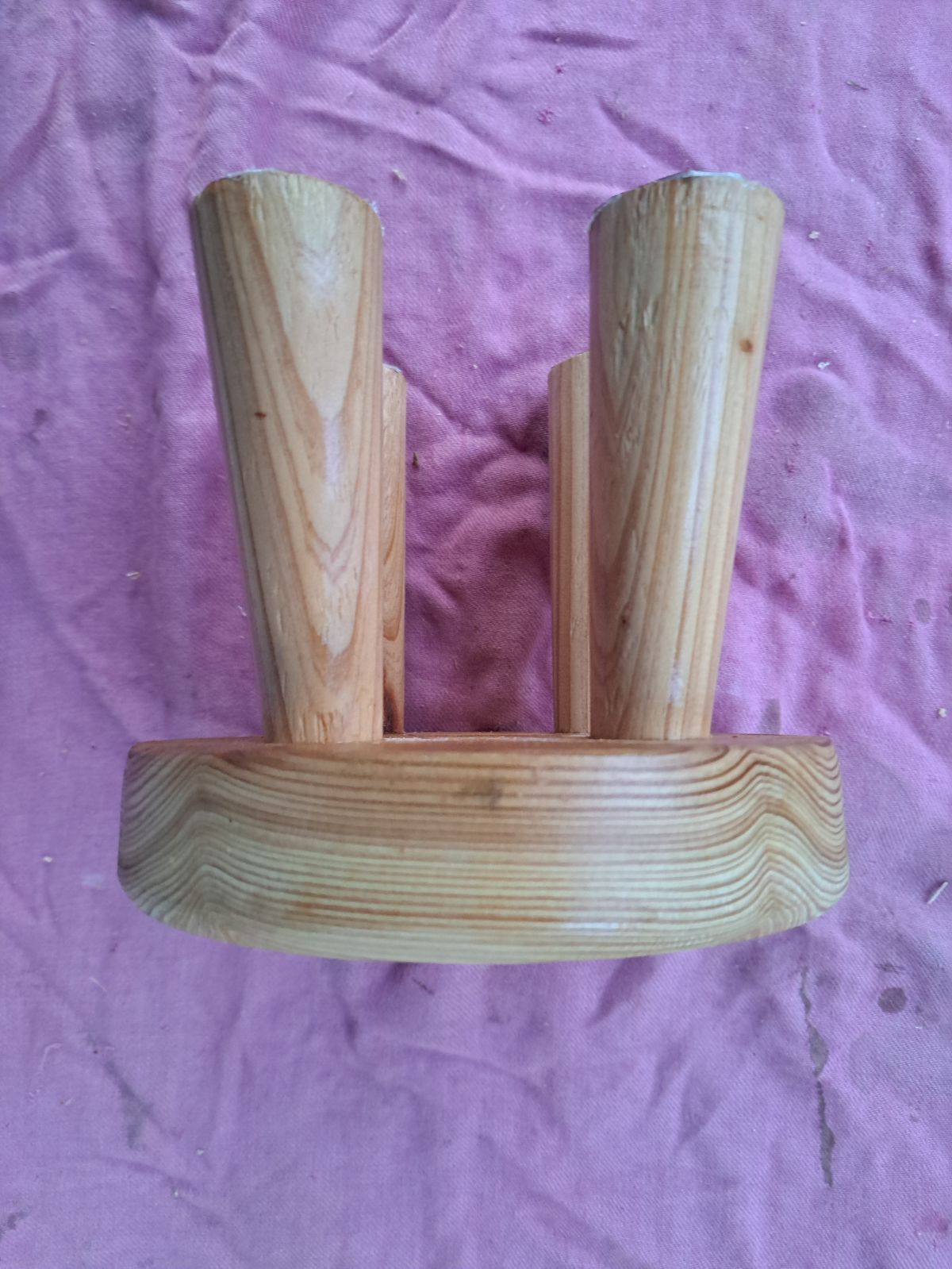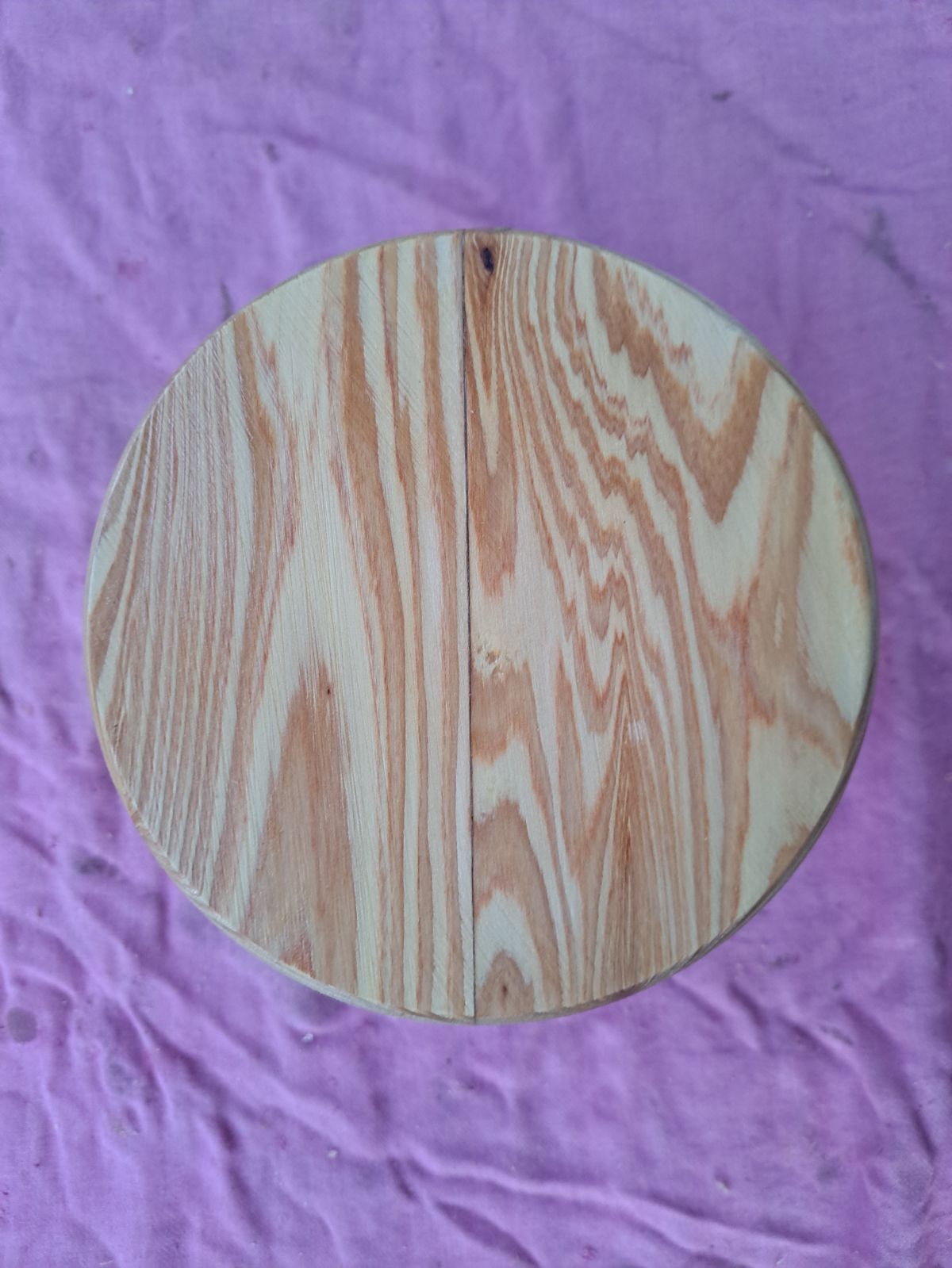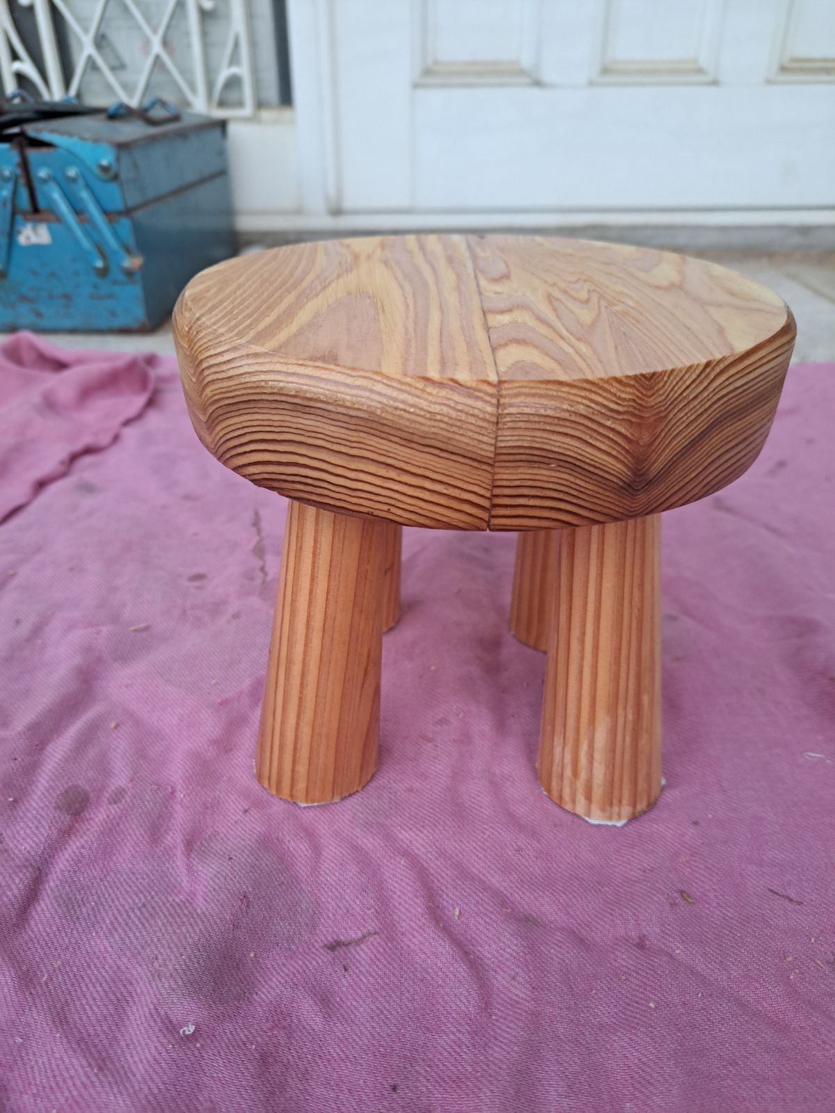 趣味で木工してます。 木工作業で出る廃材や端材を何かの形にと考え出来上がった作品です。 座面は杉板で直径178mm厚さ35mmです。 足は杉で通常と逆に末広型にして見ました。太い処の直径は40mmです。 座面の高さは150mm(およそです)仕上げはウレタン仕上げです。 ※発送前にはガラス面上でガタツキ調整して発送しますが設置環境が変われば多少ガタツキが出るかもしれませんが、その場合にはフェルト等貼り付けで調整してください。 玄関 屋内下駄箱の上等インテリアに如何でしょうか?木製品なので雨の当たる所は苦手です。 素人の手作り品で廃材等の端材利用の為節や割れや釘抜き穴埋めや塗装むらや足の太さのばらつきはありますが、それも手作り感とご理解下さい。依って家具屋さんで見るような高級家具と比較されては困ります。 鉢植え ぬいぐるみ 小物雑貨等オシャレに飾ってお楽しみ下さい。 構造的には本格的ほぞ穴加工で組み立てていますが、目的以外の使用は避けて下さい。 がっちり太い材料で作っていますので子供椅子としてもお使い頂けます。