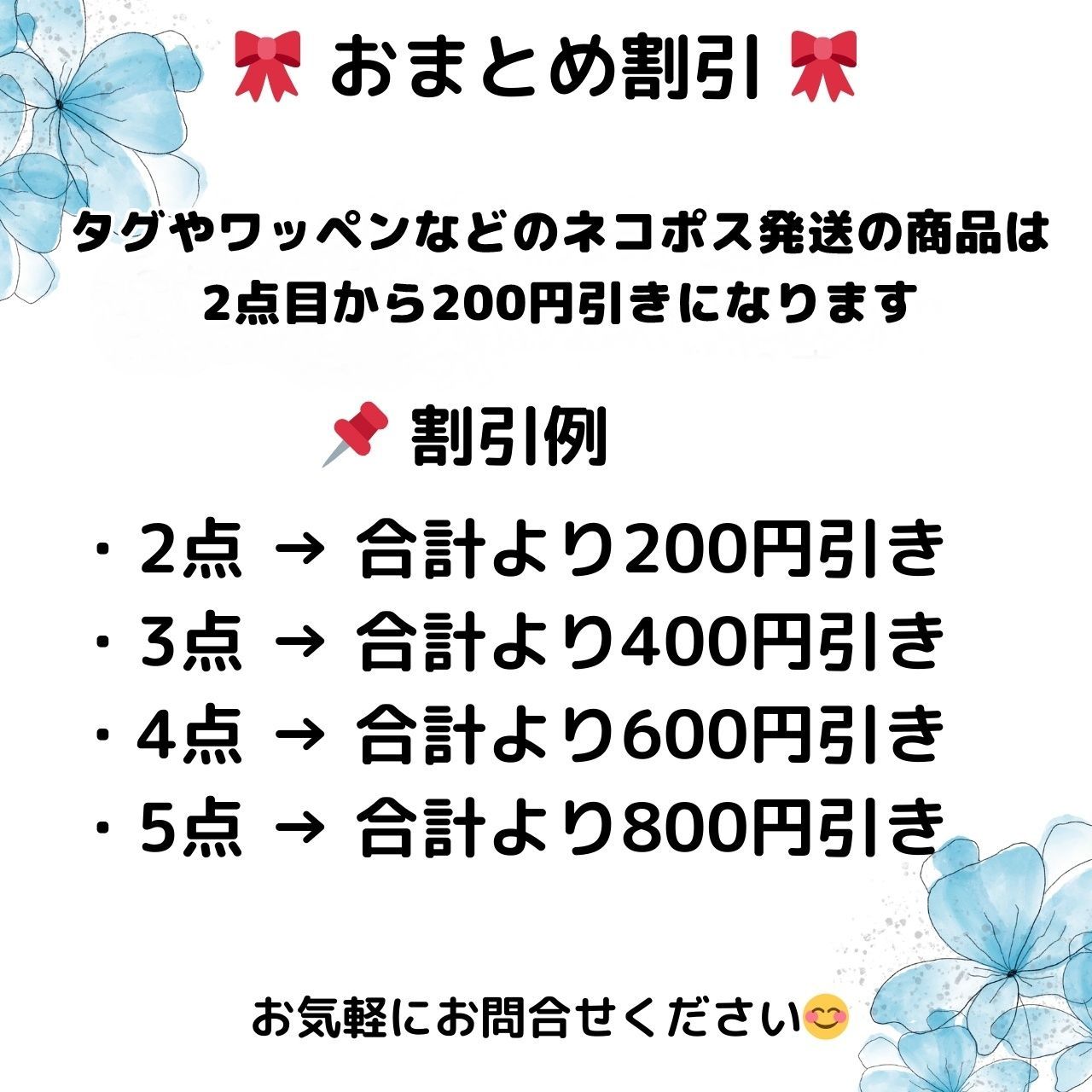 ネコポス発送の商品は、2点目から200円引きさせていただきます。