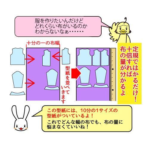 10分の1サイズがついているので、縫う前に布の量や縫う手順が確認できます。