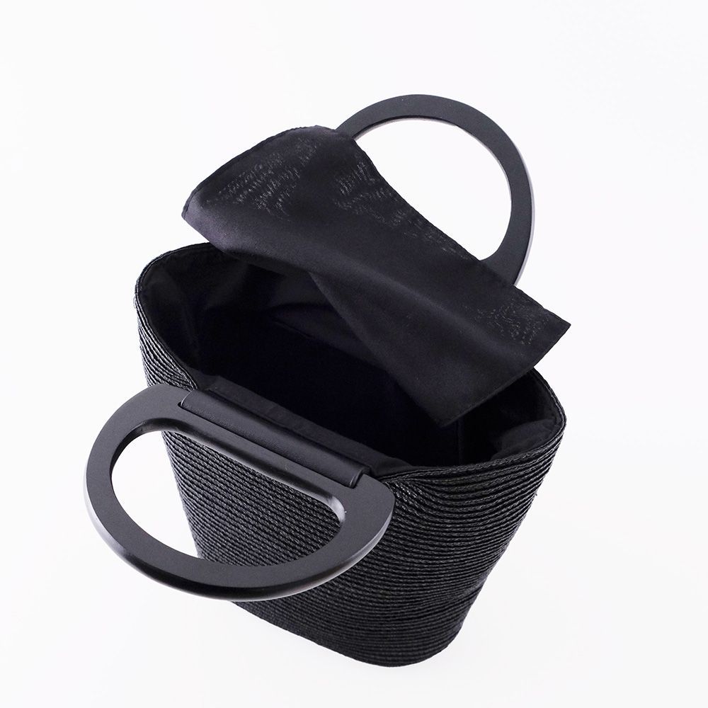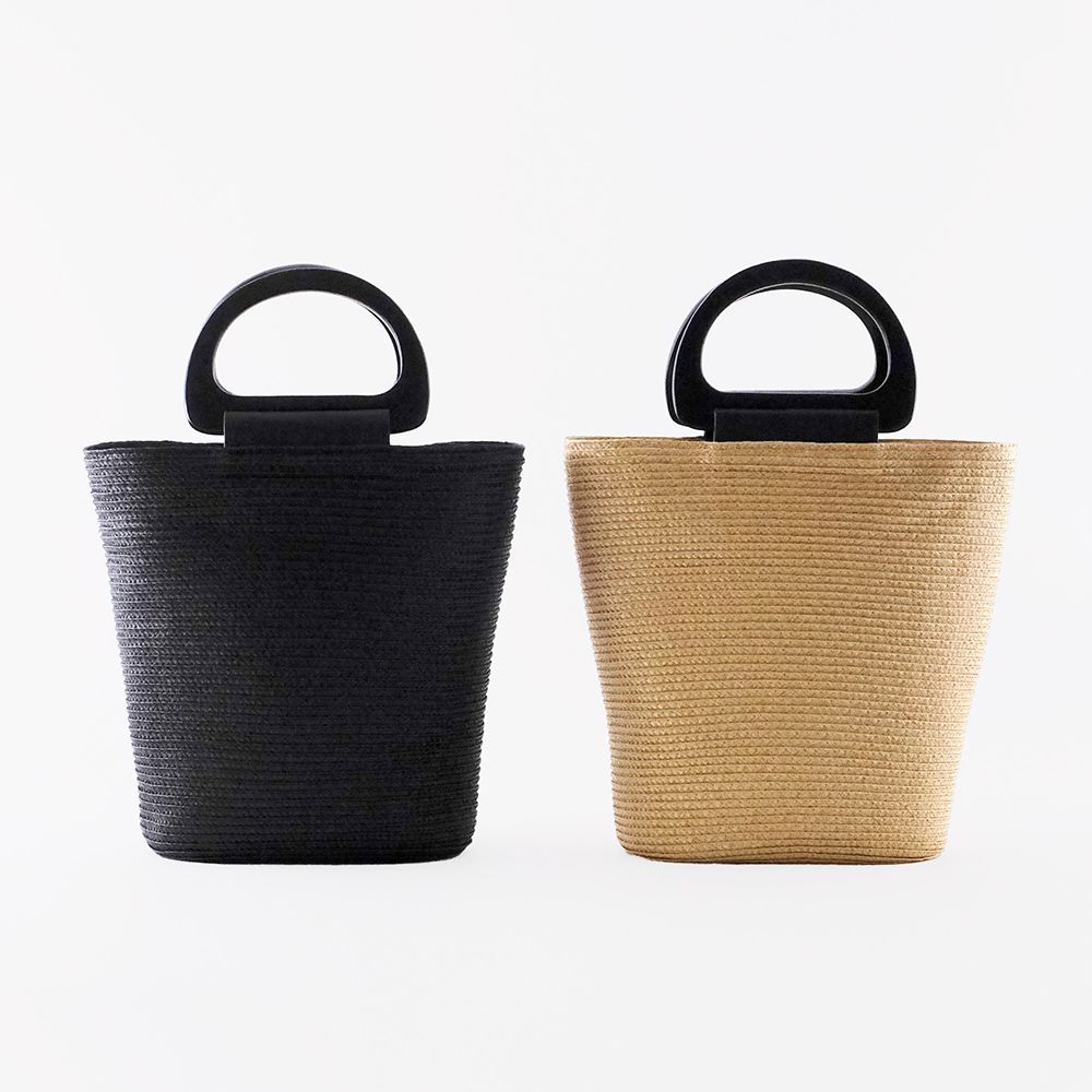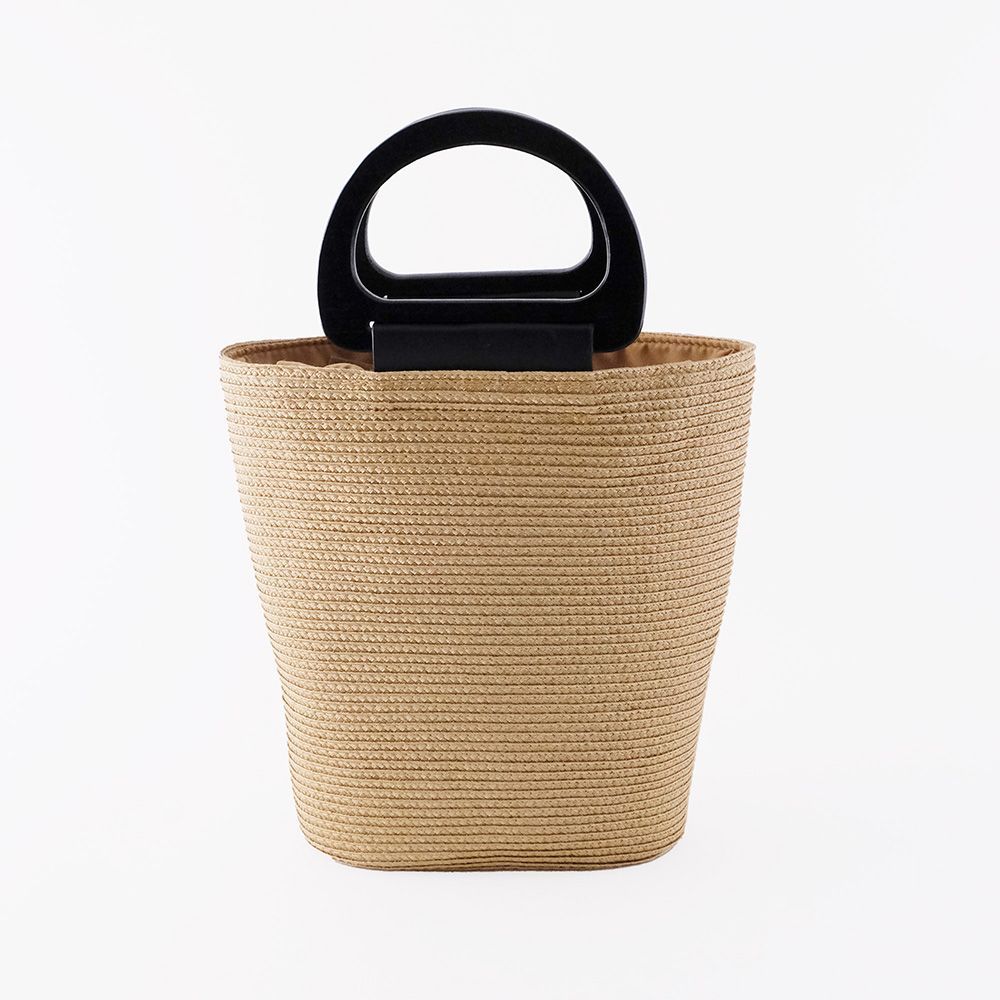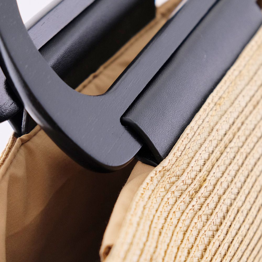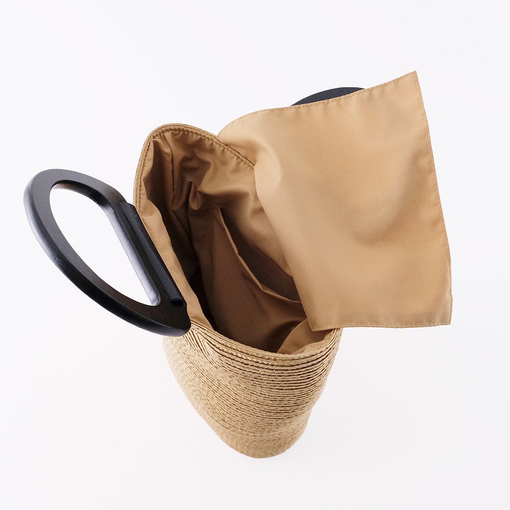 軽さがうれしいポリプロピレン素材のバッグには握りやすいラウンド型のウッドハンドルを採用しています。コーディネートし易いシックな色合いと上品な光沢が、大人の女性や母の日のギフトにもピッタリです。外出時に物が増えても容量にゆとりが出るよう、開口部はカーバー布を付けています。財布にスマホ、化粧ポーチ、真夏のお出かけ時に買った飲み物(ペットボトル)を入れても、上から被せるだけで中身が見えにくい安心仕様です。