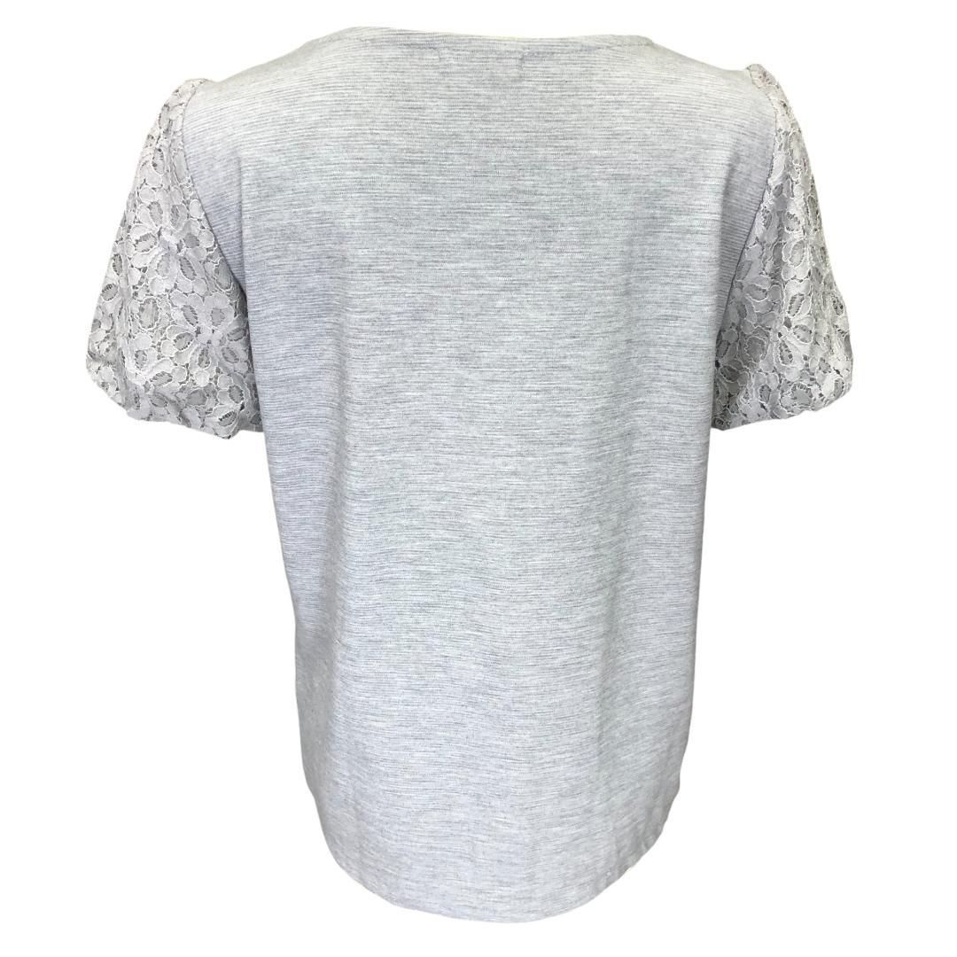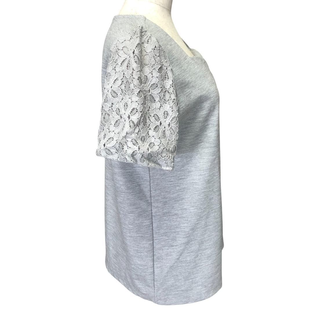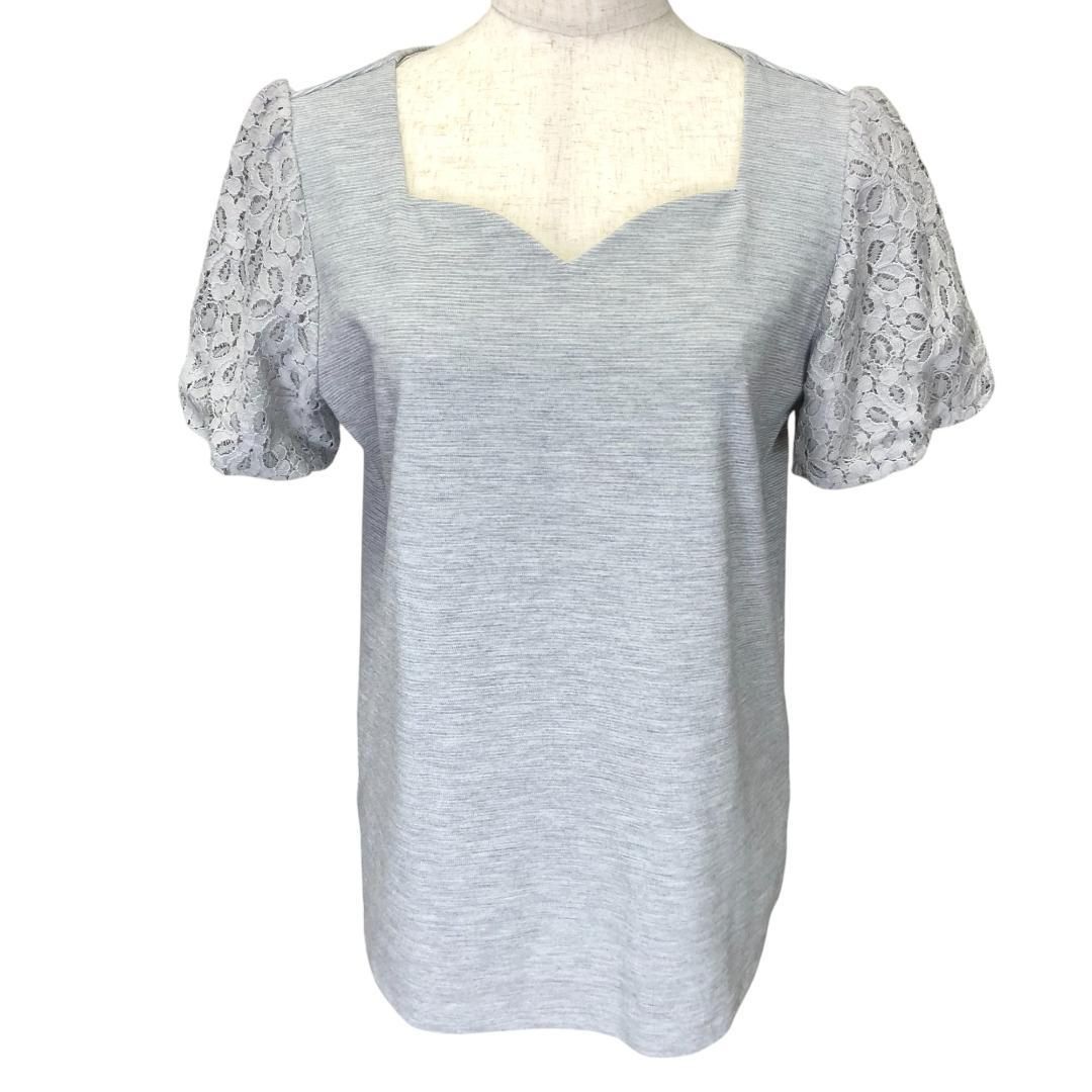 襟元のカットと花柄のレース袖が素敵なトップスです。上品なグレーの色合いで、様々なコーディネートに合わせやすい一枚です。袖裏のみ裏地付きです。