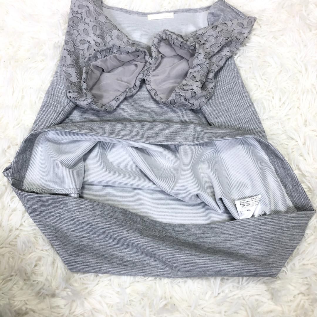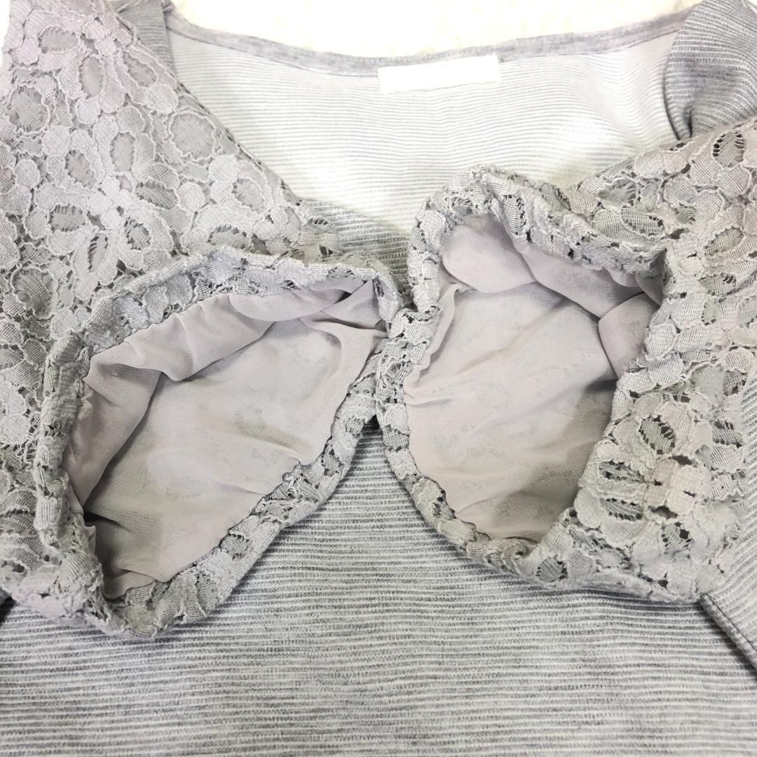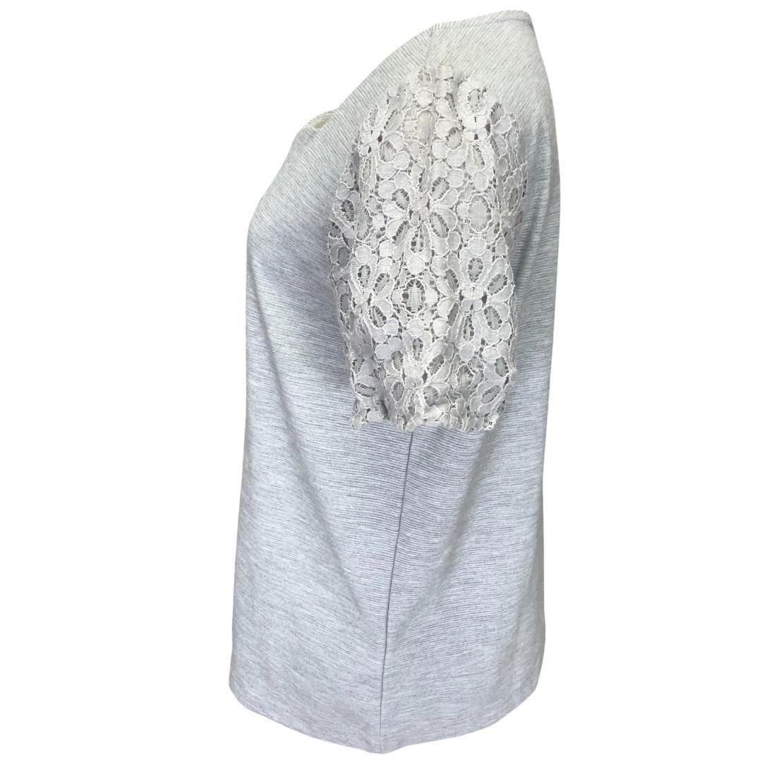 襟元のカットと花柄のレース袖が素敵なトップスです。上品なグレーの色合いで、様々なコーディネートに合わせやすい一枚です。袖裏のみ裏地付きです。