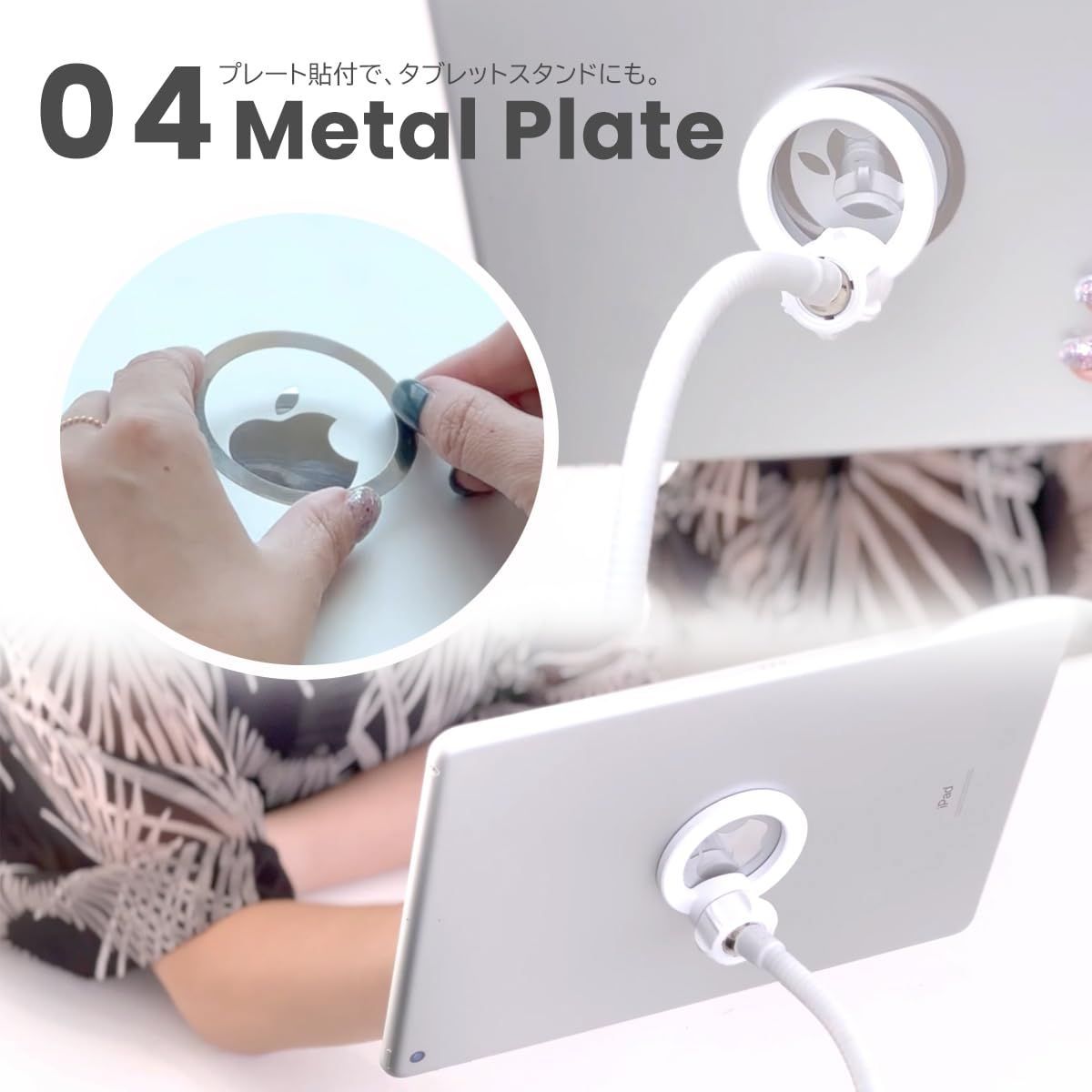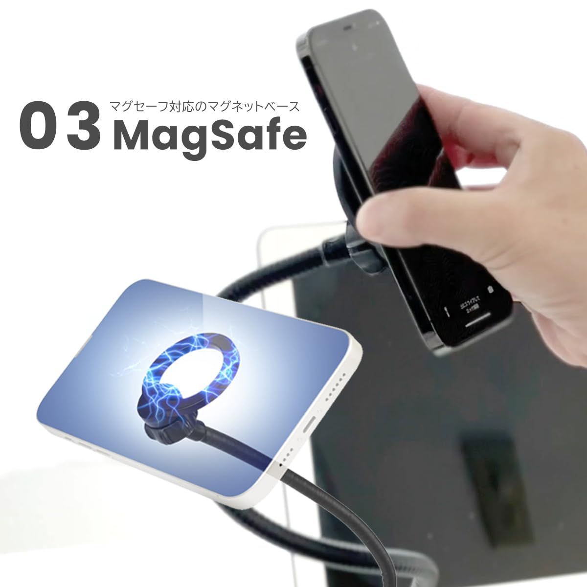 【MagSafe対応型スマホアームスタンド】片手で手軽に使用できるフレキシブルアームです。角度を自由に調整し、シーンに合わせて使用できます。付属のメタルプレートをスマートフォンに貼付することで、MagSafe非対応機種でも吸着させることができます。