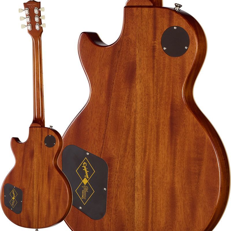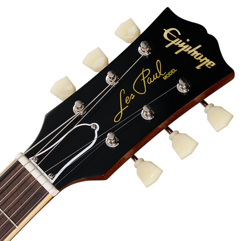 ネックにはワンピース・マホガニーを使用し、50年代スタイルのラウンド・ミディアムCプロファイルとロングネック・テノンを採用。安定した演奏性と豊かなサステインを実現します。バインディングを施したローズウッド指板にはマザー・オブ・パールのトラペゾイド・インレイを備え、22本のミディアム・ジャンボ・フレットを搭載。ギブソンと同様のオープンブック型ヘッドストックには、エイジド加工を施したマザー・オブ・パールのEpiphoneロゴと、シルクスクリーン印刷されたゴールド色の「Les Paul Model」の文字が入ります。さらに、サイドドットの位置やサイズまで1957年当時のLes Paul Standardと同様に設計されています。