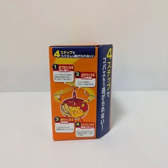 ・強力誘引角切りゼリーと止まり木効果のある容器形状により、容器の先端の止まり木に止まったコバエは、容器内部に設けた誘導路により確実にポット内のゼリーに誘導され、角切りゼリーがコバエをしっかりキャッチして逃がさず殺虫します。