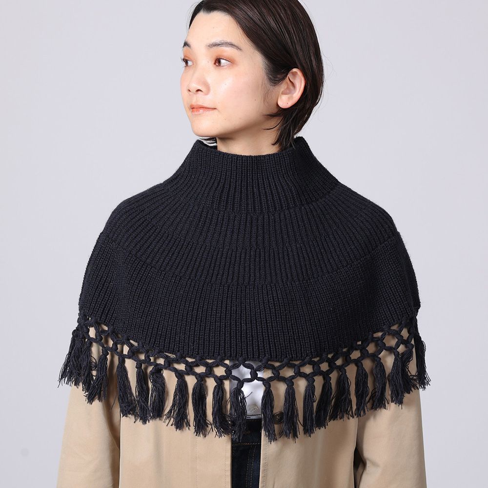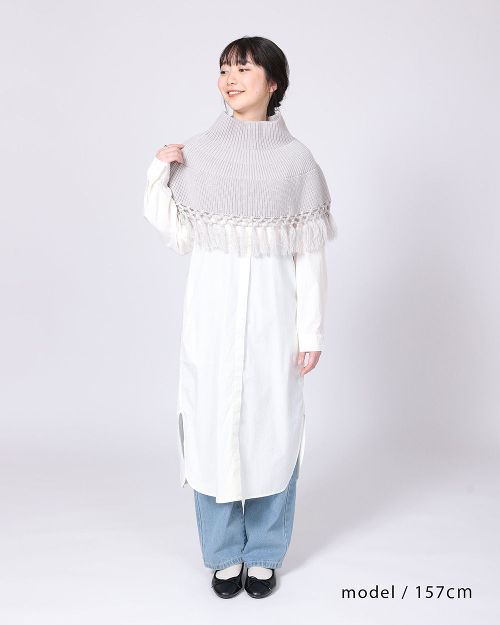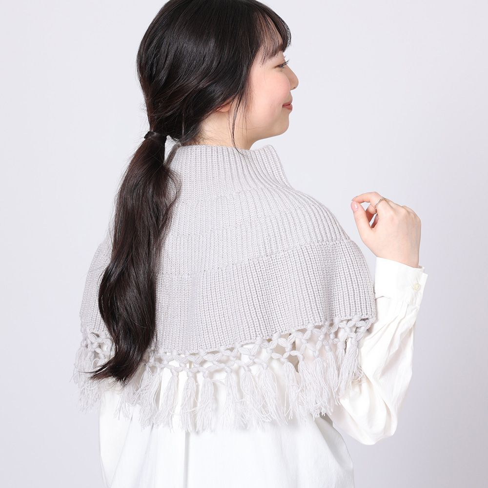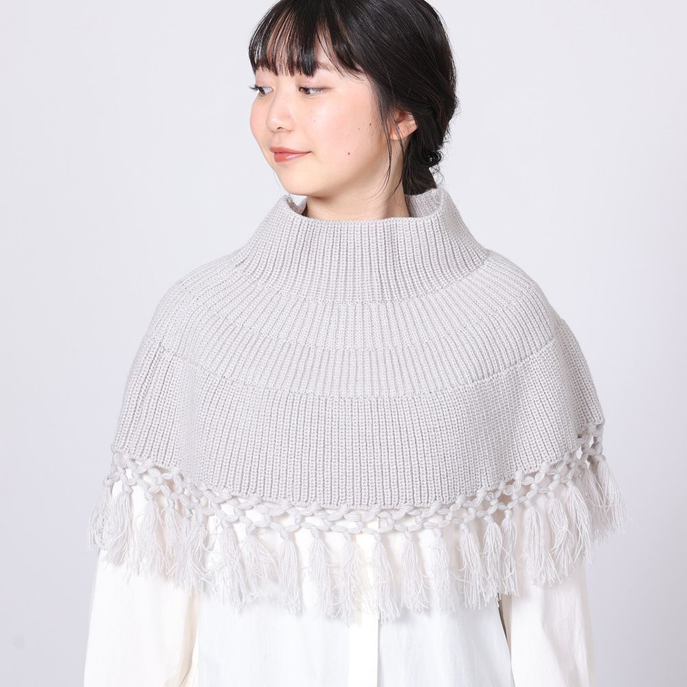 4段リブのケープは、切り替えごとに編み目を増やして、なだらかなラウンド型に仕上げました。肩周りをふんわりと暖かく包んでくれるシルエットです。初秋はシャツなどのトップスやワンピースの上から、もちろんアウターの上に重ねて着用することもできます。一つ一つ手作業で編み付けしたフリンジがシーズンライクな印象に仕上げてくれます。