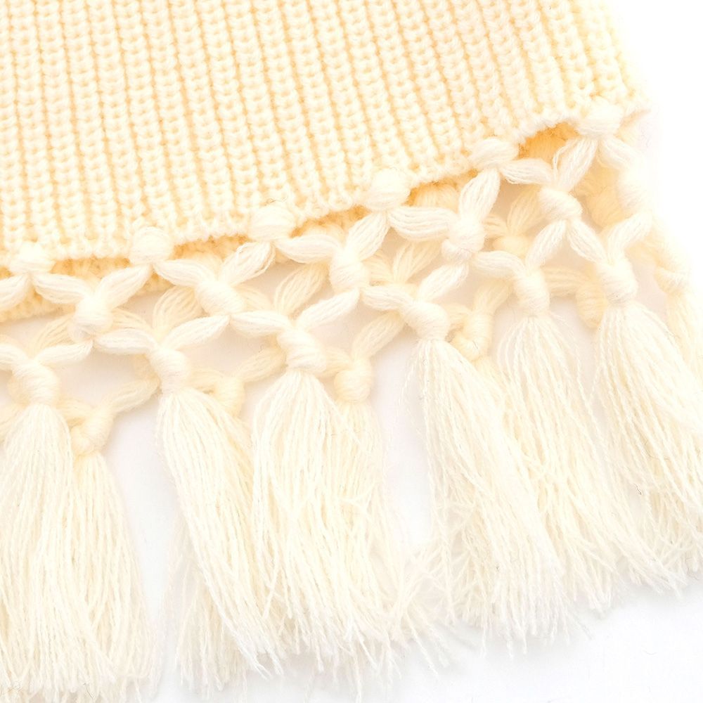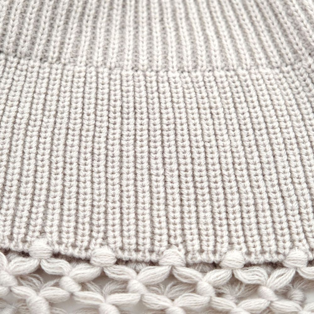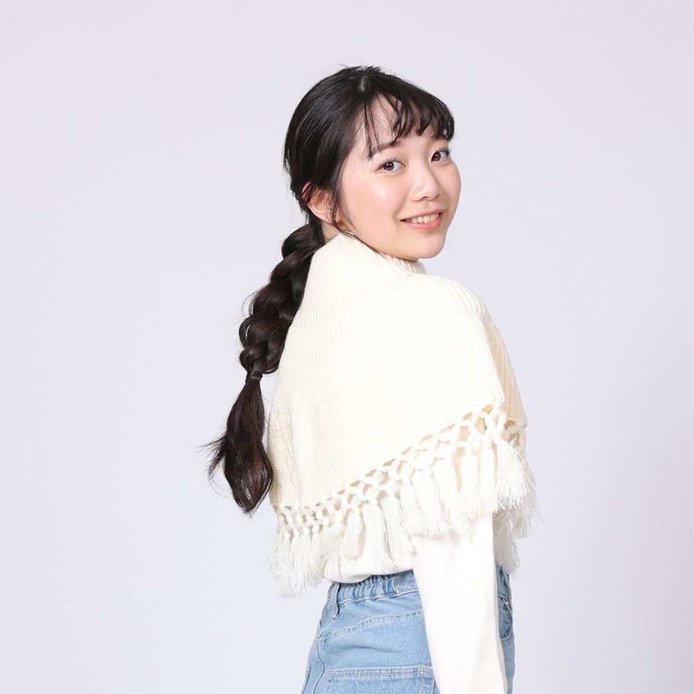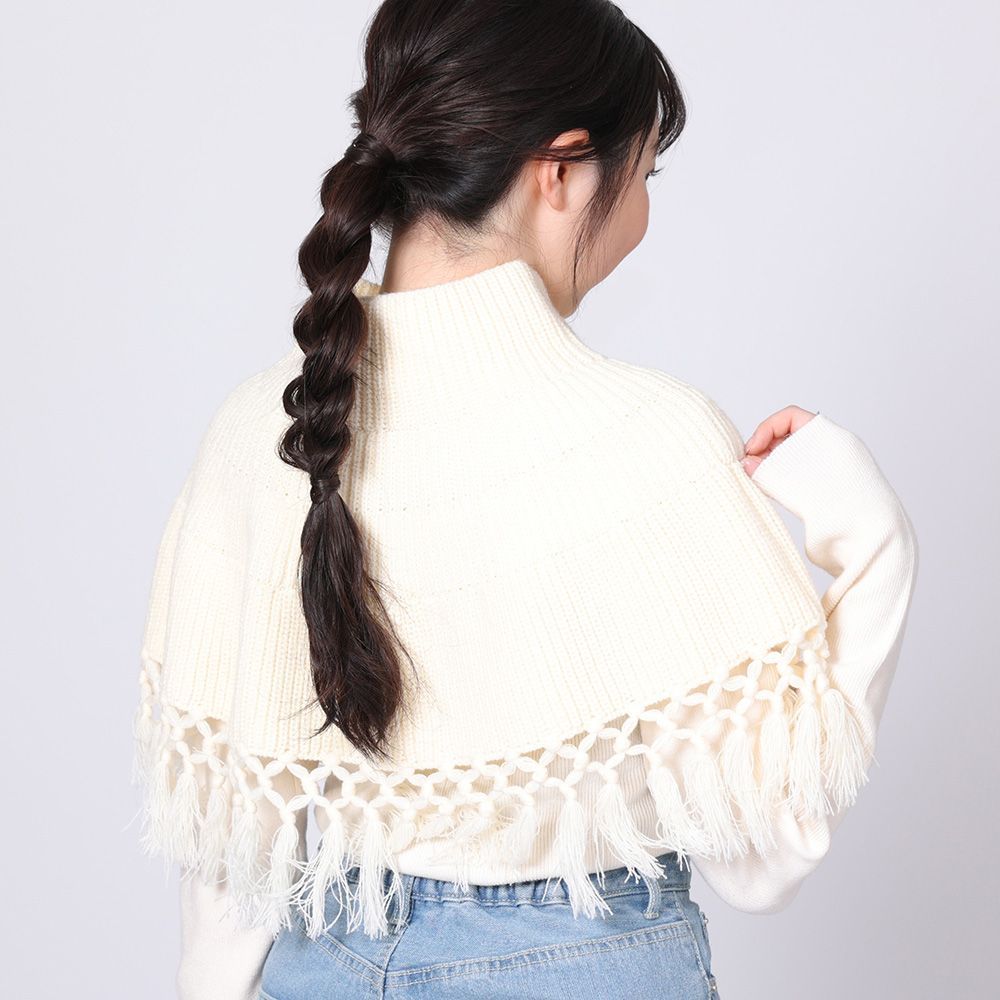 4段リブのケープは、切り替えごとに編み目を増やして、なだらかなラウンド型に仕上げました。肩周りをふんわりと暖かく包んでくれるシルエットです。初秋はシャツなどのトップスやワンピースの上から、もちろんアウターの上に重ねて着用することもできます。一つ一つ手作業で編み付けしたフリンジがシーズンライクな印象に仕上げてくれます。