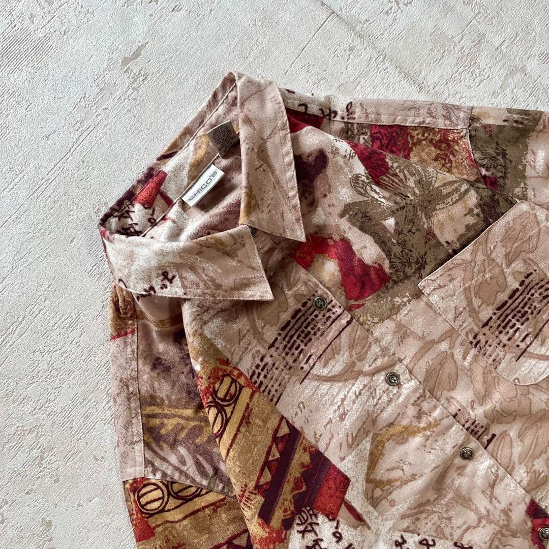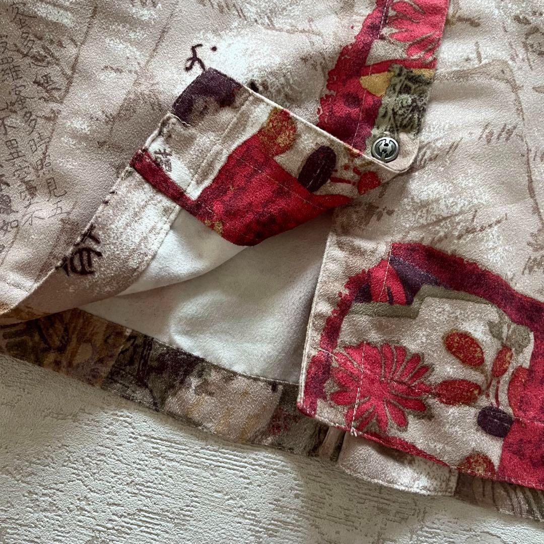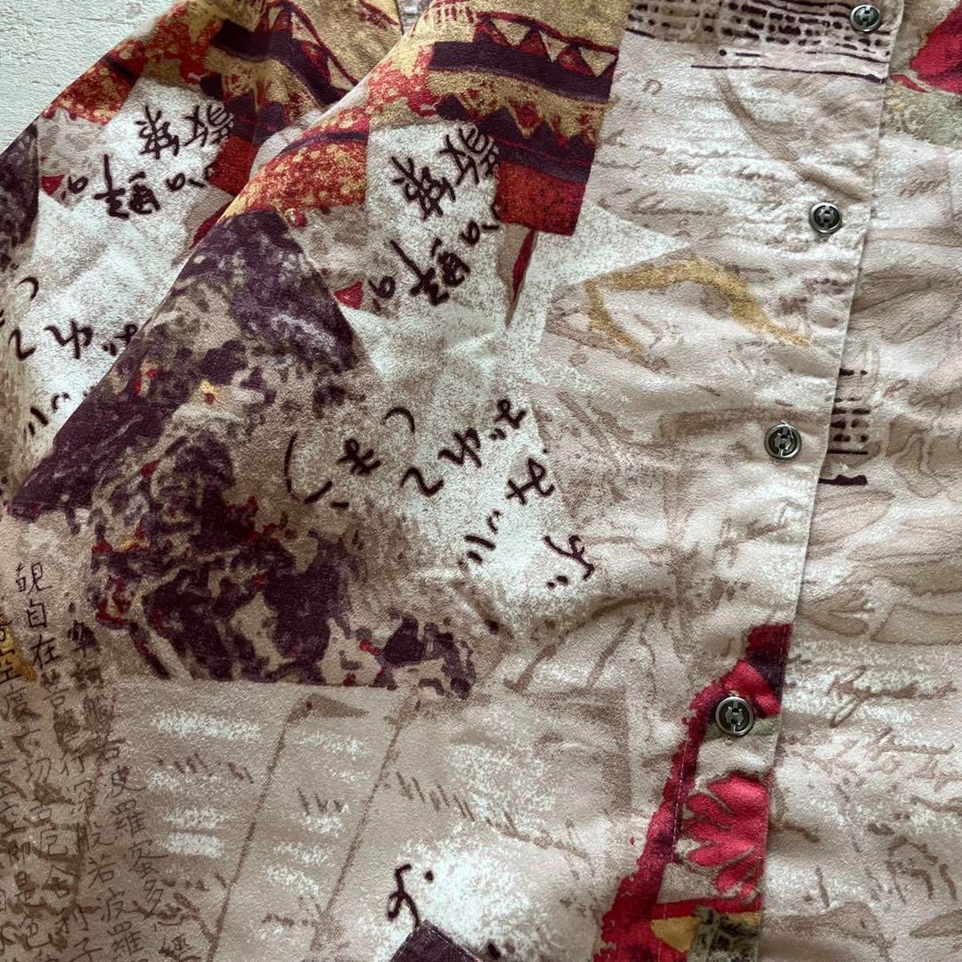 希少な総柄シャツジャケットです。ベージュ系をベースに、赤やブラウンを織り交ぜたアート調のプリントが存在感を放つ一枚。しっかりとした生地感で、シャツとしてはもちろん、軽い羽織りジャケットとしても活躍します。ユニセックスで着用可能なデザインは、古着コーデやレトロスタイル好きの方におすすめ。スラックスやデニムとの相性も良く、幅広いシーンで着回しできます。状態も良好で目立ったダメージはありません。個性を引き立てる1着をぜひ。