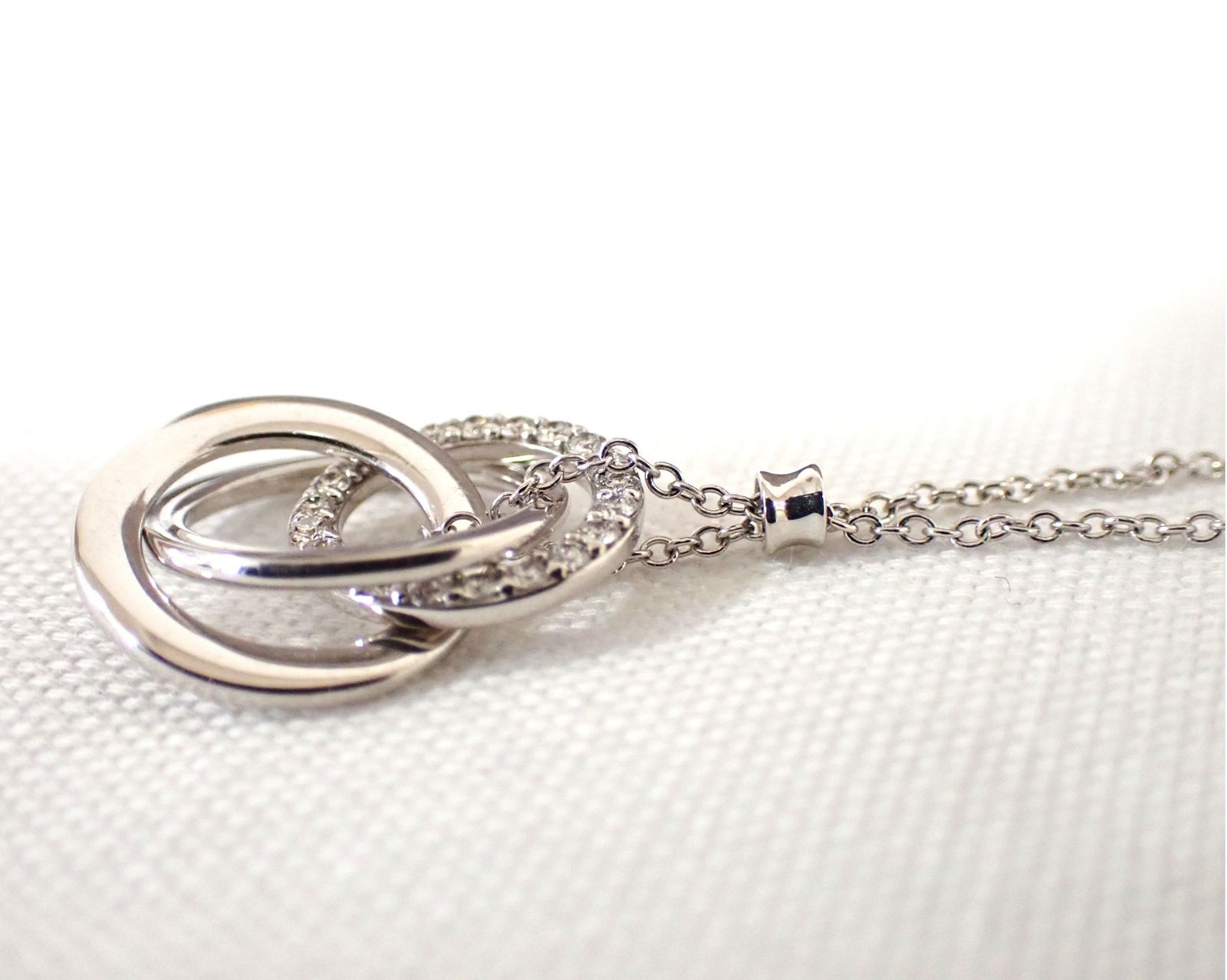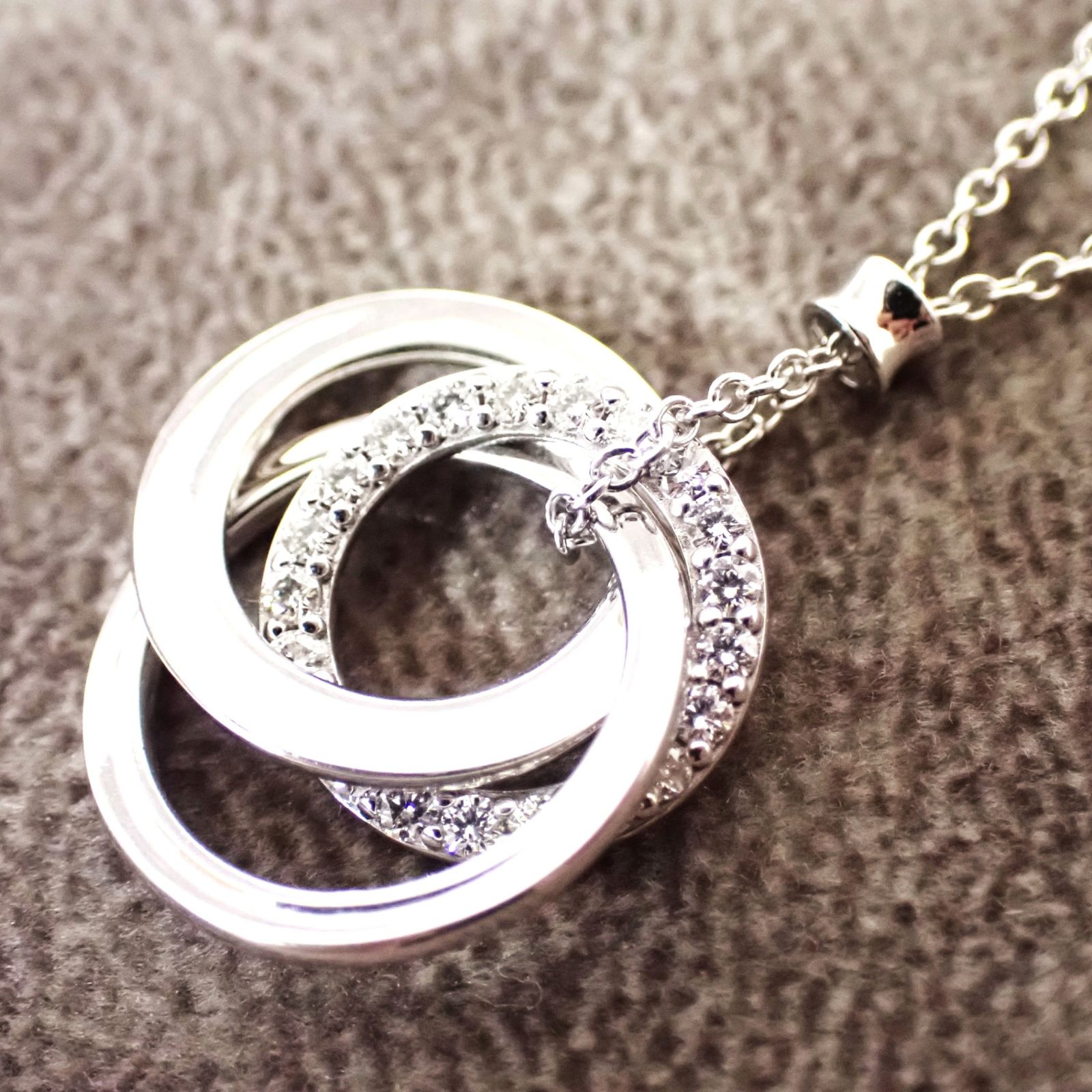 ホワイトゴールドの輝きとダイヤモンドの輝きが重なり胸元を艶やかに彩ってくれる一品でございます。