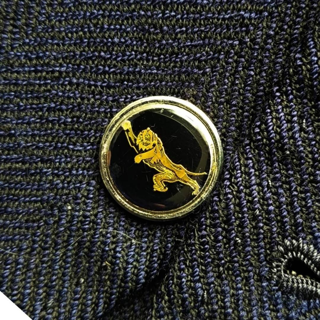 このジャケットの主役は、なんといっても英国の紋章を思わせる、勇ましいライオンが描かれたメタルボタン。Vゾーンに圧倒的な品格と物語性を与えます。