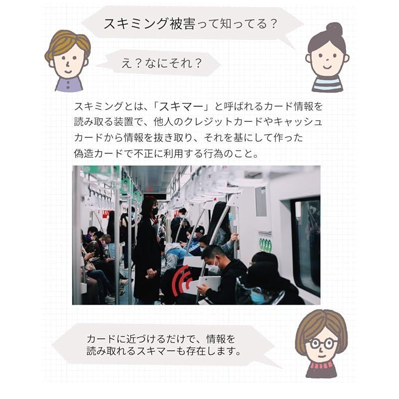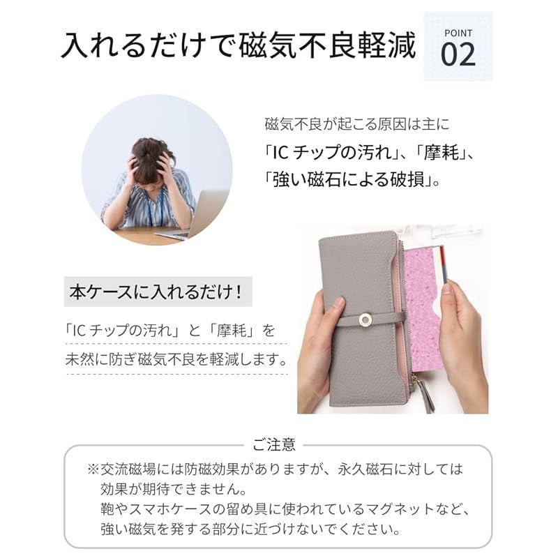 磁気不良軽減 : 磁気不良が起こる原因は主に「ICチップの汚れ」、「摩耗」、「強い磁石による破損」。本ケースに入れるだけで、「ICチップの汚れ」と「摩耗」を未然に防ぎ磁気不良を軽減します。※交流磁場には防磁効果がありますが、永久磁石に対しては効果が期待できません。鞄やスマホケースの留め具に使われているマグネットなど、強い磁気を発する部分に近づけないでください。