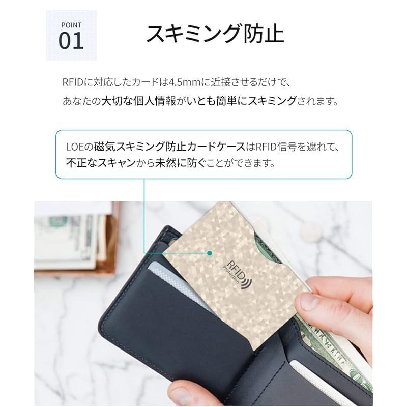 スキミング防止 : RFIDに対応したカードは4.8mmに近接させるだけで、あなたの大切な個人情報がいとも簡単にスキミングされます。LOEの磁気スキミング防止カードケースはRFID信号を遮れて、不正なスキャンから未然に防ぐことができます。