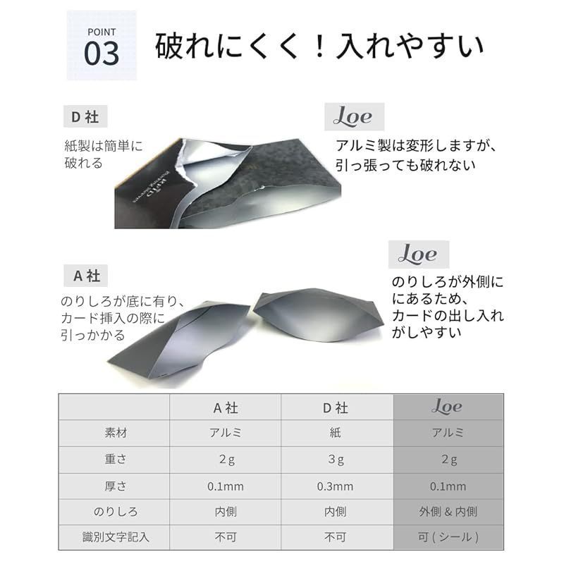 丈夫な素材 : 大手IC専門メーカーとの半年もの共同開発におけるトライアンドエラーから特殊な工法を検討し、さまざまなICカードに対応したスキミング防止カードケースを製品化しました。LOEの極薄カードケースは一般的な紙製と異なり薄くても引っ張っても破れません。