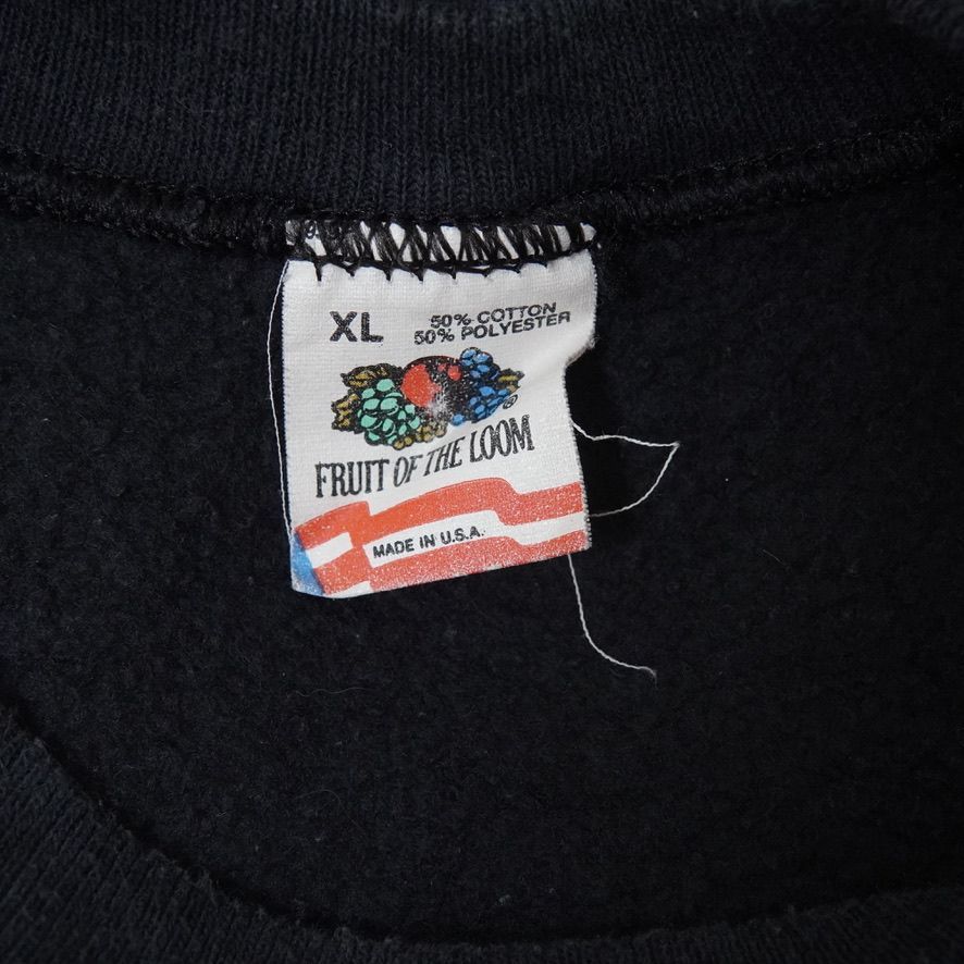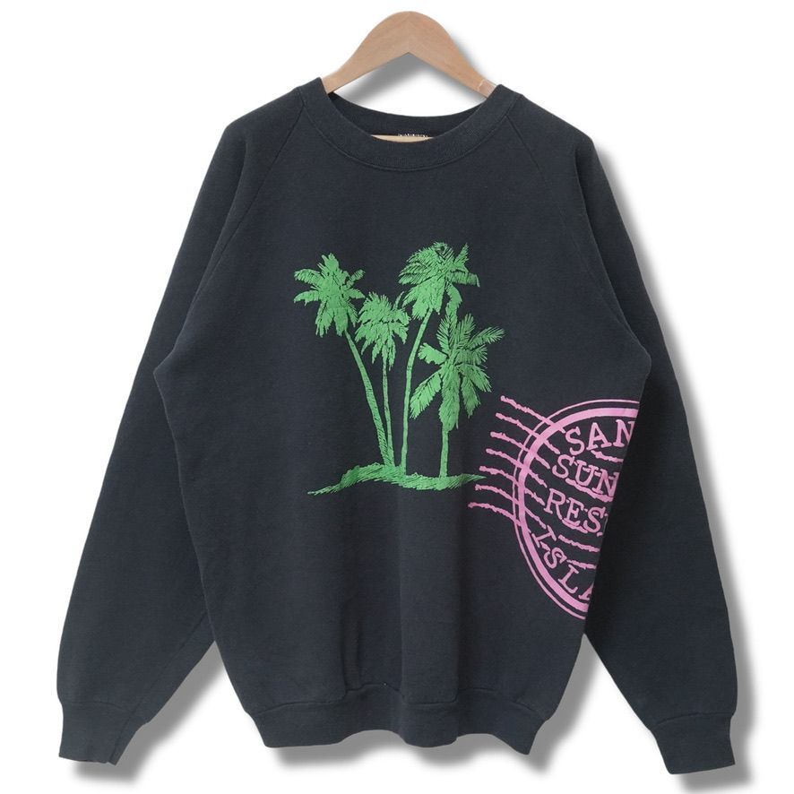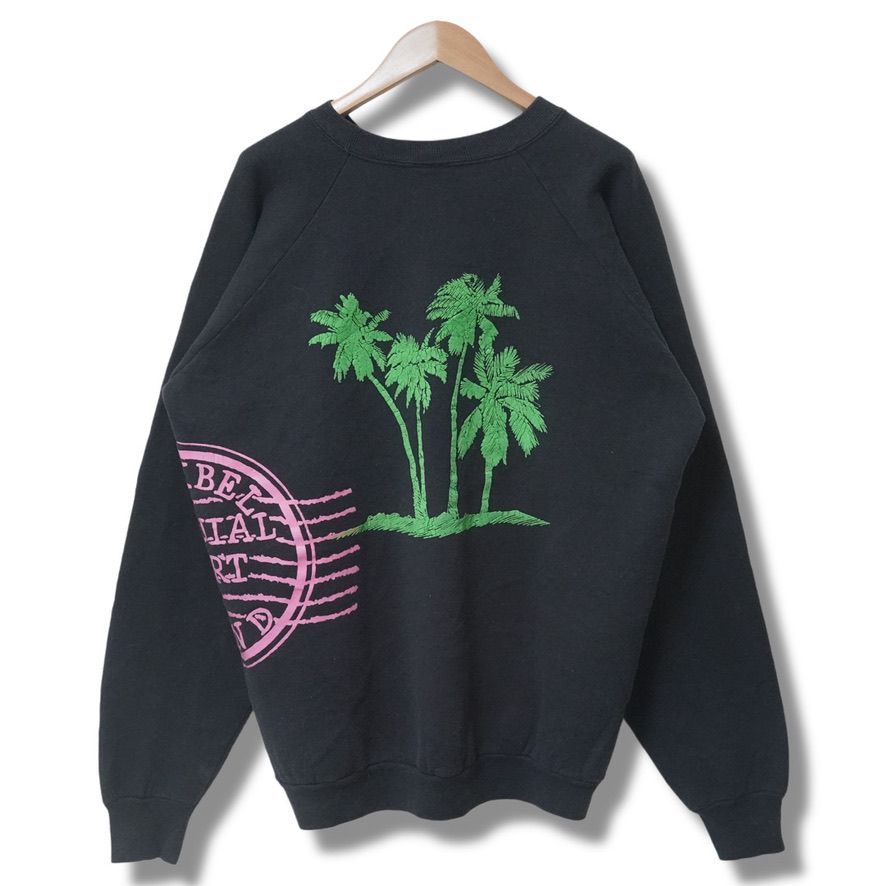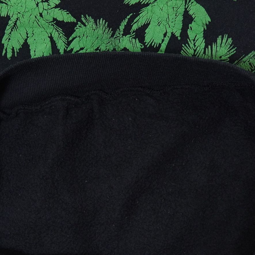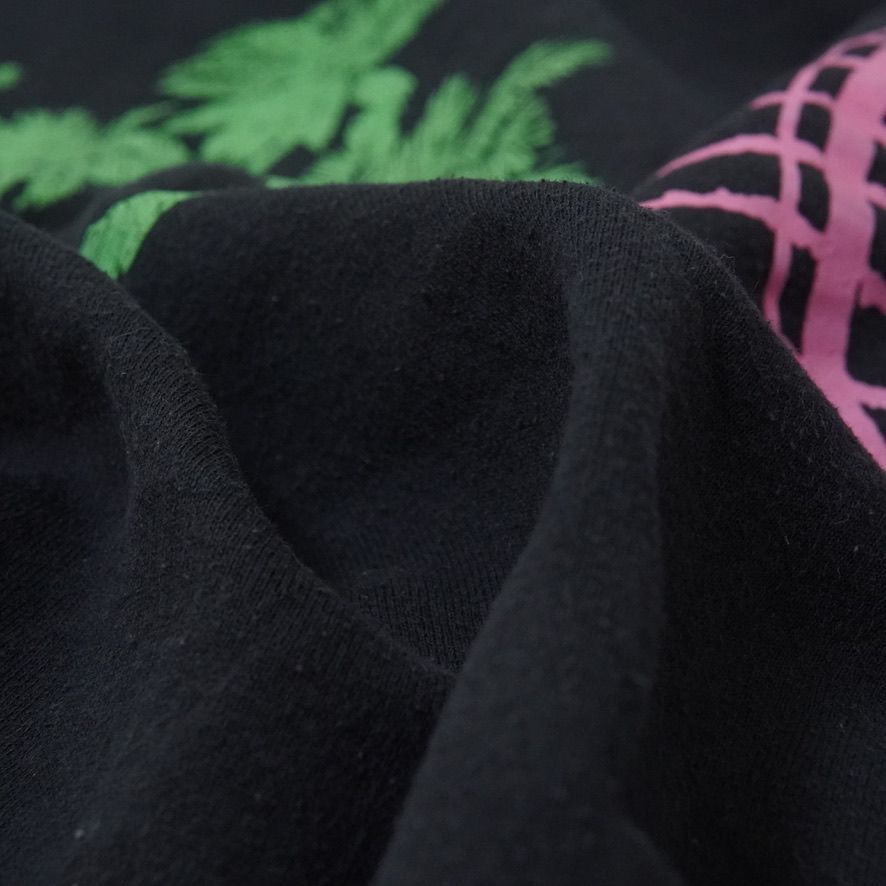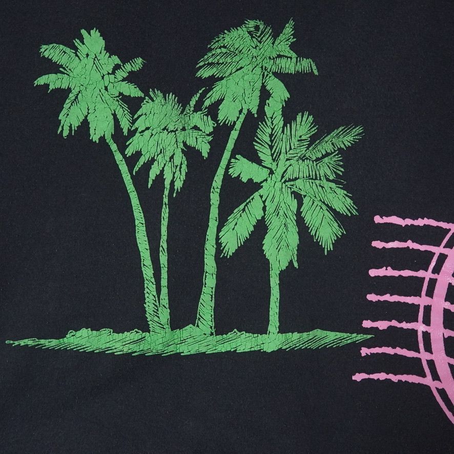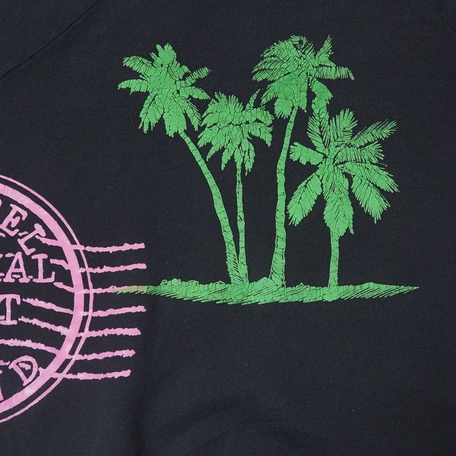 90s、FRUIT OF THE LOOM製のクルーネックスウェット。ブラックのボディに、南国ムード漂うグリーンのヤシ刺繍と、ピンクのスタンプ風プリントが前後に大胆に配置された一着。
